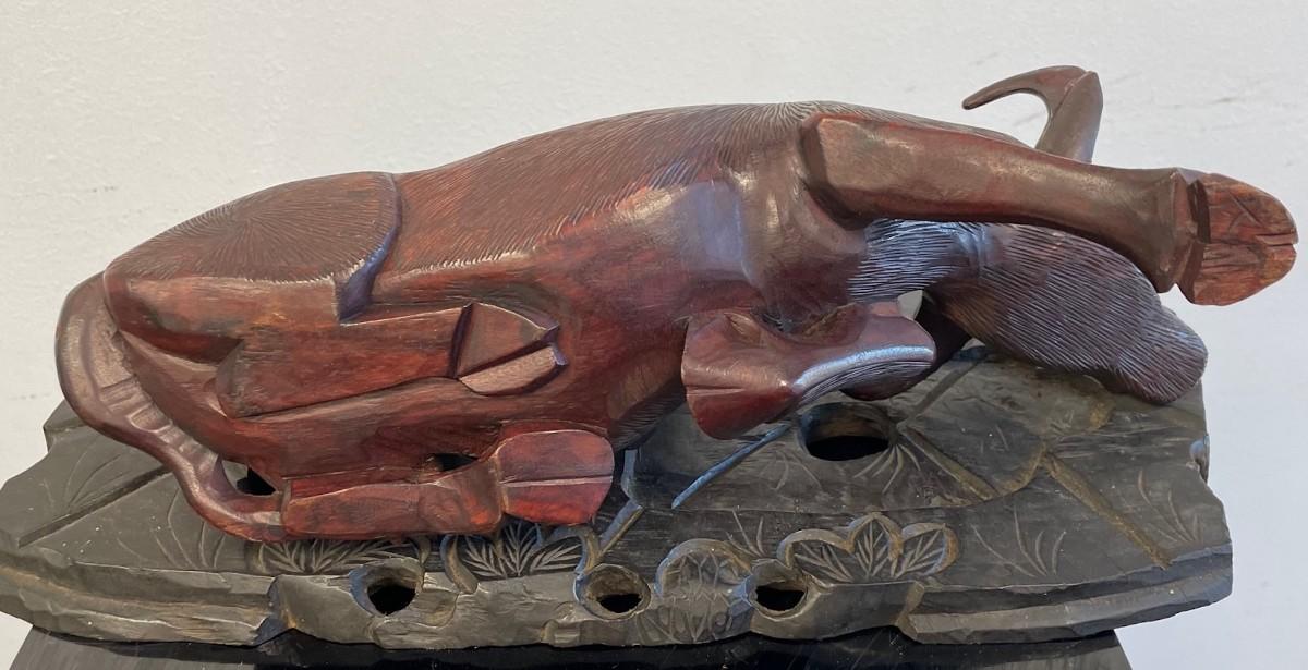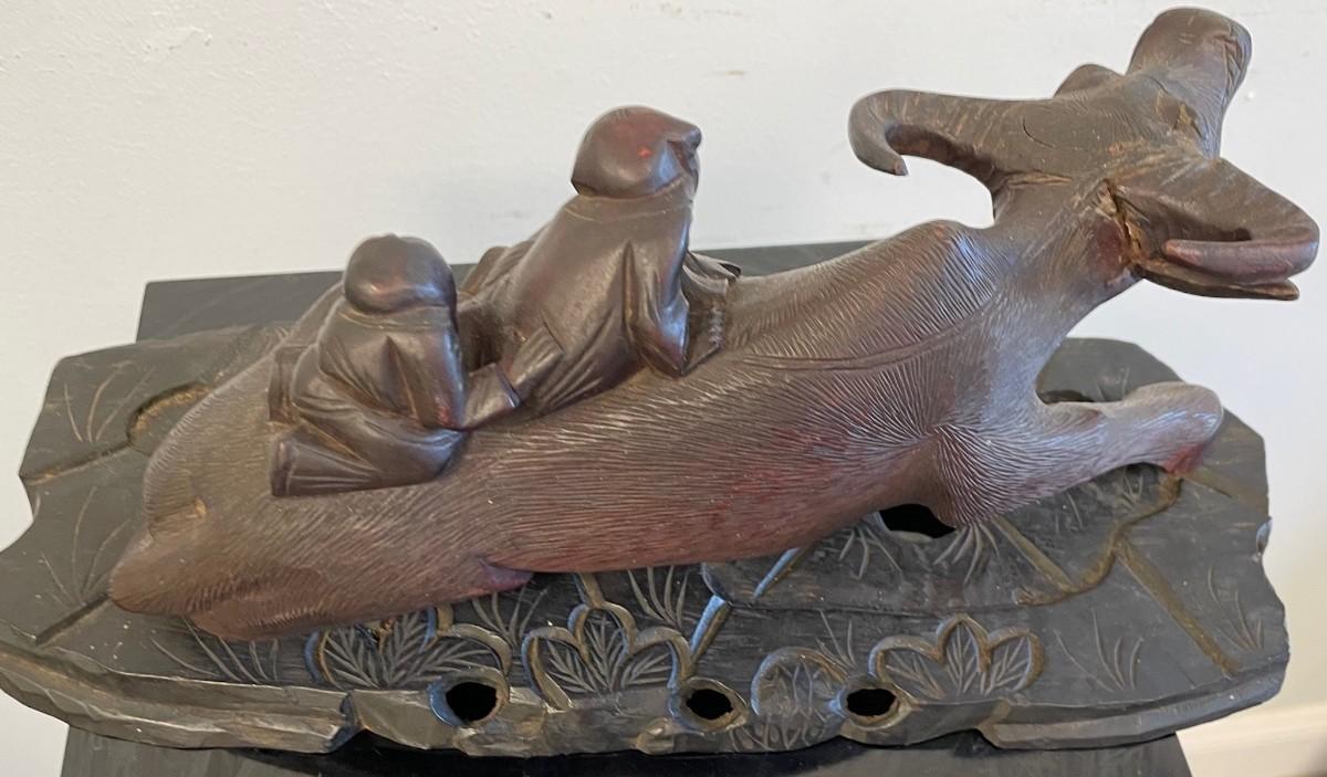 Description: Antique Chinese Carved Wood Buffalo carrying two male Figurine; Measurement approximate: 11"l x 4.5"h; Material: Wood