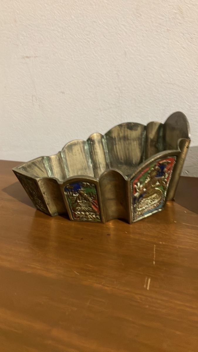 This charming pair of mid-20th century Chinese cloisonné enamel metalware items exemplifies the vibrant artistry of traditional Beijing enamel techniques, featuring intricate hand-applied wirework cells filled with colorful enamels and fired for a glossy finish. The smaller lidded vessel, of hexagonal form with a domed cover, stands approximately 3.5 inches high and measures 4 inches across, adorned with vivid polychrome panels depicting auspicious motifs such as mythical beasts (possibly qilin or dragons), floral scrolls, and landscape elements against a rich blue and turquoise ground, accented by gilt edges and brass detailing. The base bears an impressed "CHINA" mark in block capitals, typical of export pieces from the Republican era. Companioning it is a larger scalloped-edge bowl, roughly 6 inches long by 4.5 inches wide and 2-3 inches deep, with undulating petal-form lobes enclosing enameled scenes of birds amid blooming peonies and lotus, rendered in brilliant reds, greens, yellows, and blues on a metallic ground, also marked "CHINA" on the underside. Both pieces showcase the labor-intensive cloisonné process, where silver or brass wires outline designs before enamel inlays are fused and polished, creating enduring decorative appeal for collectors of Asian export art. Condition is generally good with expected minor wear to enamels from age and use; however, the lidded vessel's cover exhibits some visible dents, which may affect handling but do not detract significantly from the overall patina. Ideal as a matched set for display on a mantel or étagère, evoking the opulence of Qing-inspired craftsmanship adapted for Western markets.