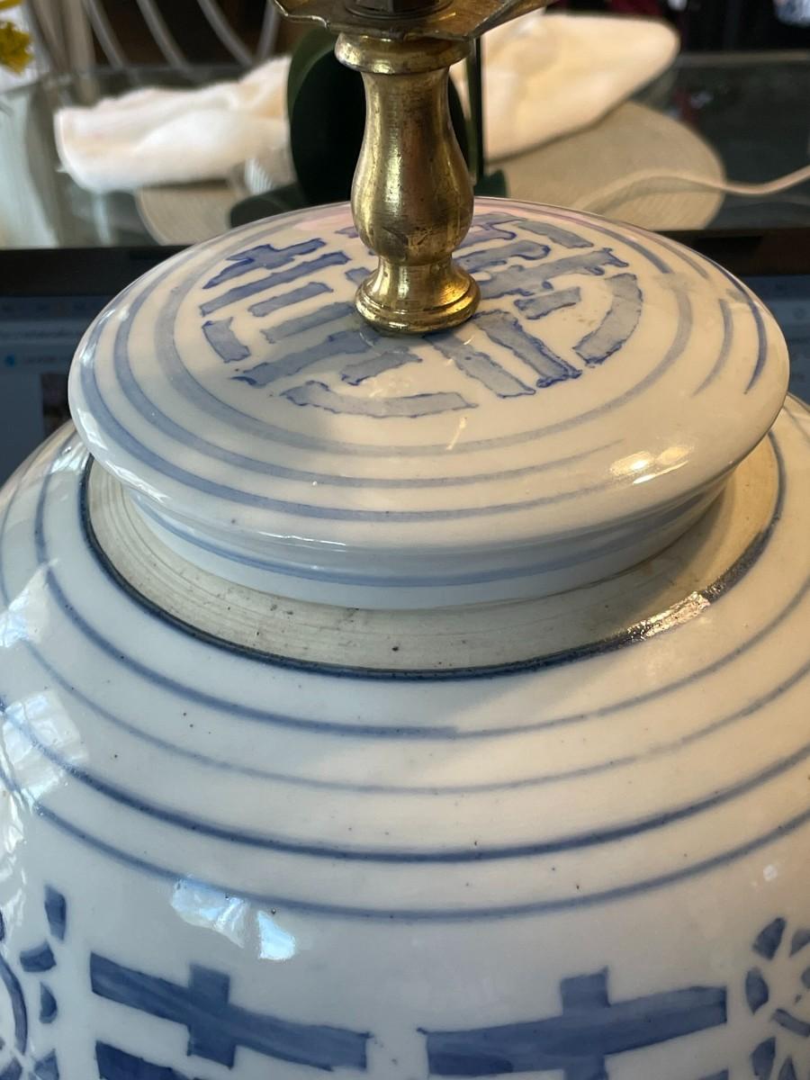 Antique Chinese Double Happiness Blue & White Ceramic Ginger Jar Lamp 12" Tall to the Top of the Jar w/Lid in VG Condition. (No Shade or Lamp Hardware). $20 Domestic Shipping.