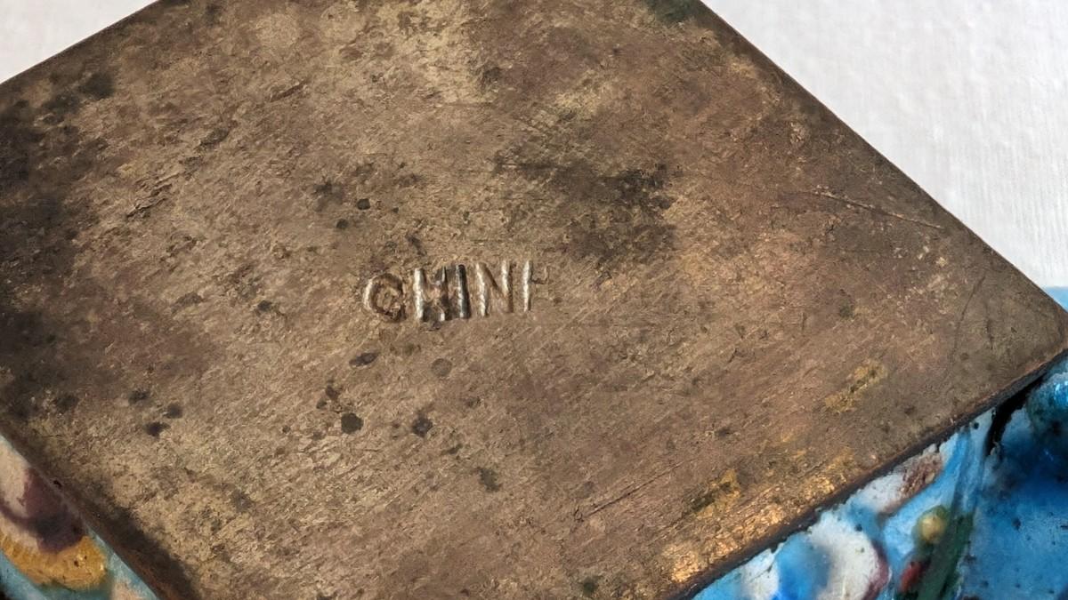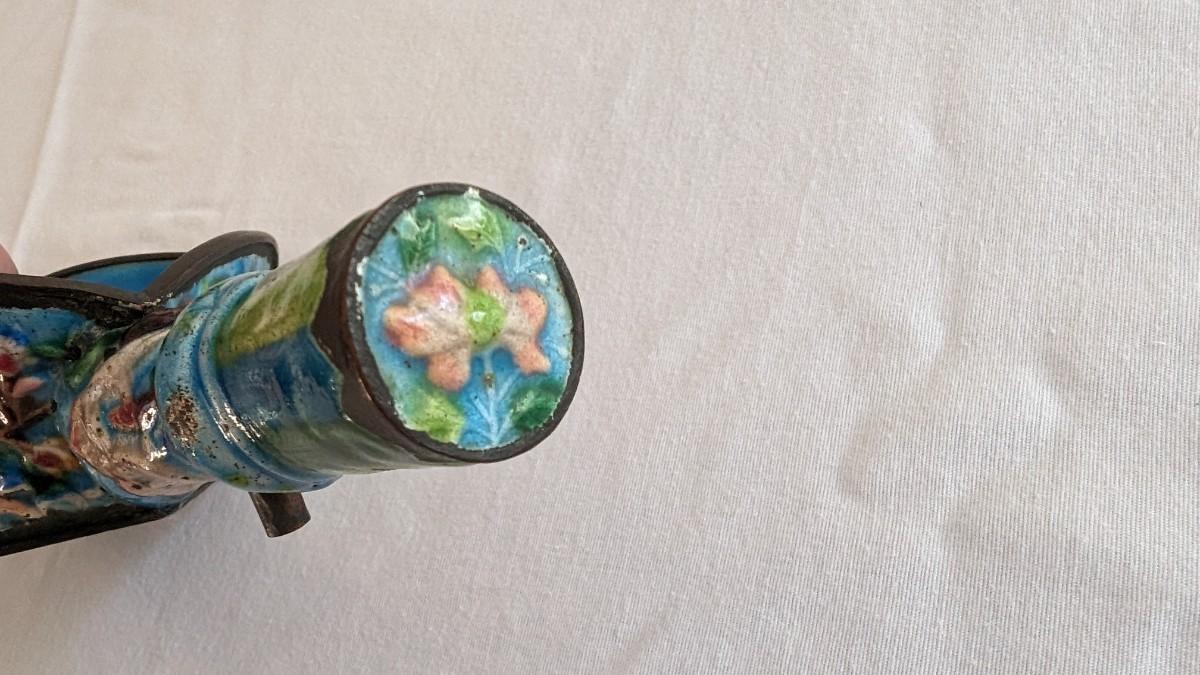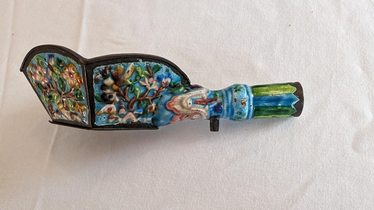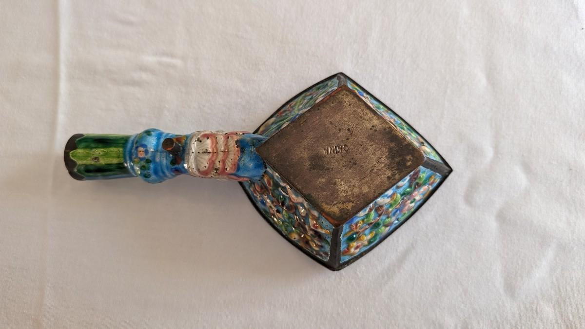 This is a beautiful metal antique silk iron enameled cloisonne. Approximately 7.5" long with a diamond shaped bowl.