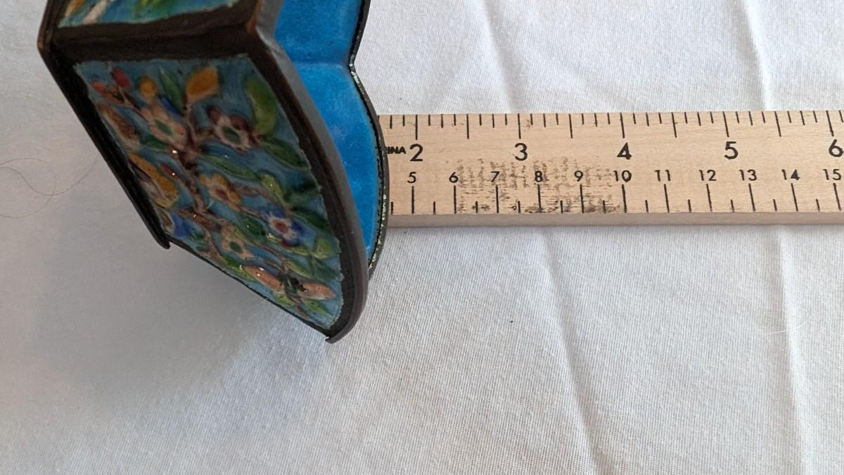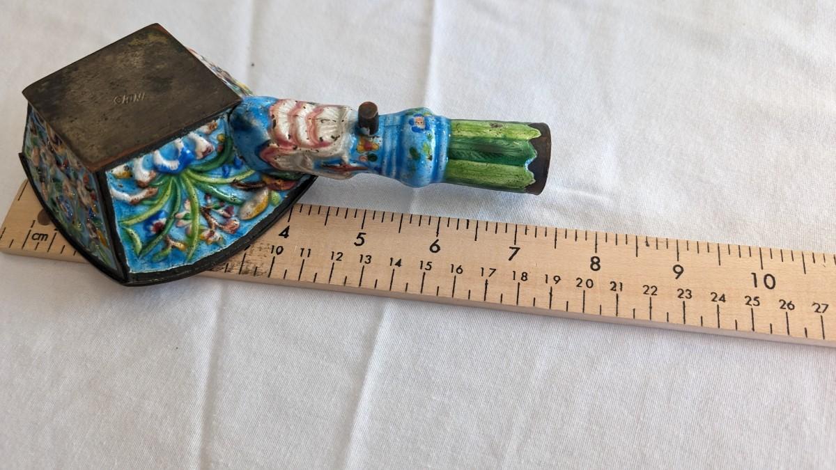 This is a beautiful metal antique bath water dipper enameled cloisonne. Approximately 7.5" long with a diamond shaped bowl.