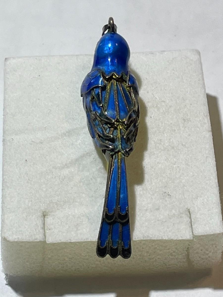 Antique Chinese Export Jade Cocoon Blue Bird Enamel Pendant Gilded Silver Colorful Enamel ~ Detail oriented, incredible workmanship, enamel all intact, over Gilded silver wings, eyes, Layered Wings ~ Pretty Color of Blue/Enamel. The Body is Pale Green (natural) Jade, Pendant measures Approx 2-inch drop length bail included. Bail is marked Silver. $5 Domestic Shipping.