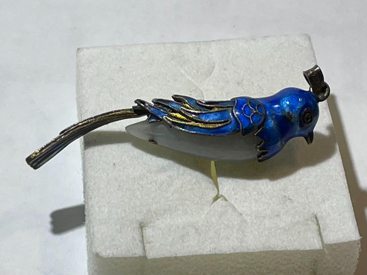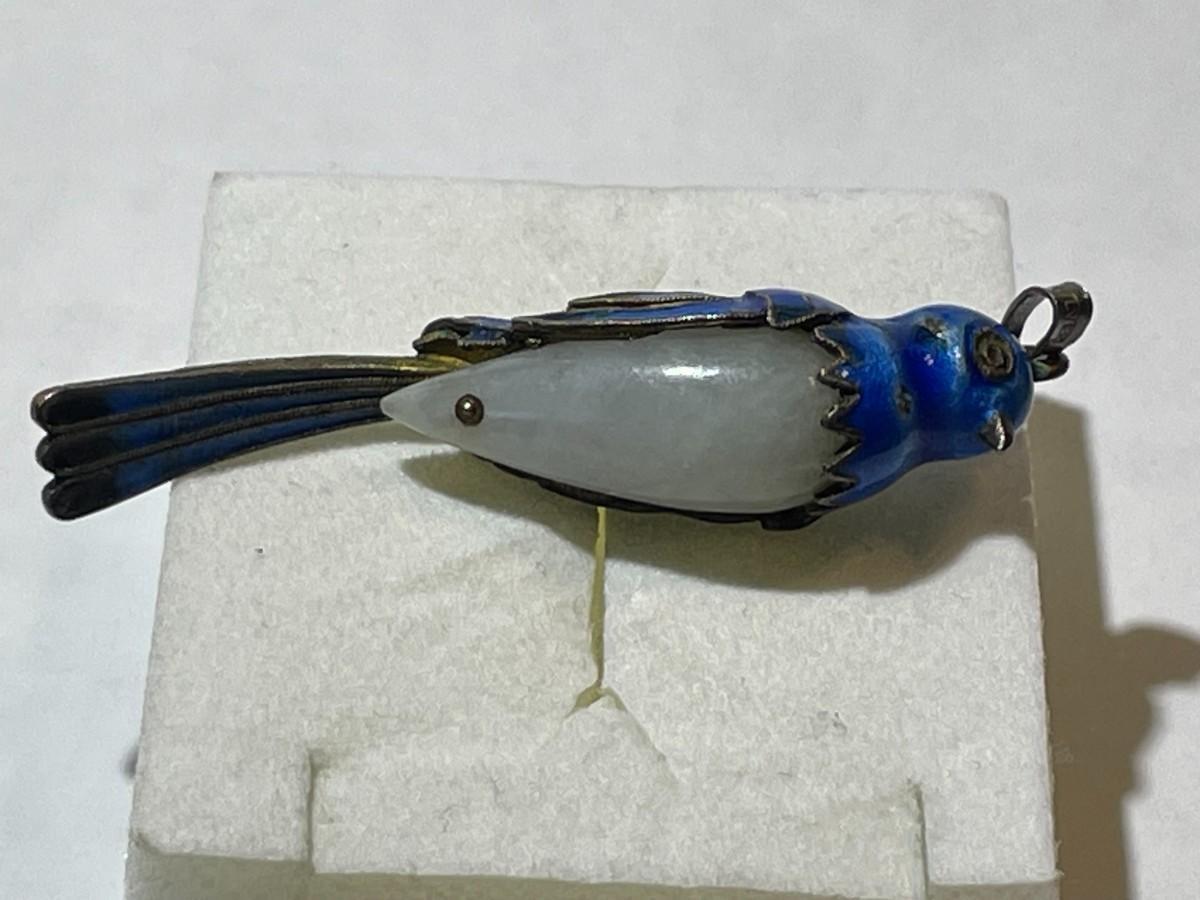 Antique Chinese Export Jade Cocoon Blue Bird Enamel Gilded Silver Pendant in VG Preowned Condition