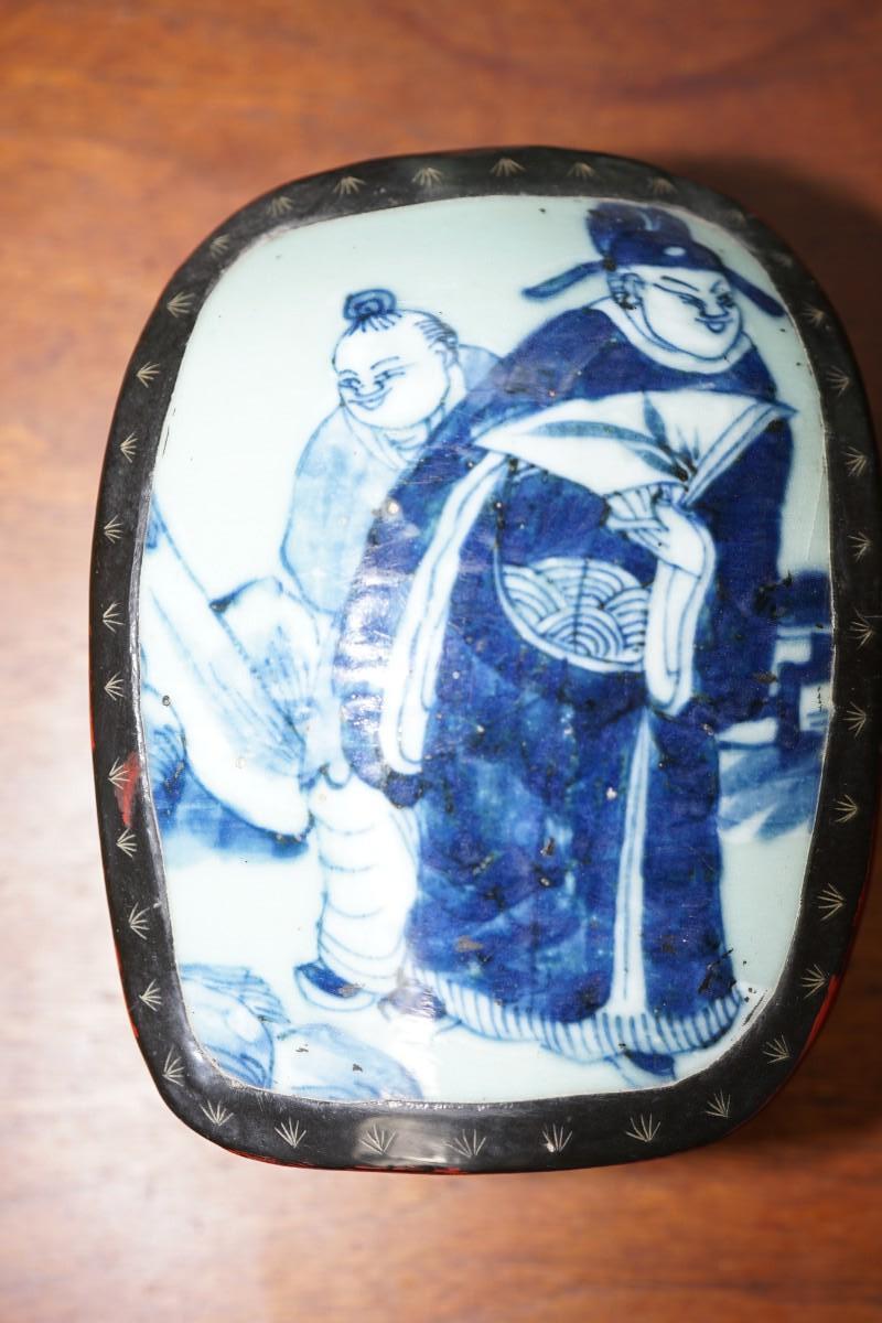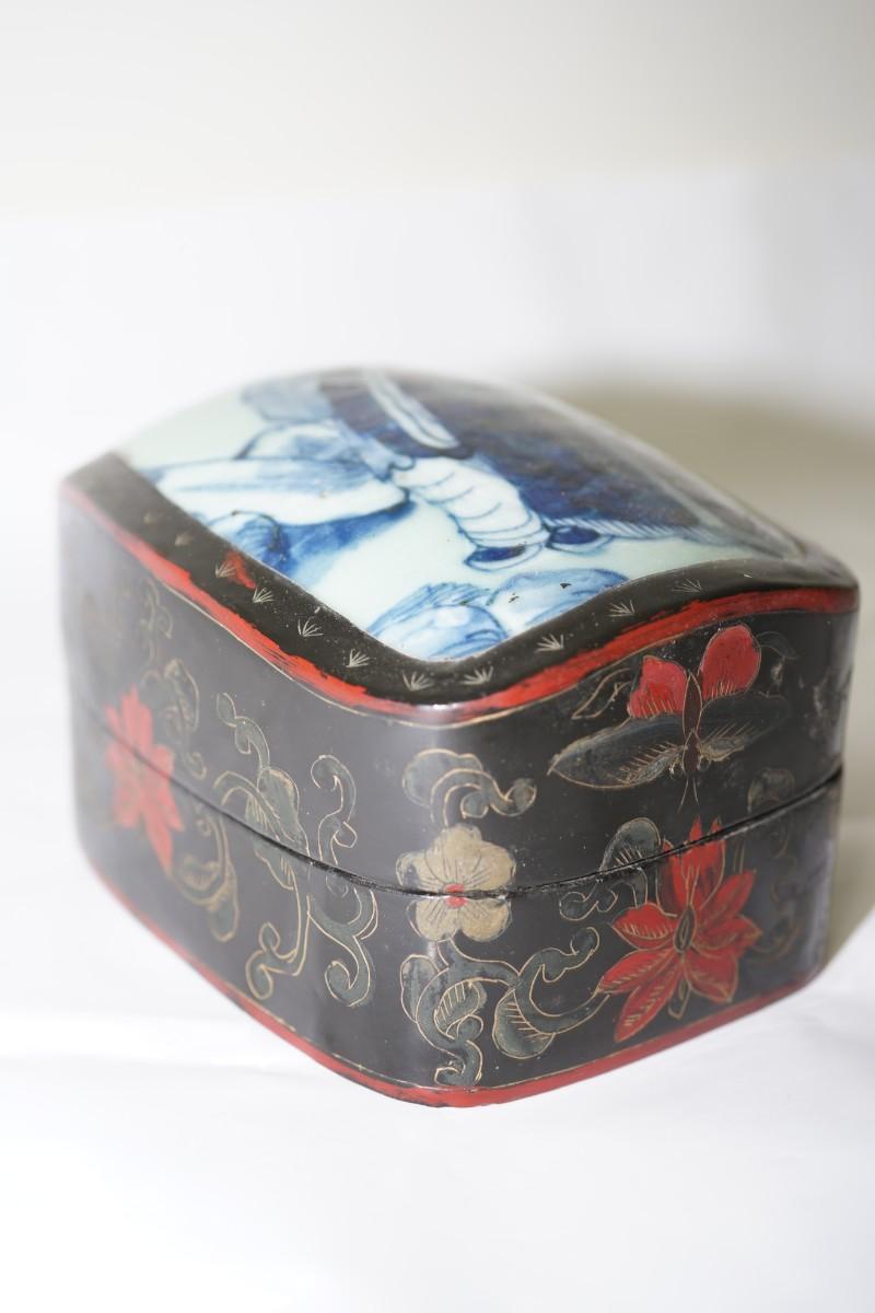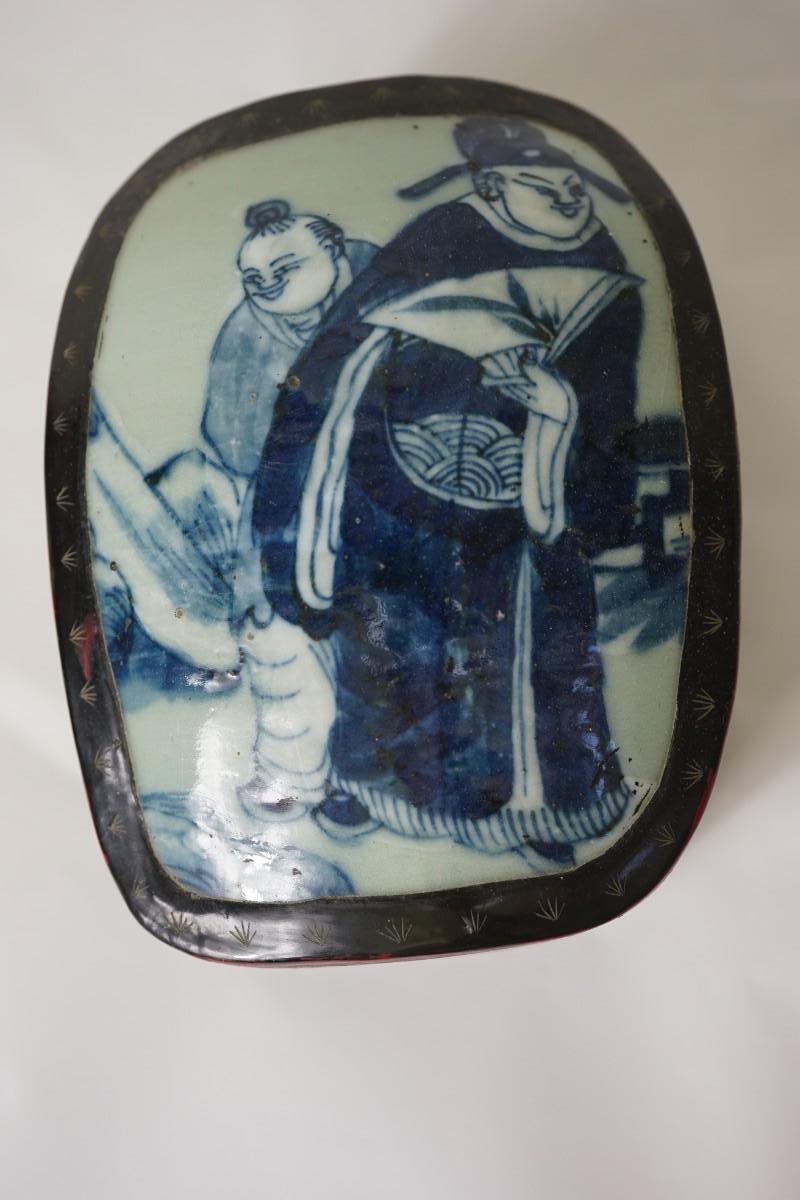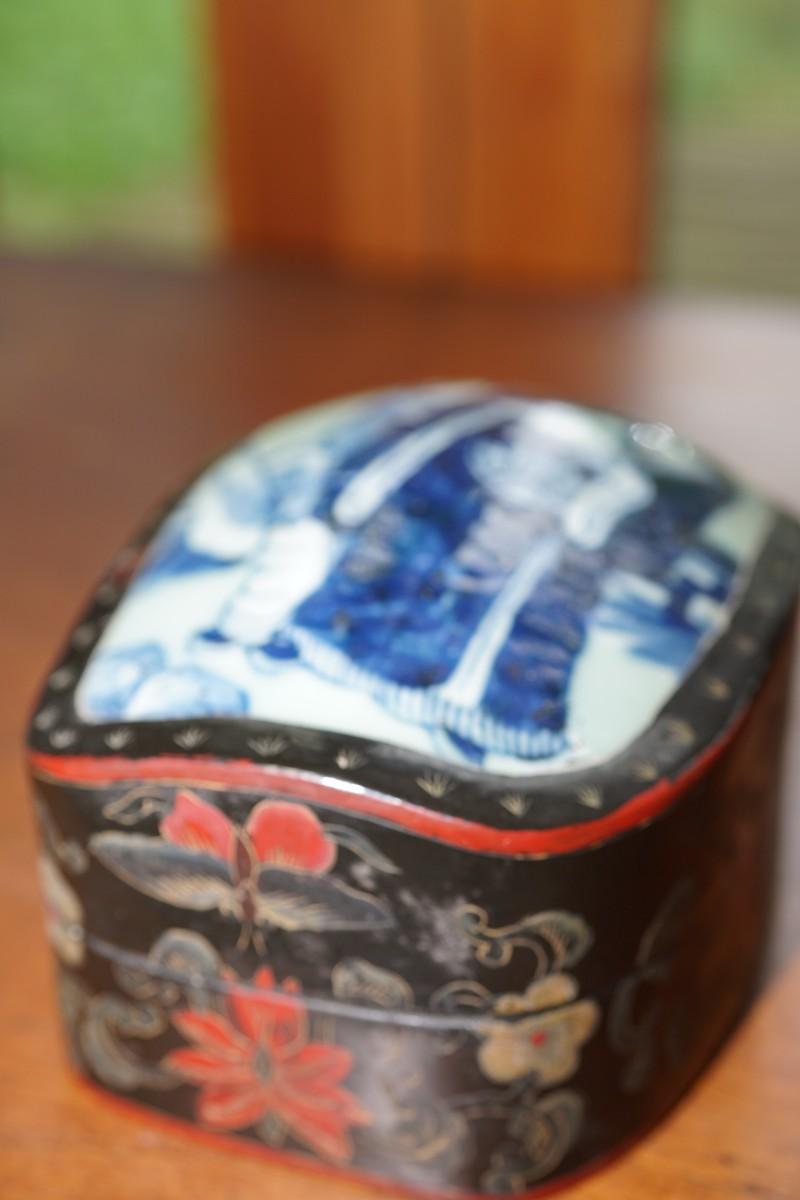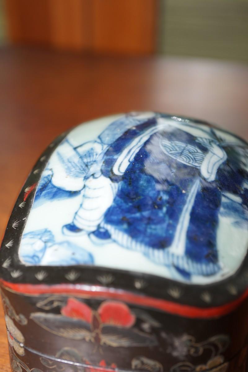 ANTIQUE CHINESE LACQUER OVAL BOX W/ DECOR AROUND THE SIDES AND CHARACTERS OF BLUE AND WHITE ON THE LID,