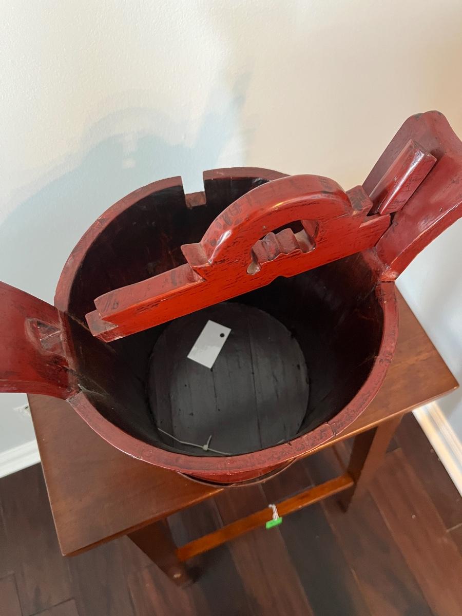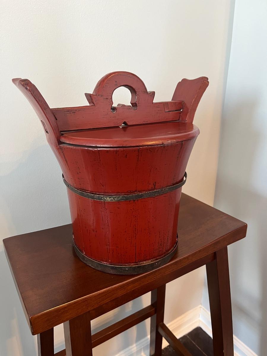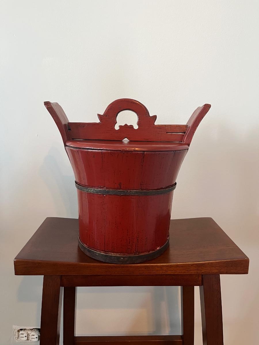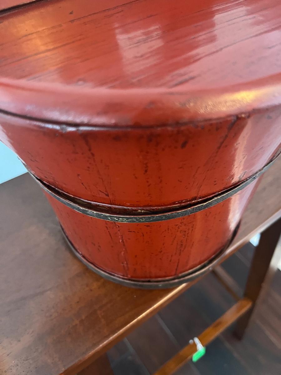 This is a late 19th century red lacquered Shangyu rice bucket. There is one loose hoop, but otherwise in good condition.