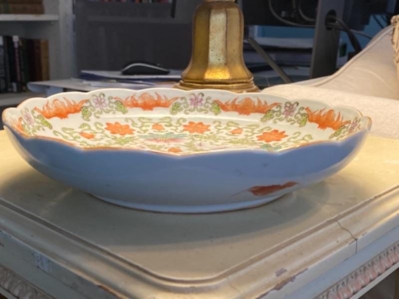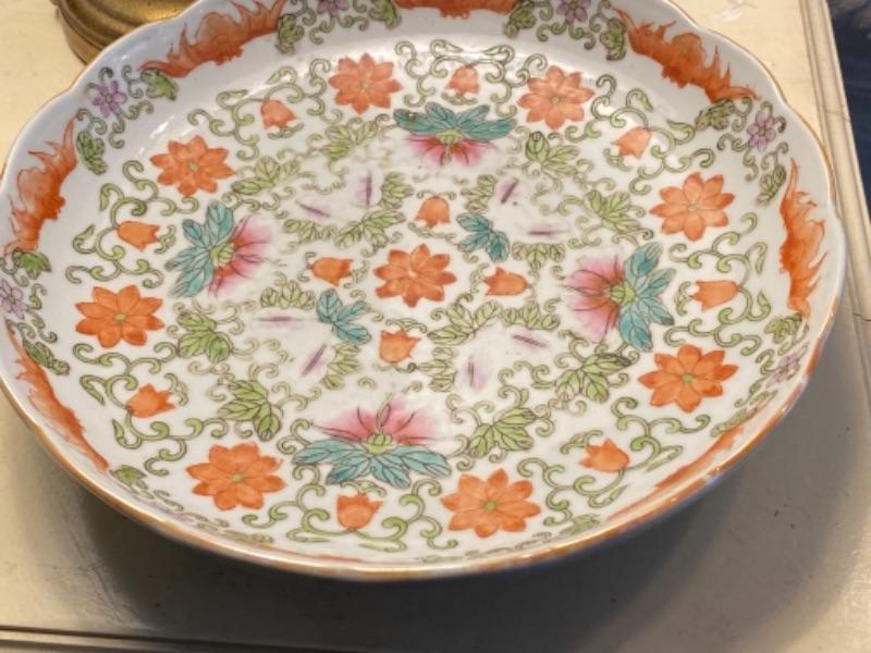 Two Lovely old Chinese scalloped plates in famille rose handpainted decoration with handpainted pink and aqua leaf lotus flowers with orange flowers with orange red bats along rim and outside “” classic pattern. Daoguang mark.