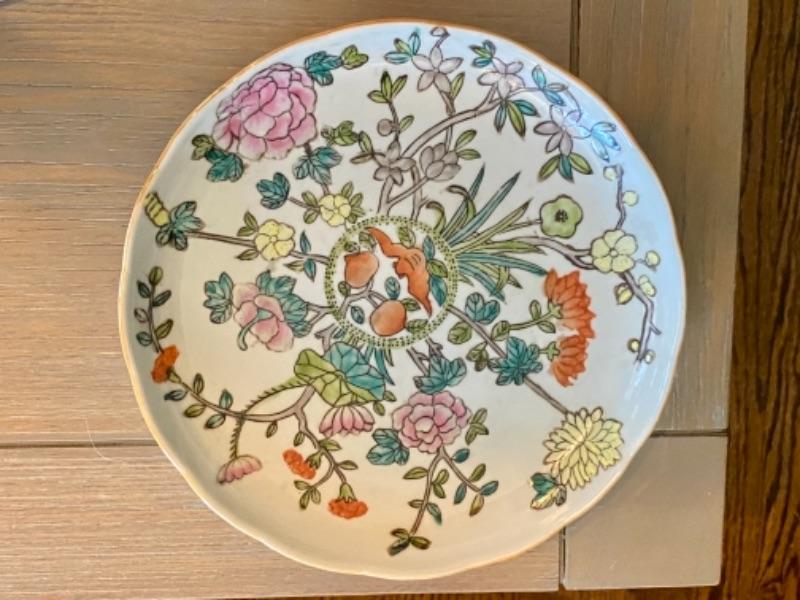 Pair Antique Chinese Porcelain Famille Rose  raised rim plates Lotus Bat