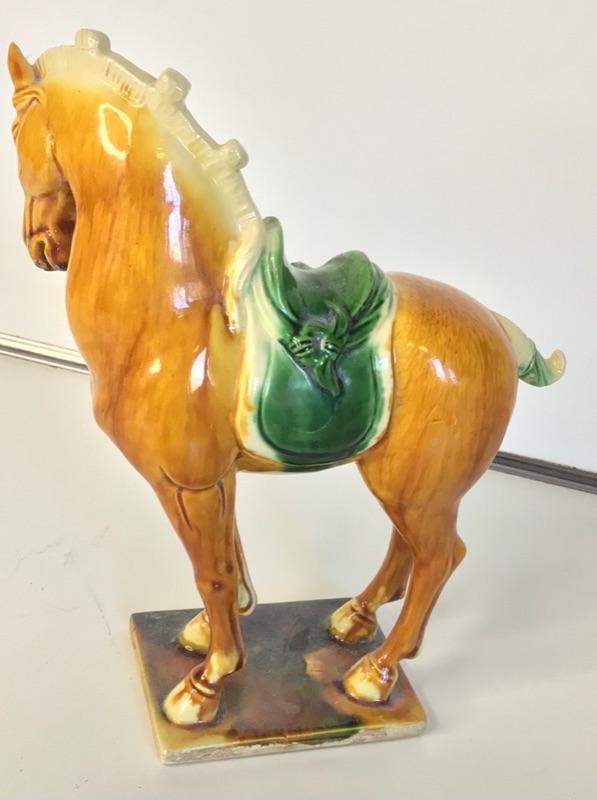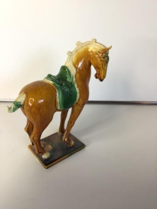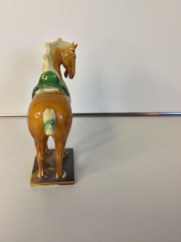 Nice marked Tang horse with lovely coloration in greens and auburn. Measures 7” tall, 7” long. It does appear to have line on inner tail , may be repair.