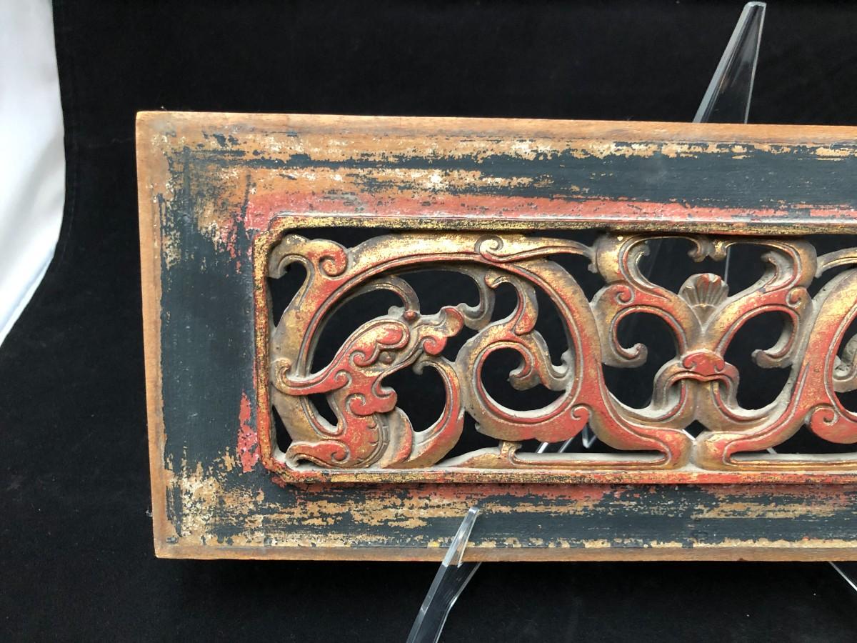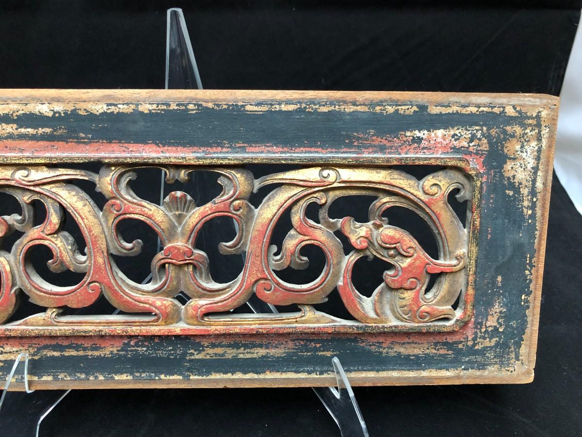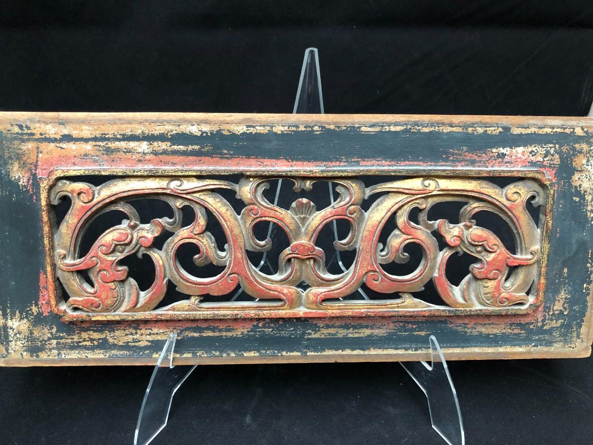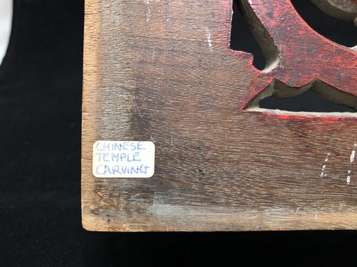 Beautiful antique Chinese temple wall panel carving. Has remnants of original red, black, and gold paint. In very good condition.