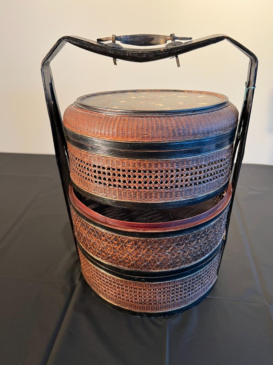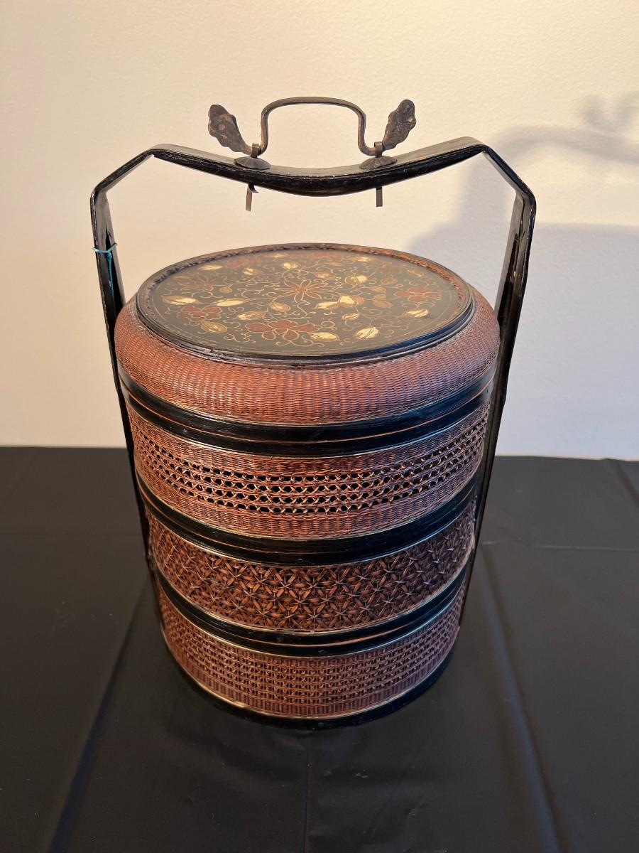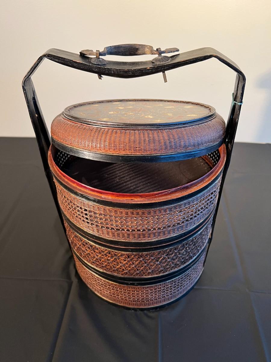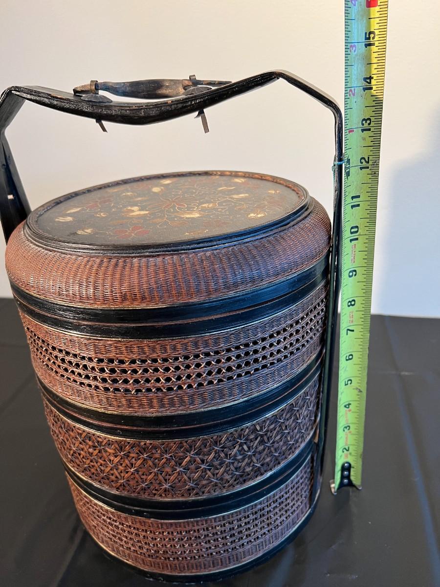 Beautiful and detailed antique Chinese wicker wedding basket with three tiers. The wicker is in very good condition, with a reddish color hue. The woof framing and handles on the exterior are painted black, and the lid has a black background with red and gold hand painted flowers. Beautiful wood inside the baskets. Condition as shown in photos.
