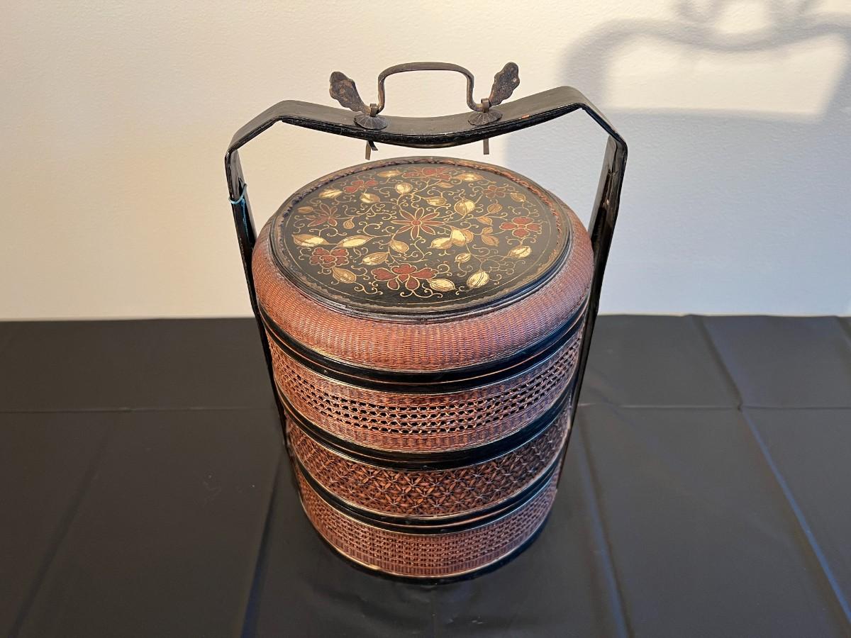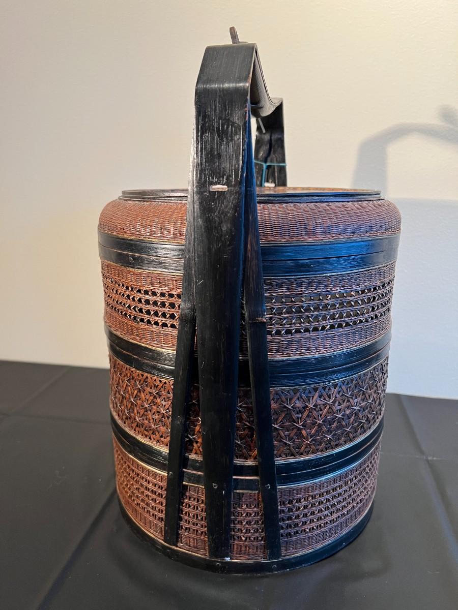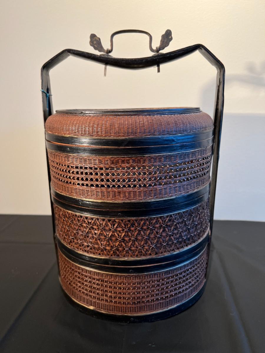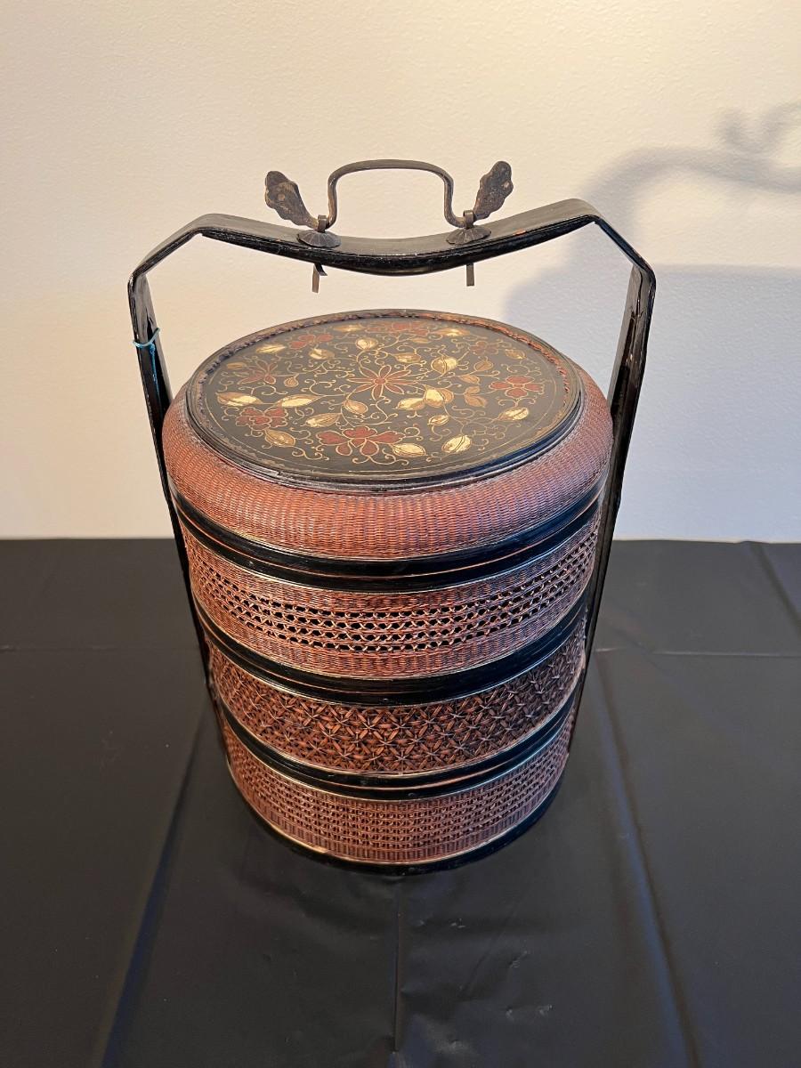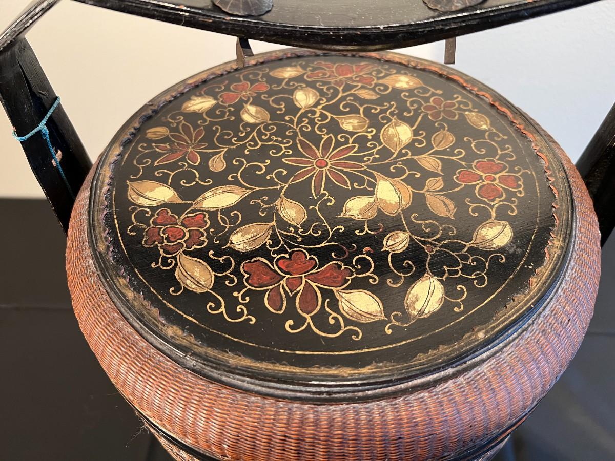 Beautiful and detailed antique Chinese wicker wedding basket with three tiers. The wicker is in very good condition, with a reddish color hue. The woof framing and handles on the exterior are painted black, and the lid has a black background with red and gold hand painted flowers. Beautiful wood inside the baskets. Condition as shown in photos.
