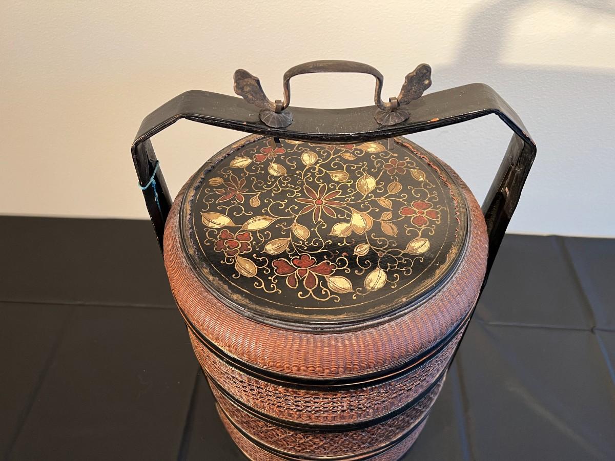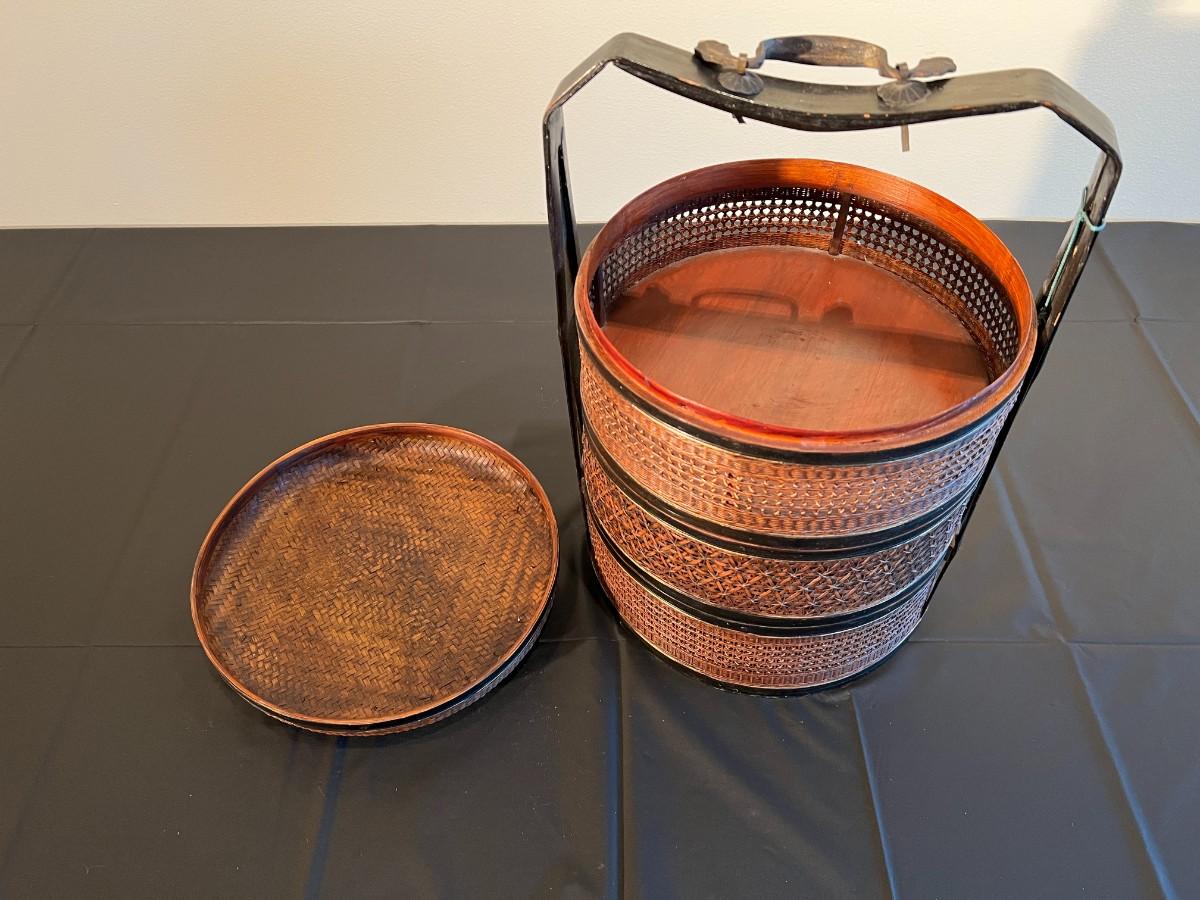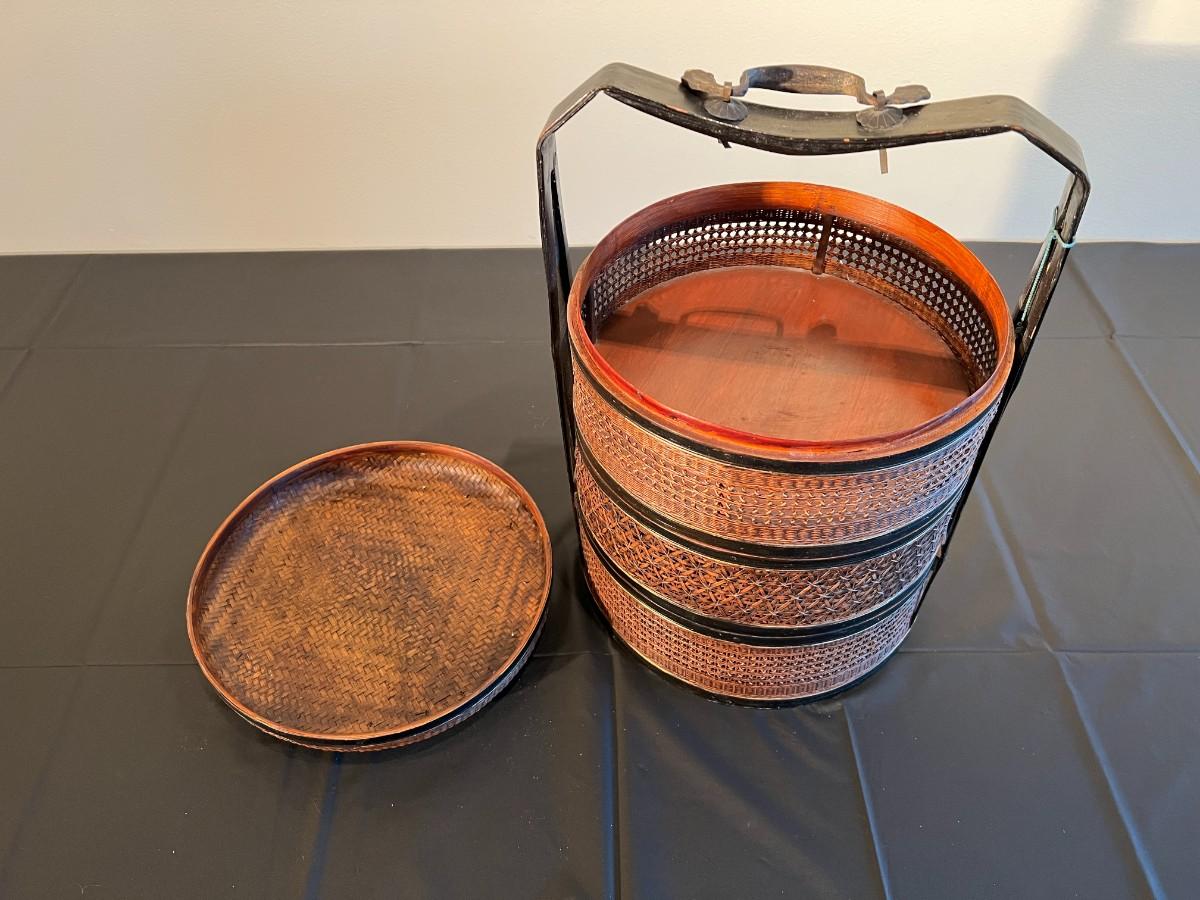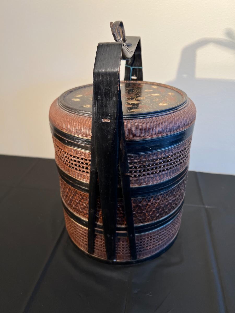 Beautiful and detailed antique Chinese wicker wedding basket with three tiers. The wicker is in very good condition, with a reddish color hue. The woof framing and handles on the exterior are painted black, and the lid has a black background with red and gold hand painted flowers. Beautiful wood inside the baskets. Condition as shown in photos.