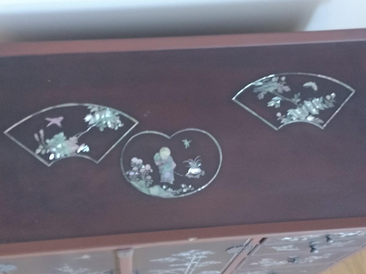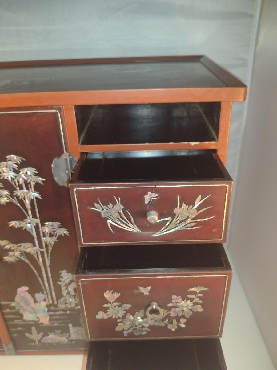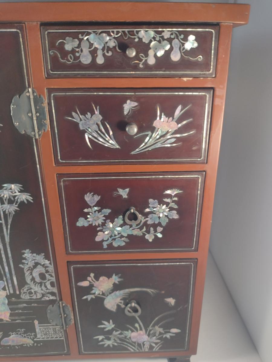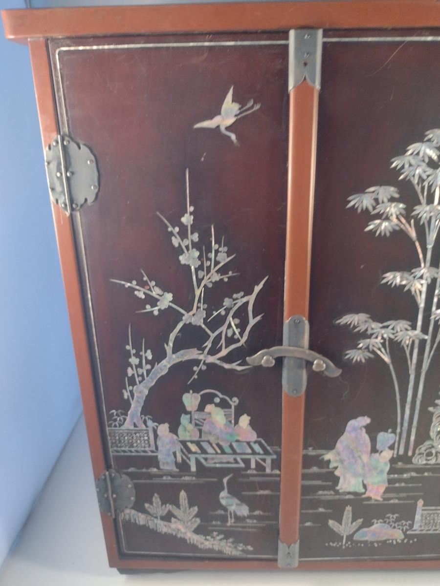 Antique Chinese Wooden Storage Box with Mother of Pearl Inlay- Approx 17 1/2" x 8 3/4" x 16" Tall. Back is drilled for possible wall hanging. One foot/leg needs repair- please see all pictures for condition.