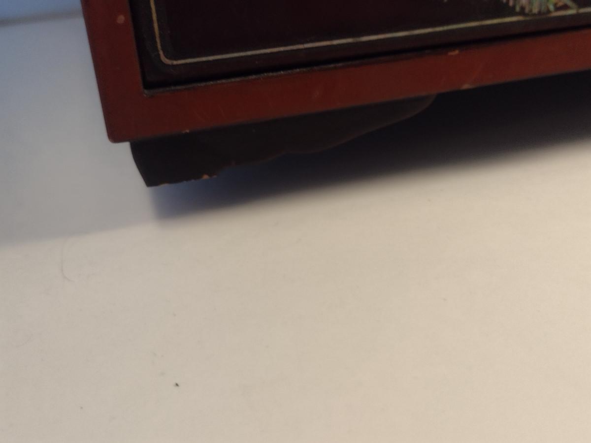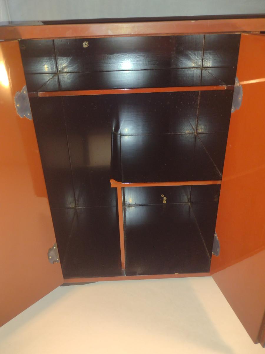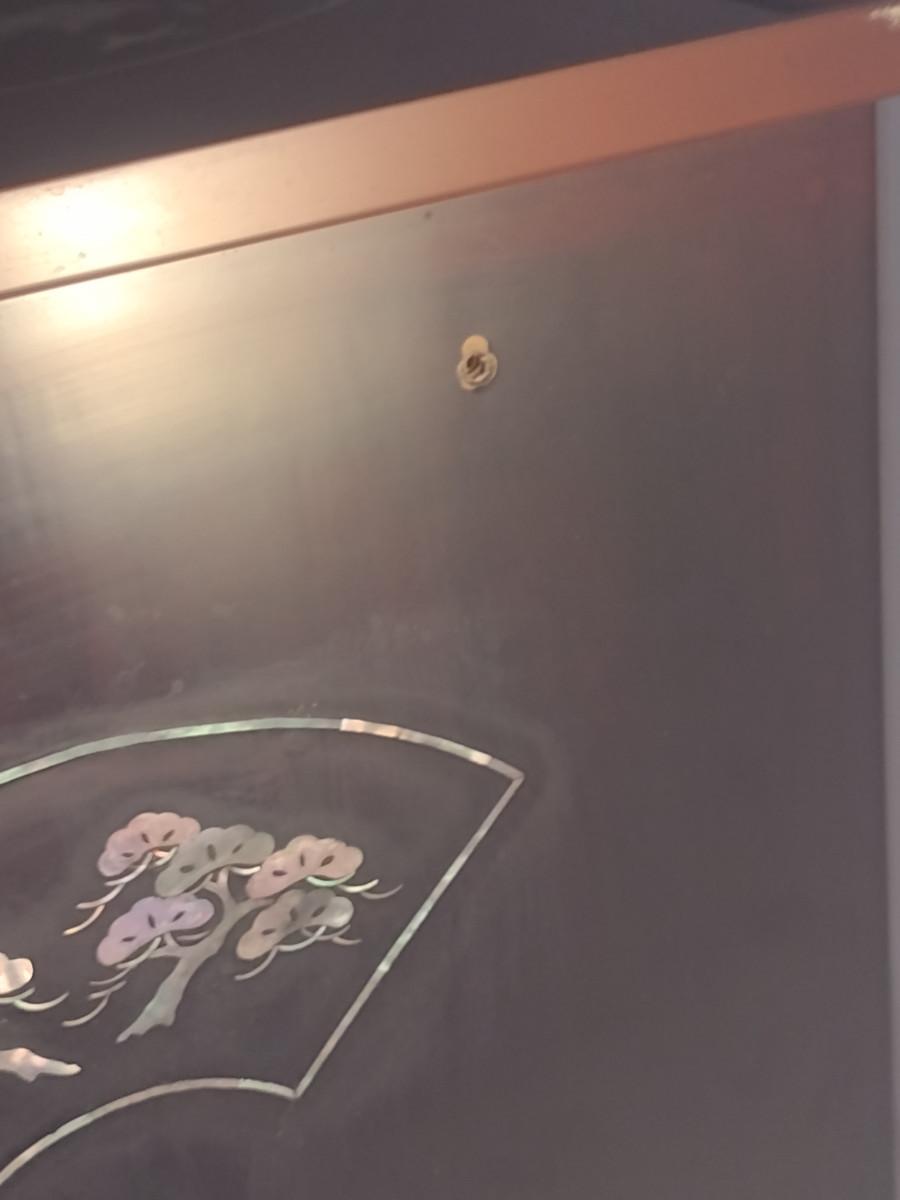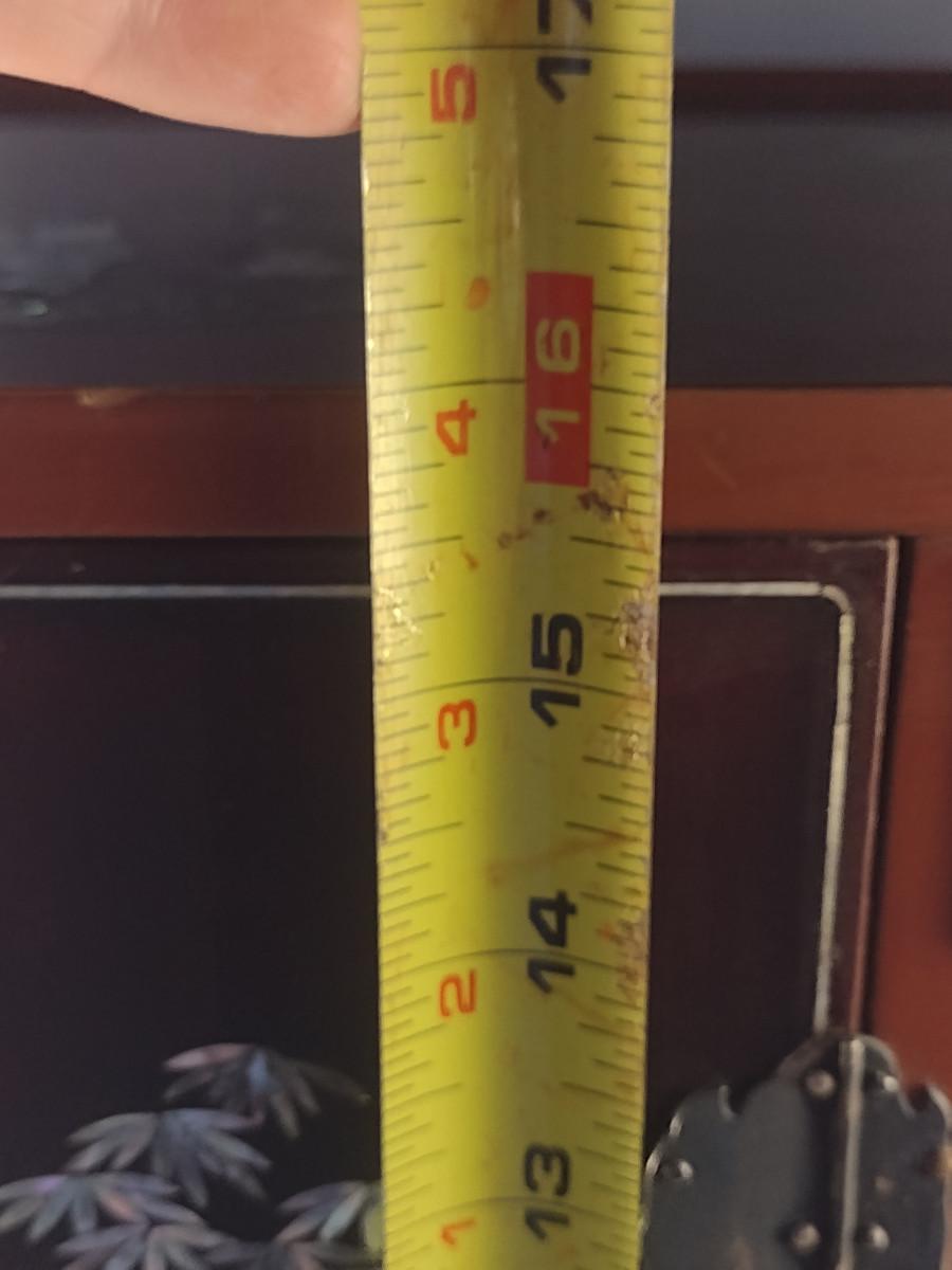 Antique Chinese Wooden Storage Box with Mother of Pearl Inlay- Approx 17 1/2" x 8 3/4" x 16" Tall. Back is drilled for possible wall hanging. One foot/leg needs repair- please see all pictures for condition.