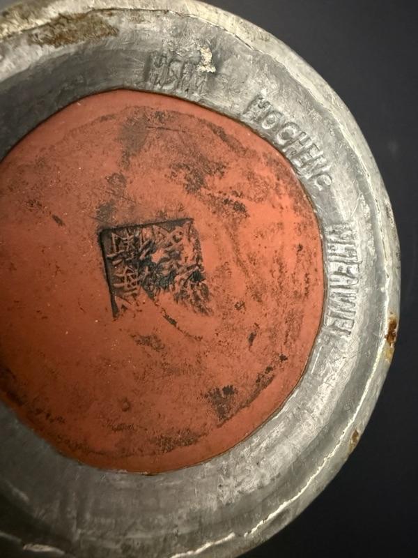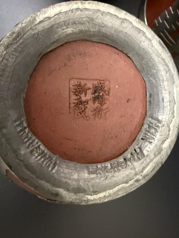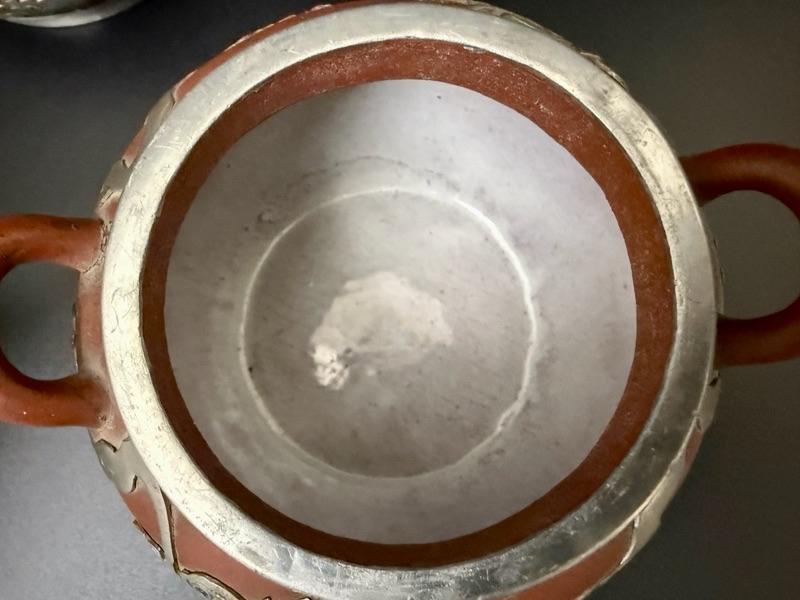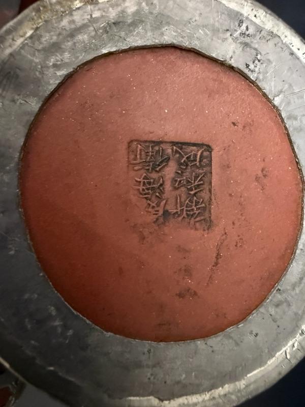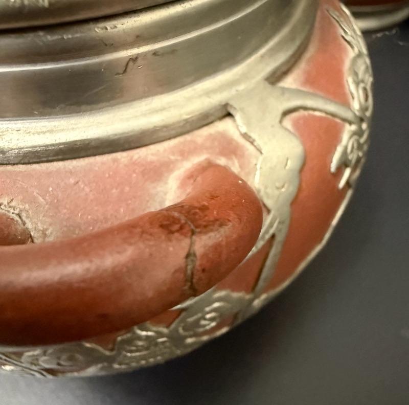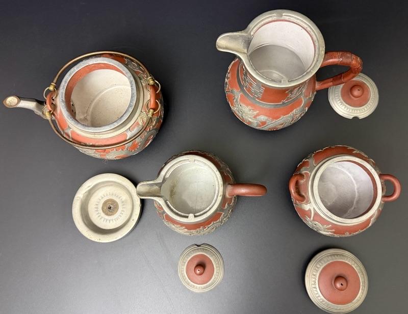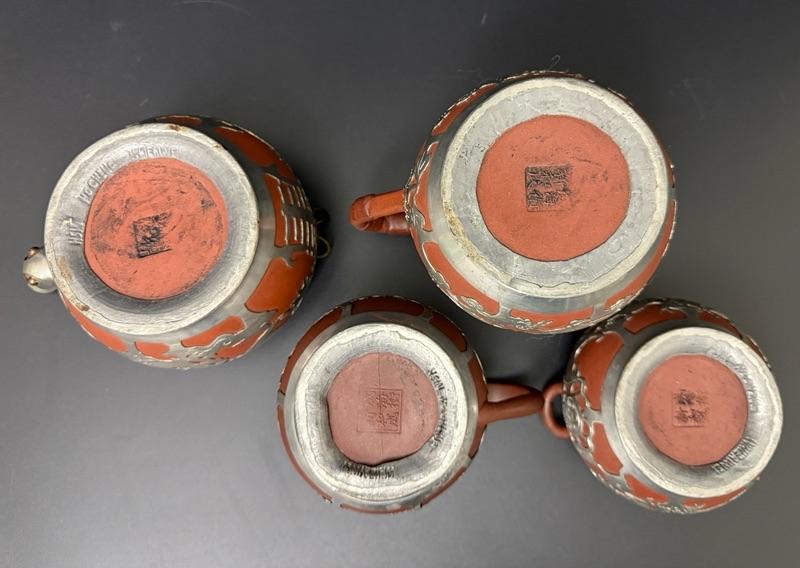 Antique Chinese Yixing Teapot Set of 4 - Unglazed reddish-brown clay Stoneware & Pewter