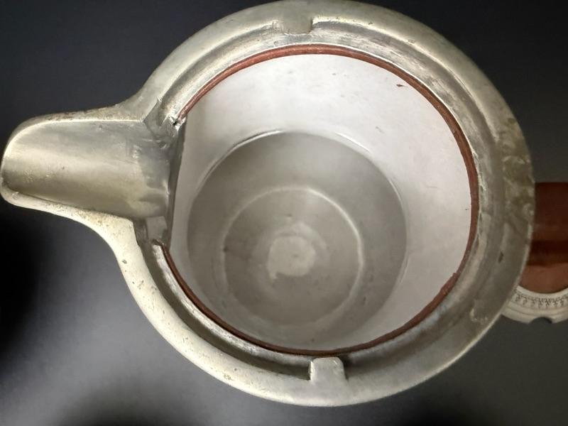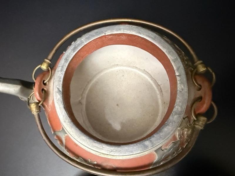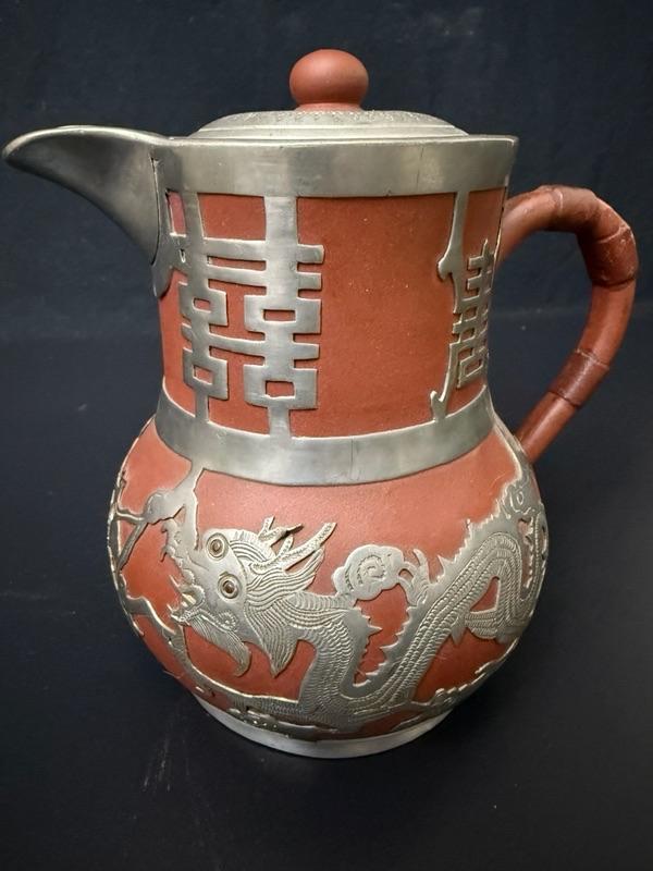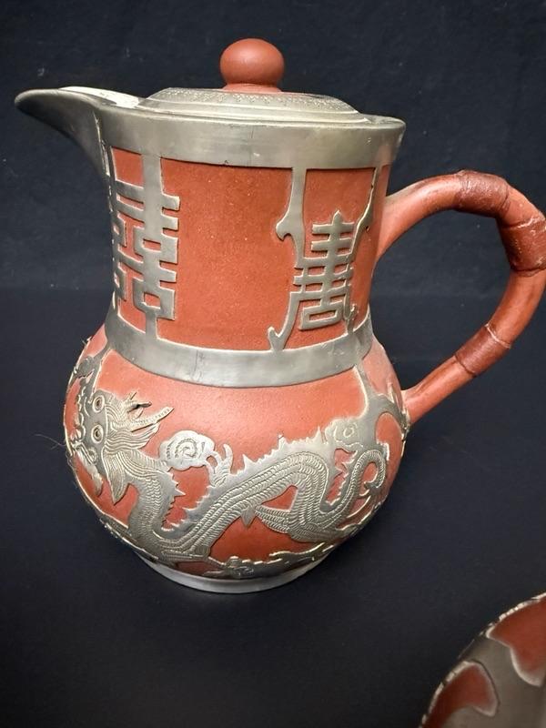 Wonder set of Chinese Yixing Clay & Pewter Tea set with tall server, short server, sugar bowl and heating pot.