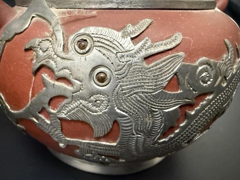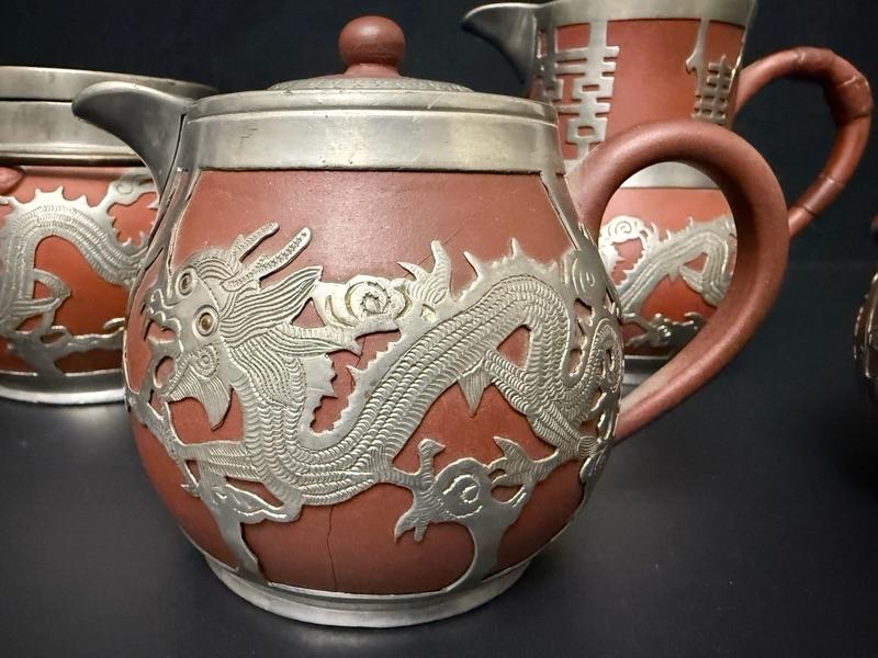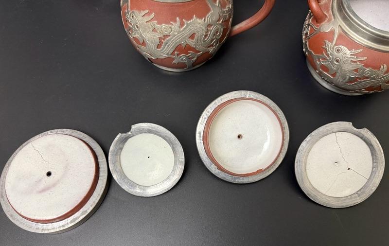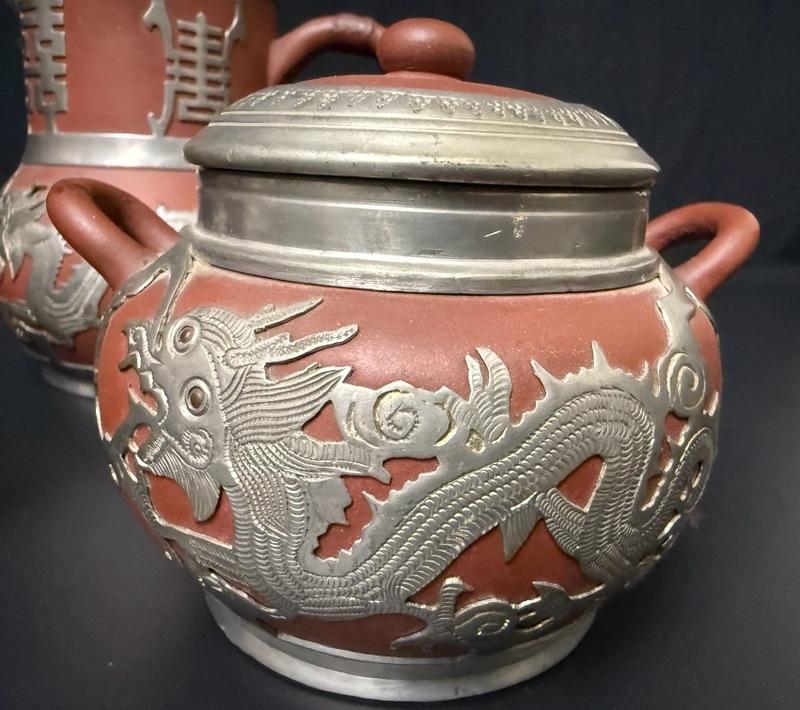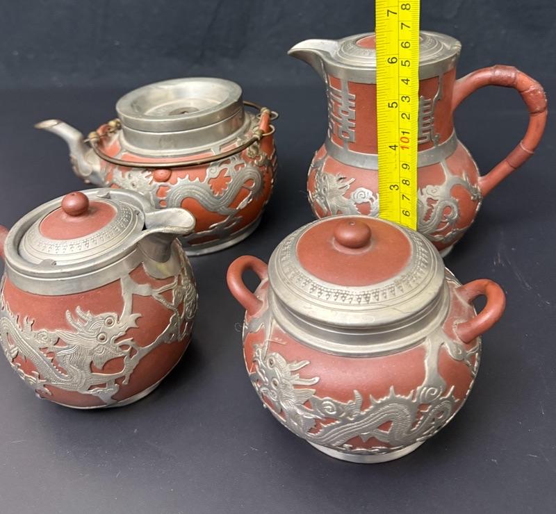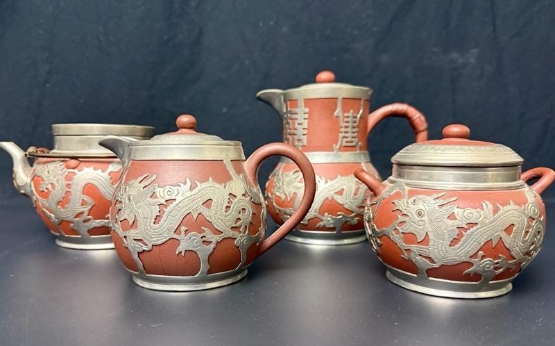 Antique Chinese Yixing Teapot Set of 4 - Unglazed Stoneware & Pewter Dragons