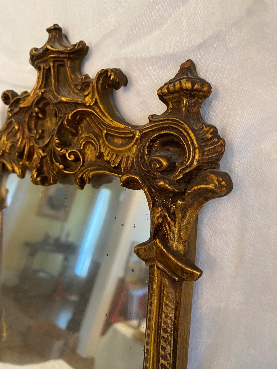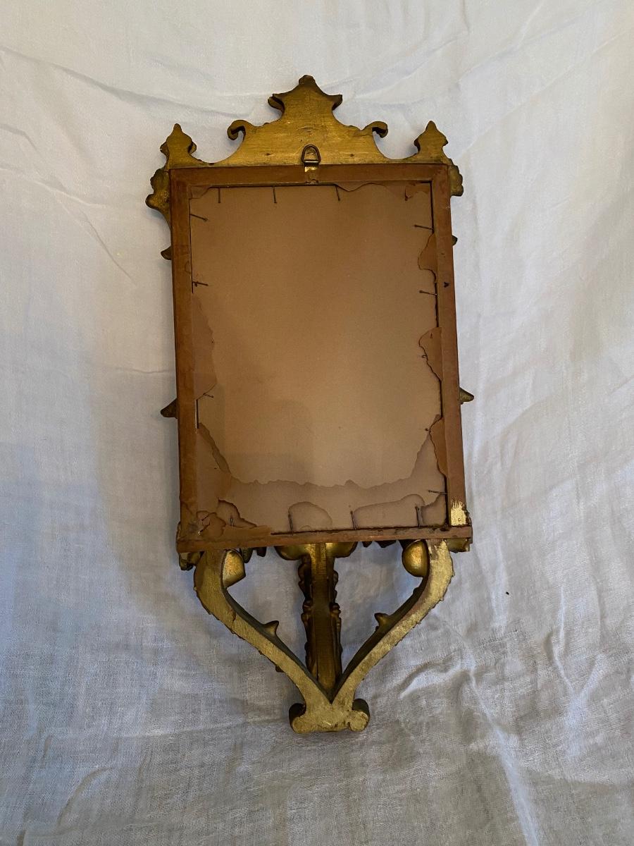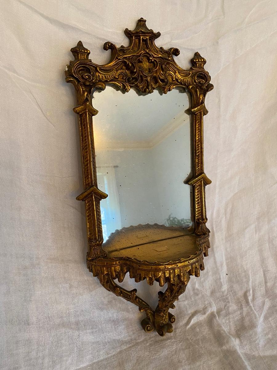 Asian influenced antique mirror is a luxurious piece with its elaborately carved gilt wood frame, pagoda crest, architectural sides and its shaped, demilune shelf with a rocaille apron and resting on foliate supports. Small chip in corner s shown in photo. Some spotting on mirror consistent with age. Measures 19" high x 10" wide x 4.5" deep