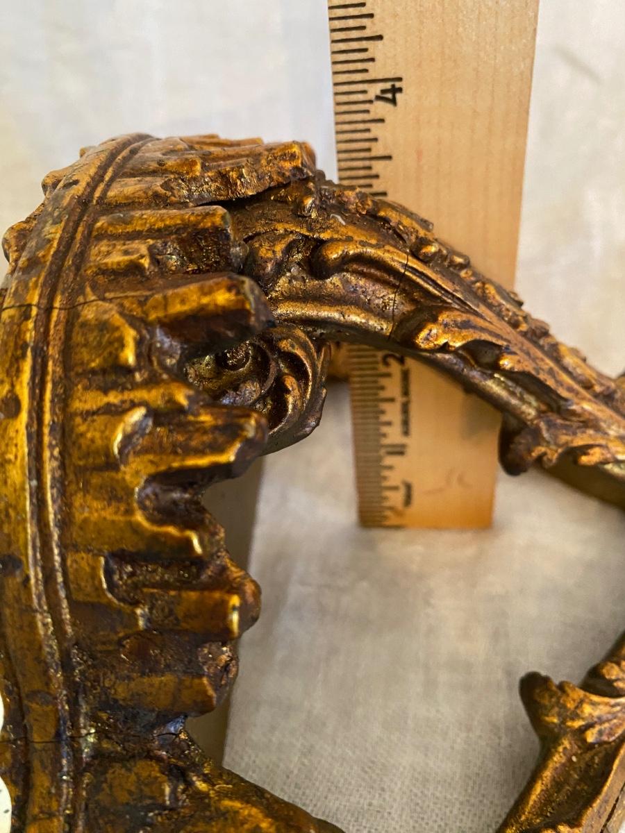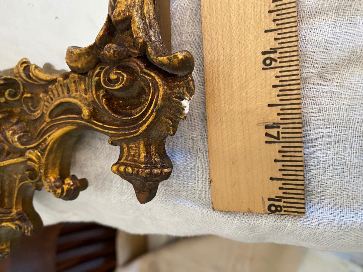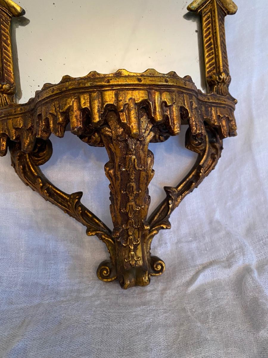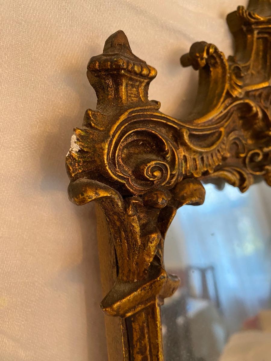 Asian influenced antique mirror is a luxurious piece with its elaborately carved gilt wood frame, pagoda crest, architectural sides and its shaped, demilune shelf with a rocaille apron and resting on foliate supports. Small chip in corner s shown in photo. Some spotting on mirror consistent with age. Measures 19" high x 10" wide x 4.5" deep