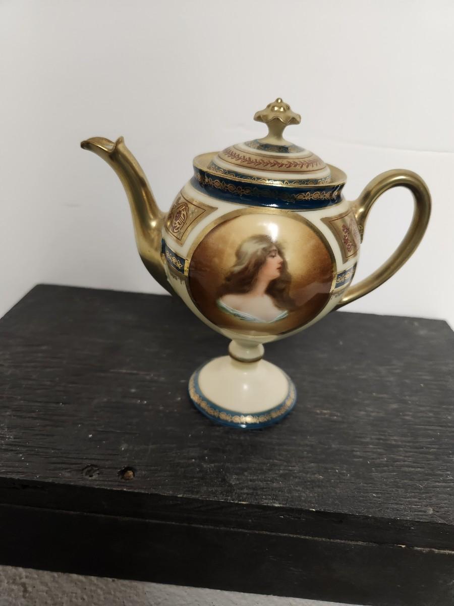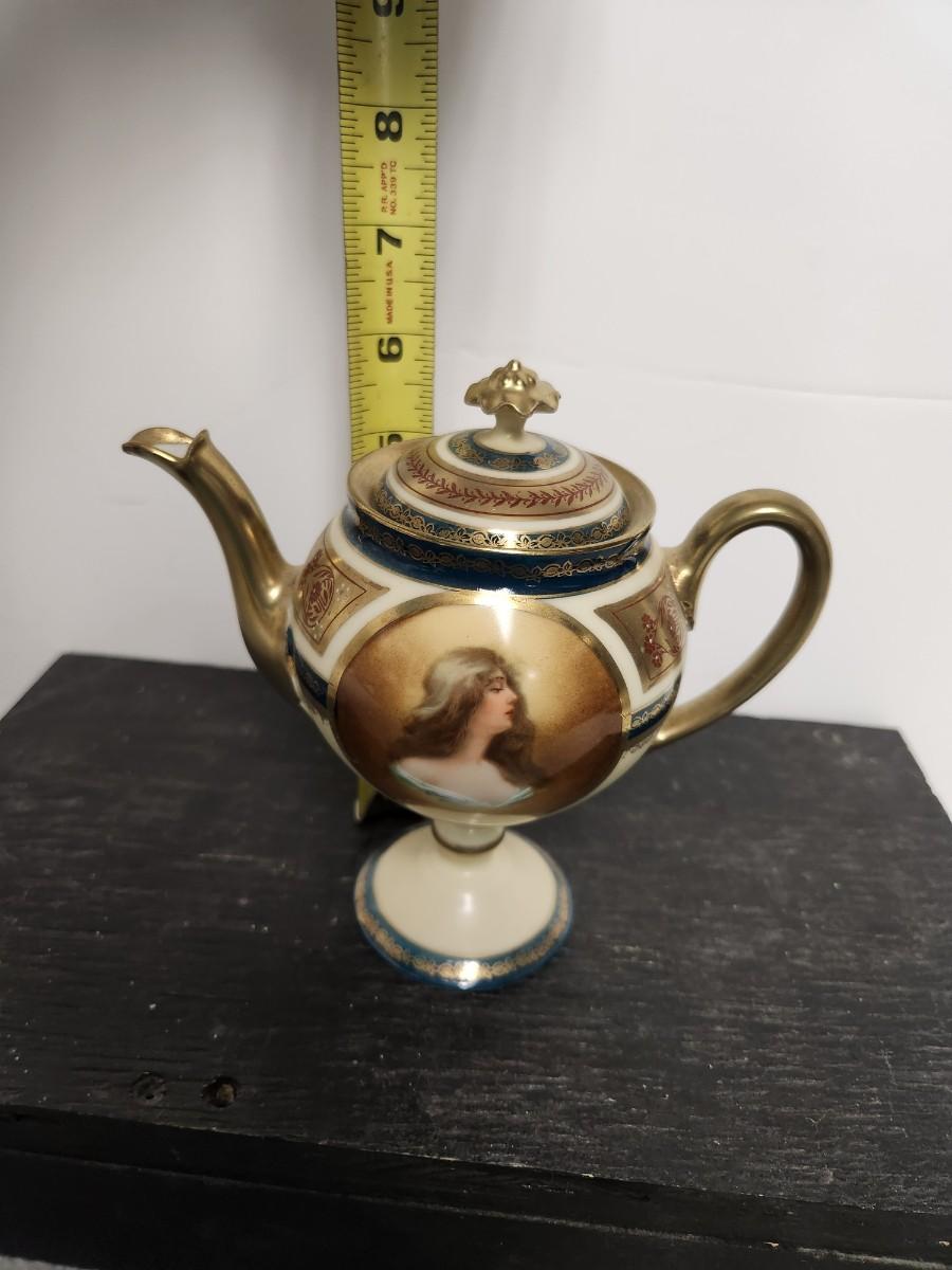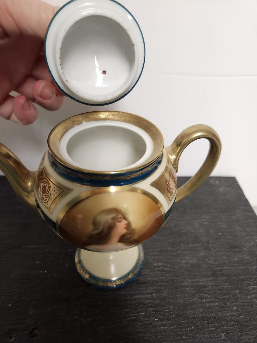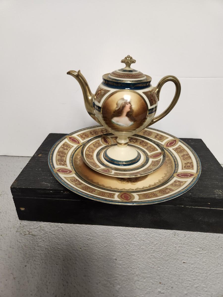 Gorgeous antique portrait chocolate pot, under plate and serving plate.