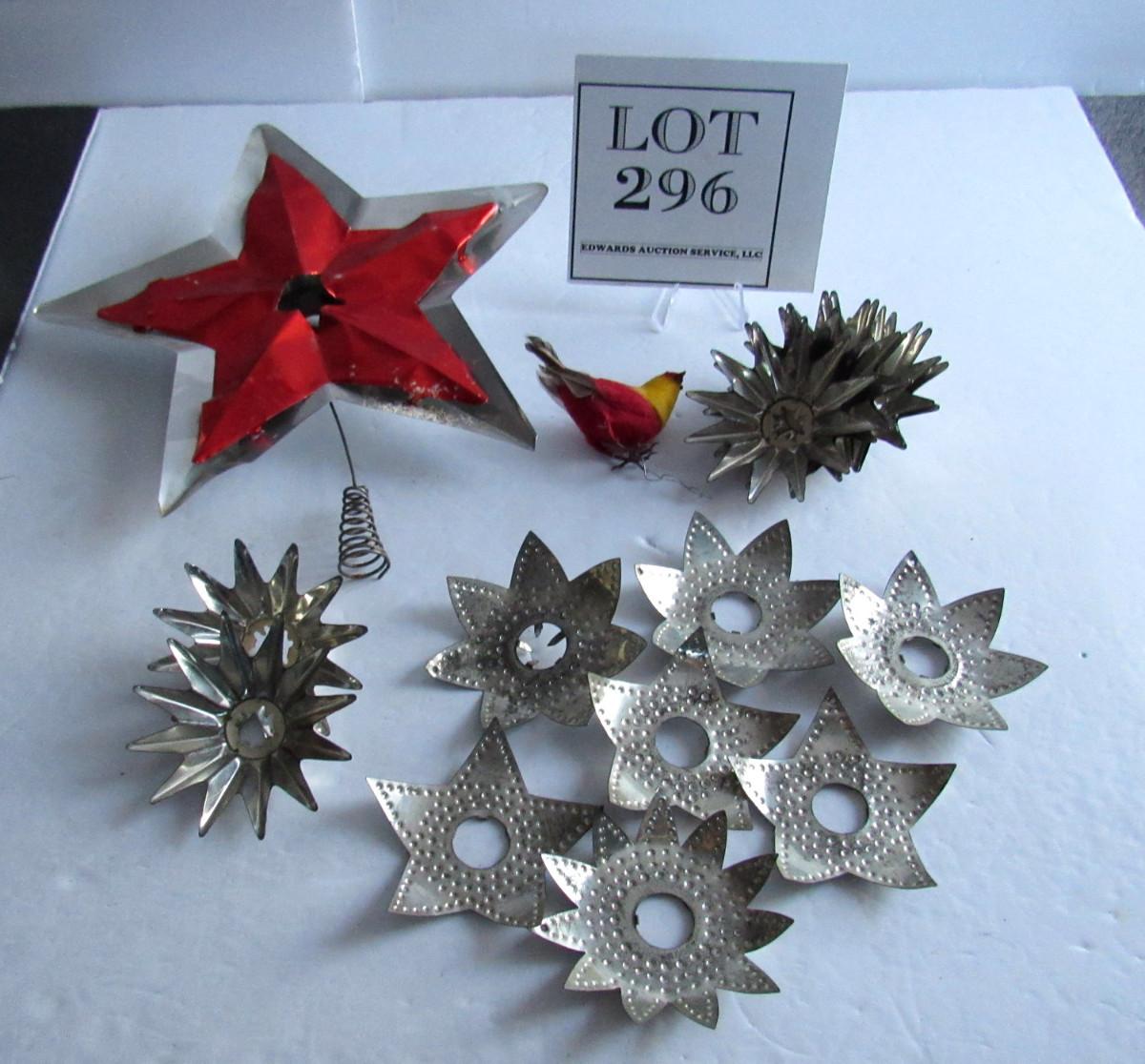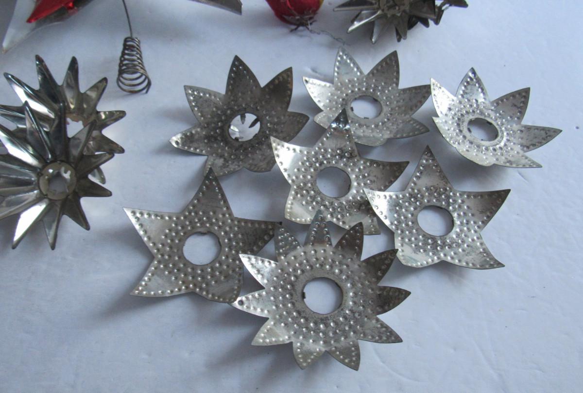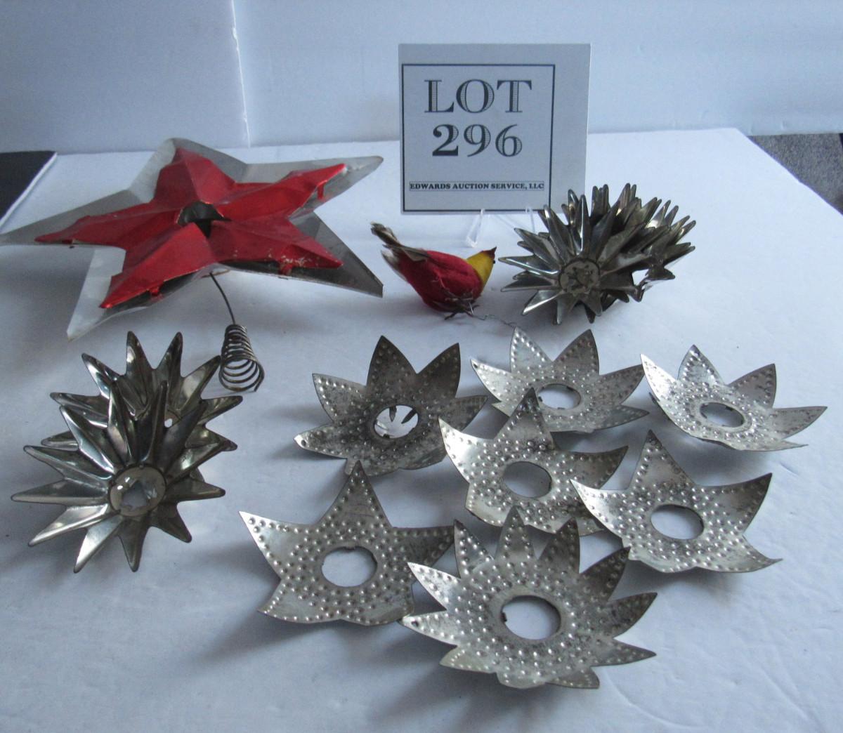 Antique Christmas Tin Light Reflectors, Aluminum Tree Topper, Cotton Bird