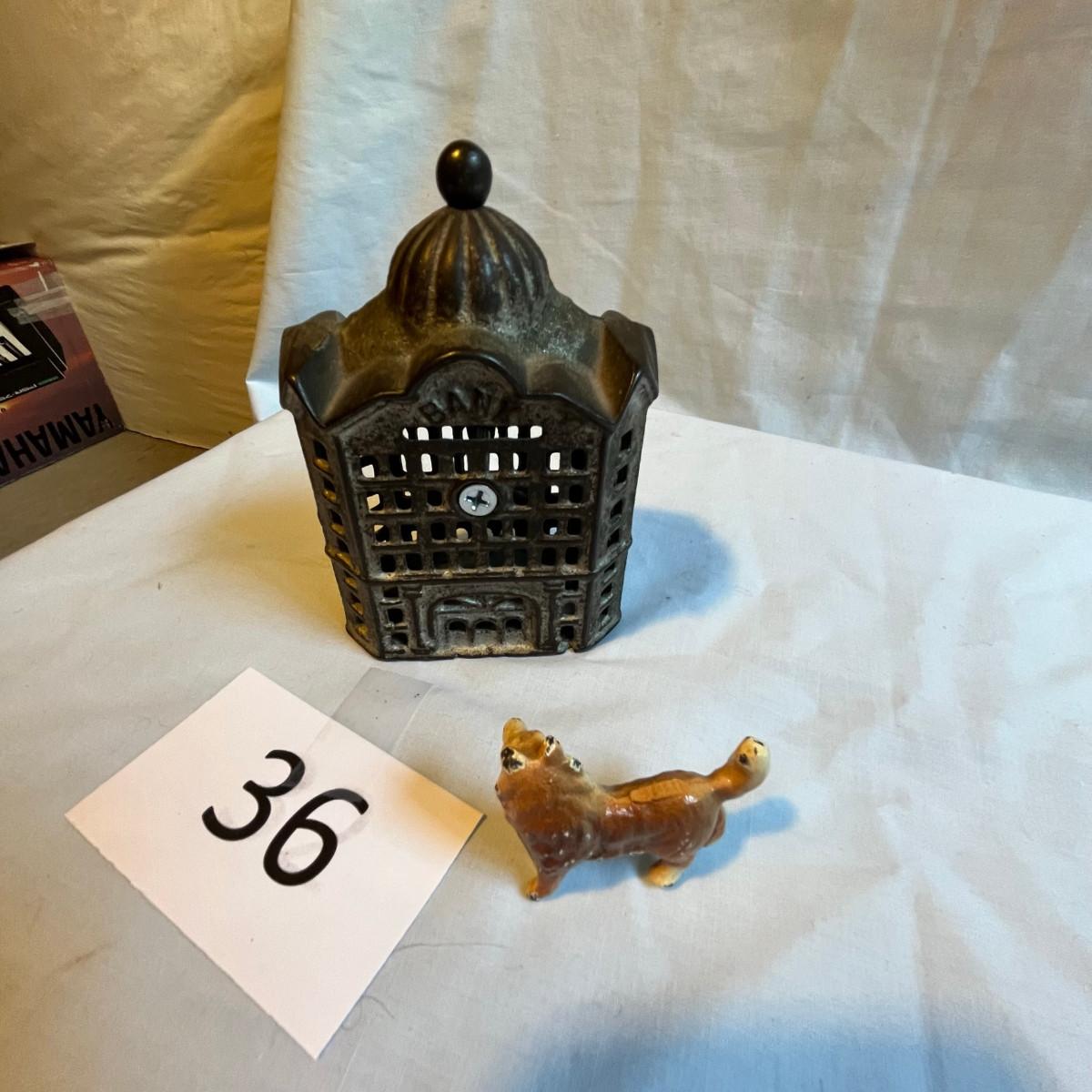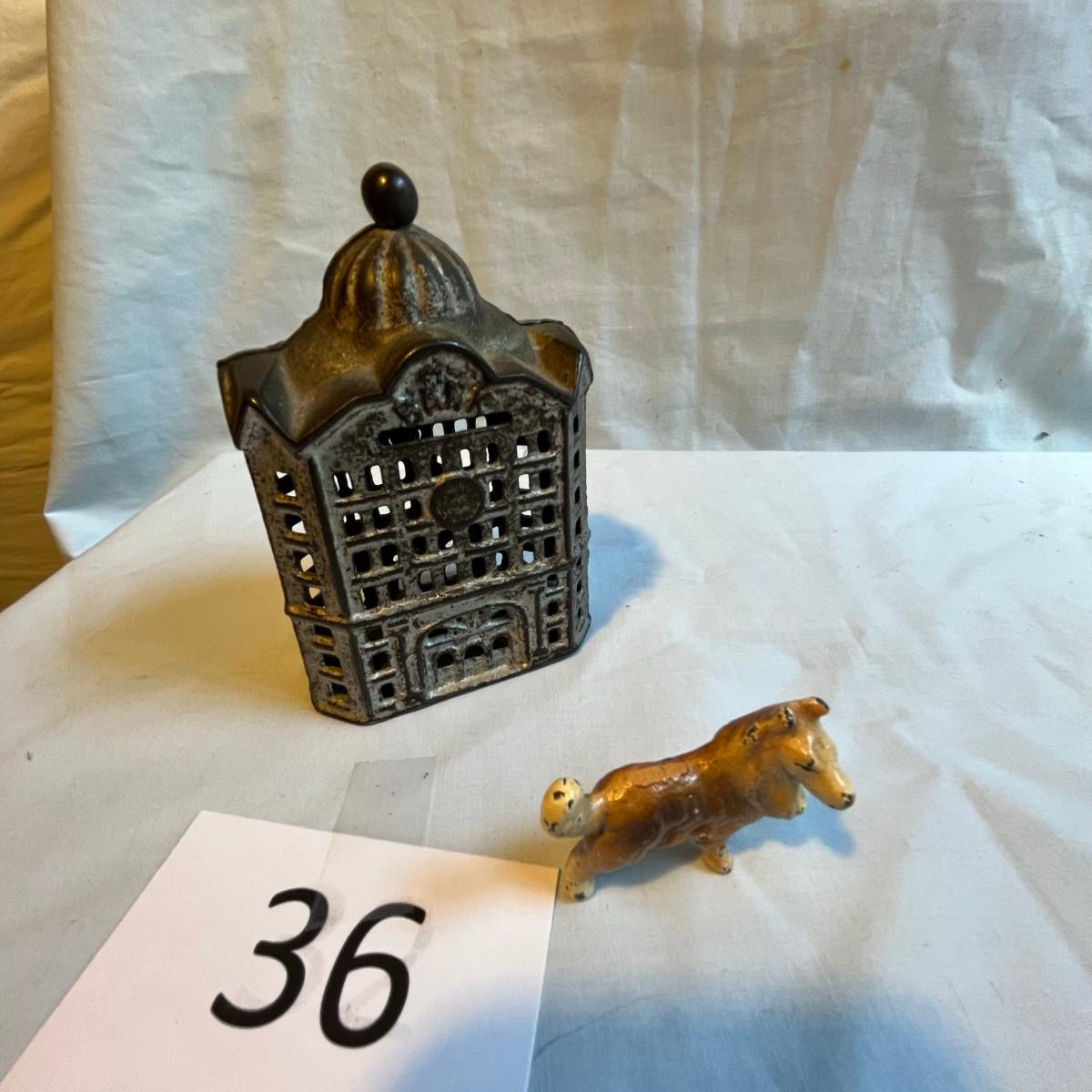 Antique CI Coin Bank, Bank Building.  CI dog figure