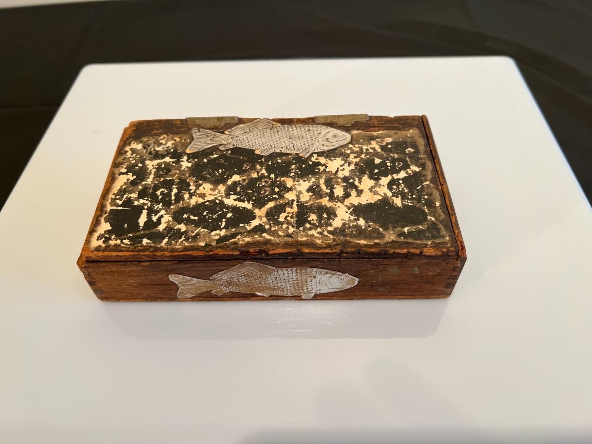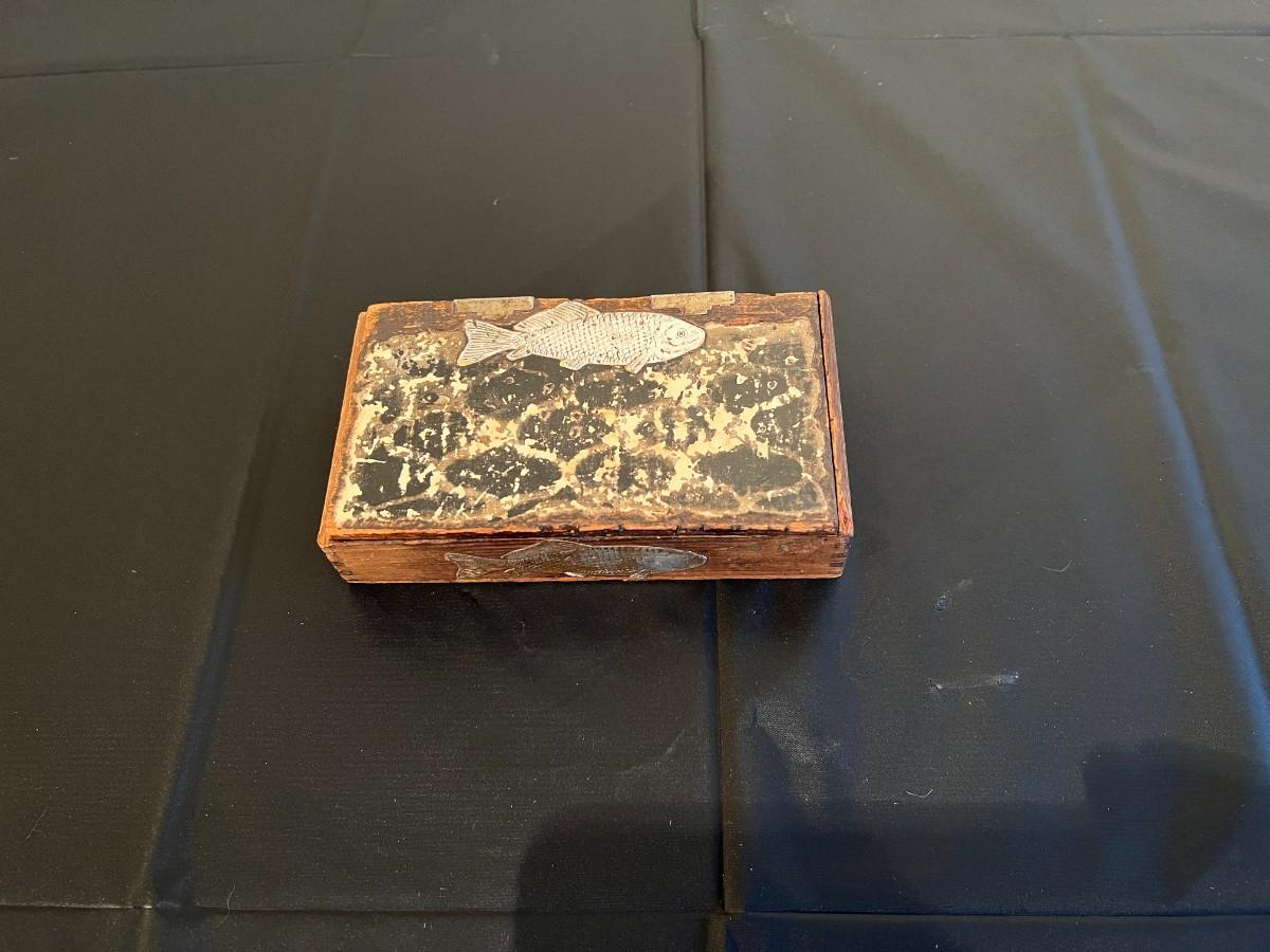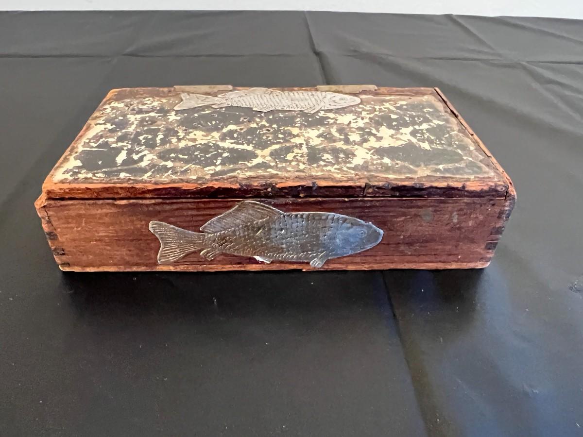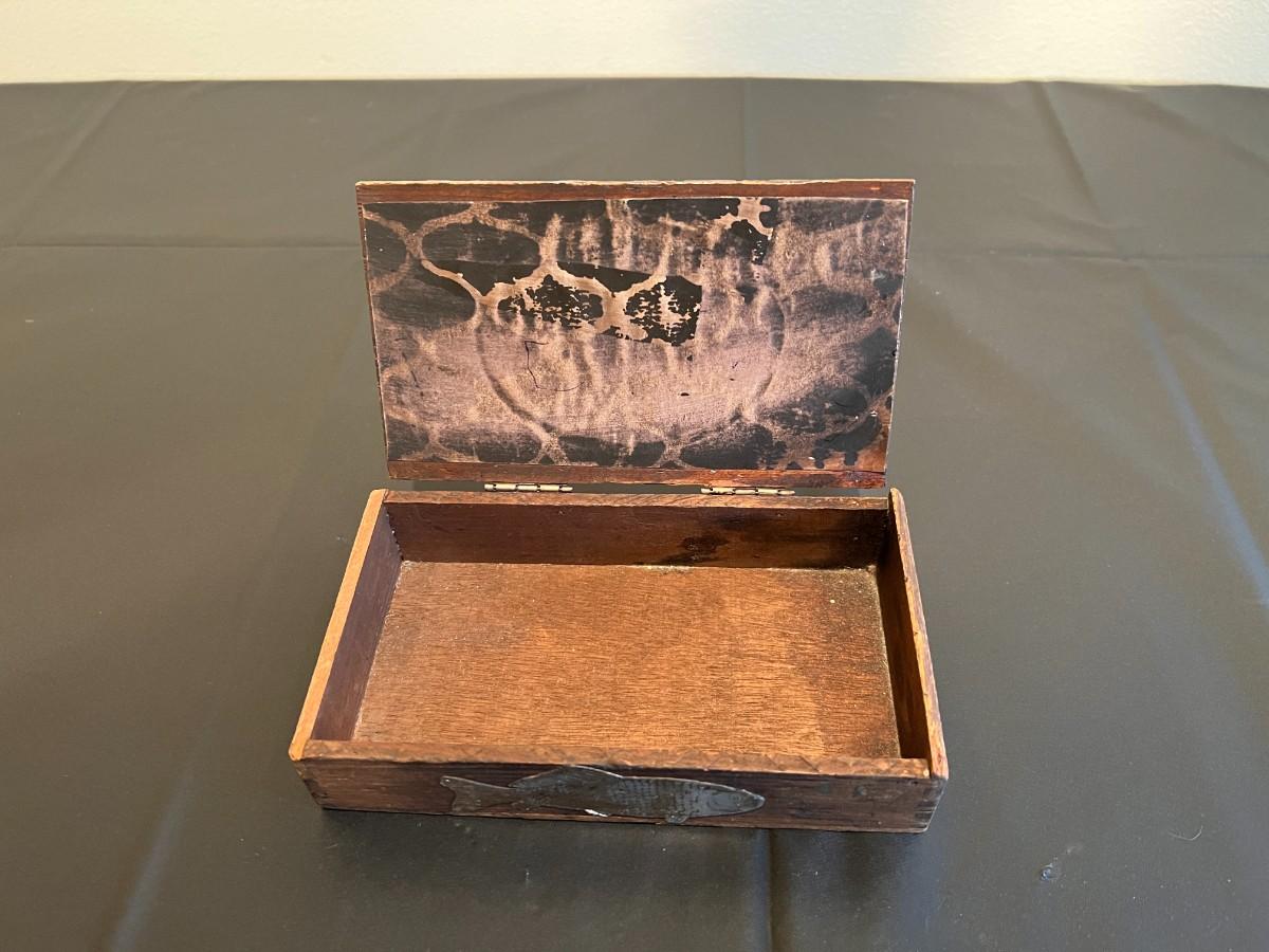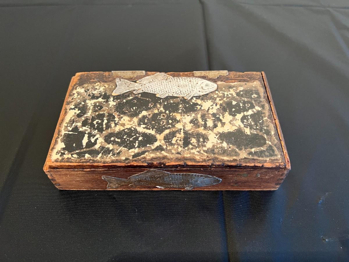 Antique Cigar Box Wood with Silver Tone Metal Fish