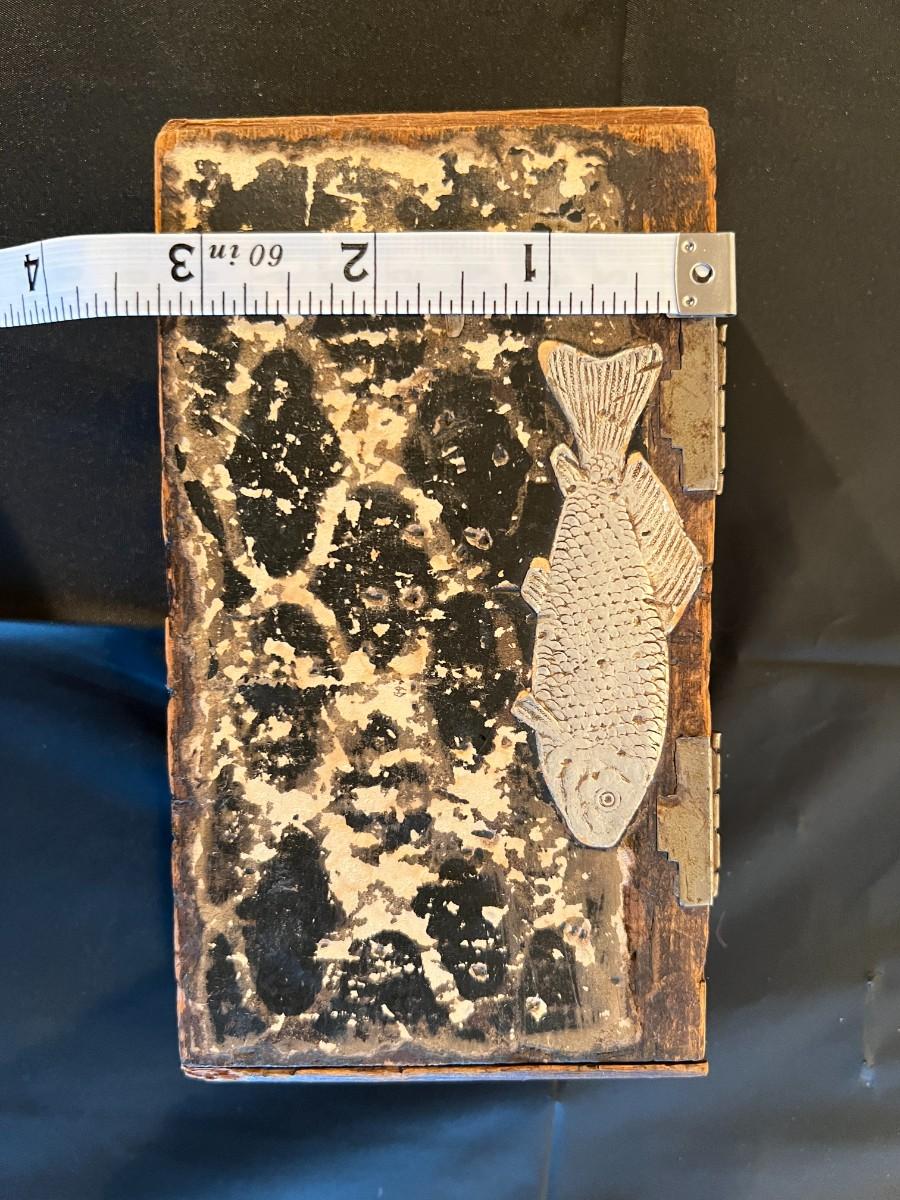 Really cool antique cigar box with a fish scale pattern on top and featuring two silver tone metal fish. Condition as shown.