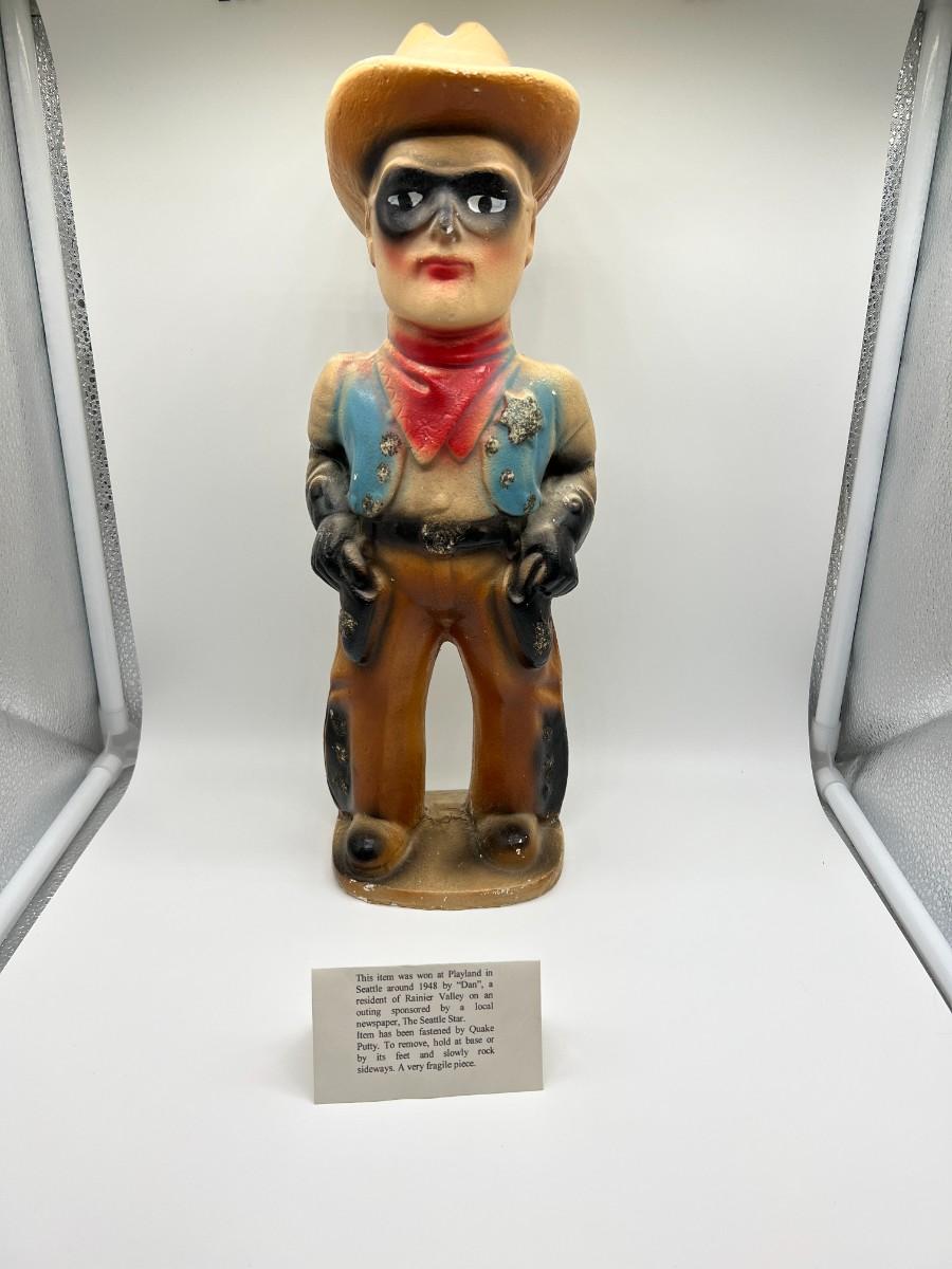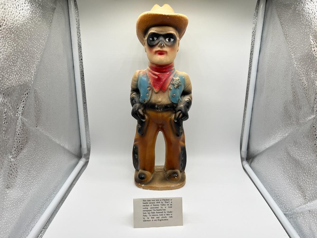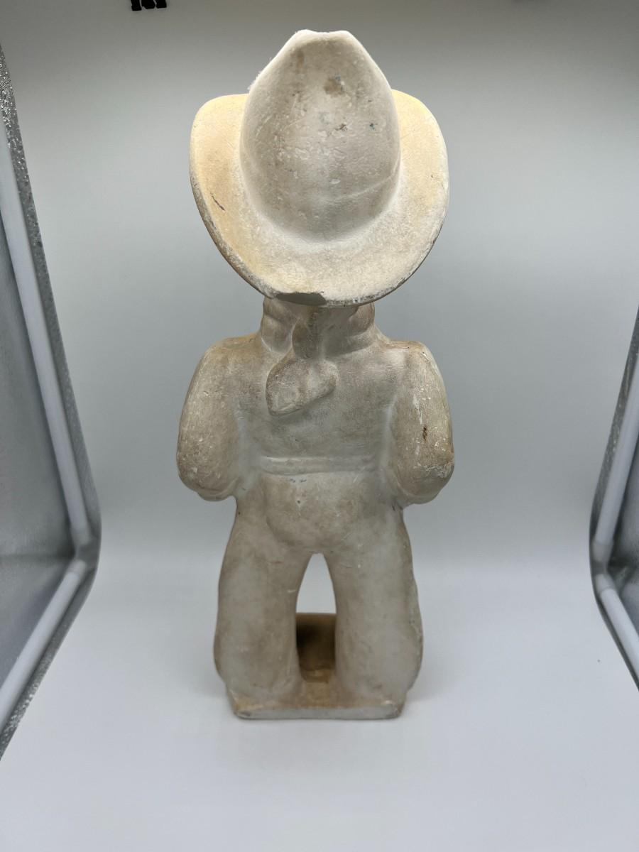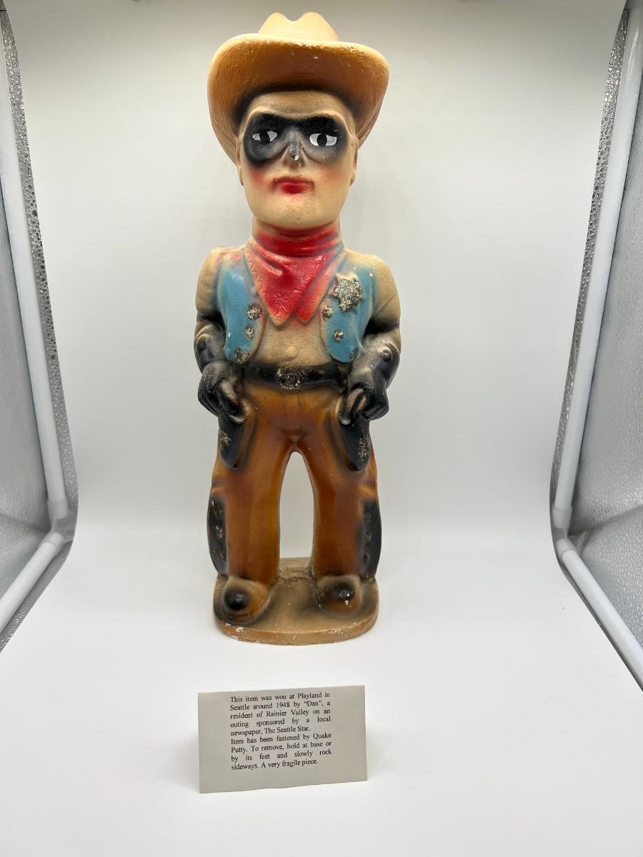 Antique Circa 1948 Chalkware Lone Ranger Cowboy Kid Statue Figurine Prize from Playland in Seattle. Included with a note that summarizes the known provenance, "This item was won at Playland in Seattle around 1948 by Dan, a resident of Rainier Valley on an outing sponsored by a local newspaper, The Seattle Star." Condition as shown.
