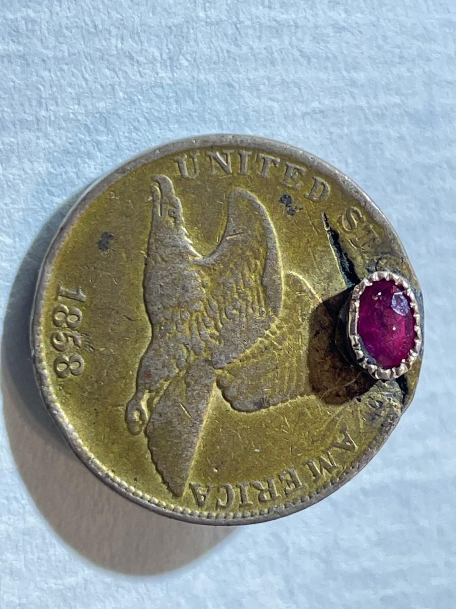 ANTIQUE CIVIL WAR/WWI ERA 1858 FLYING EAGLE CENT LAPEL PIN w/REAL RUBY STONE MOUNTED AS PICTURED.