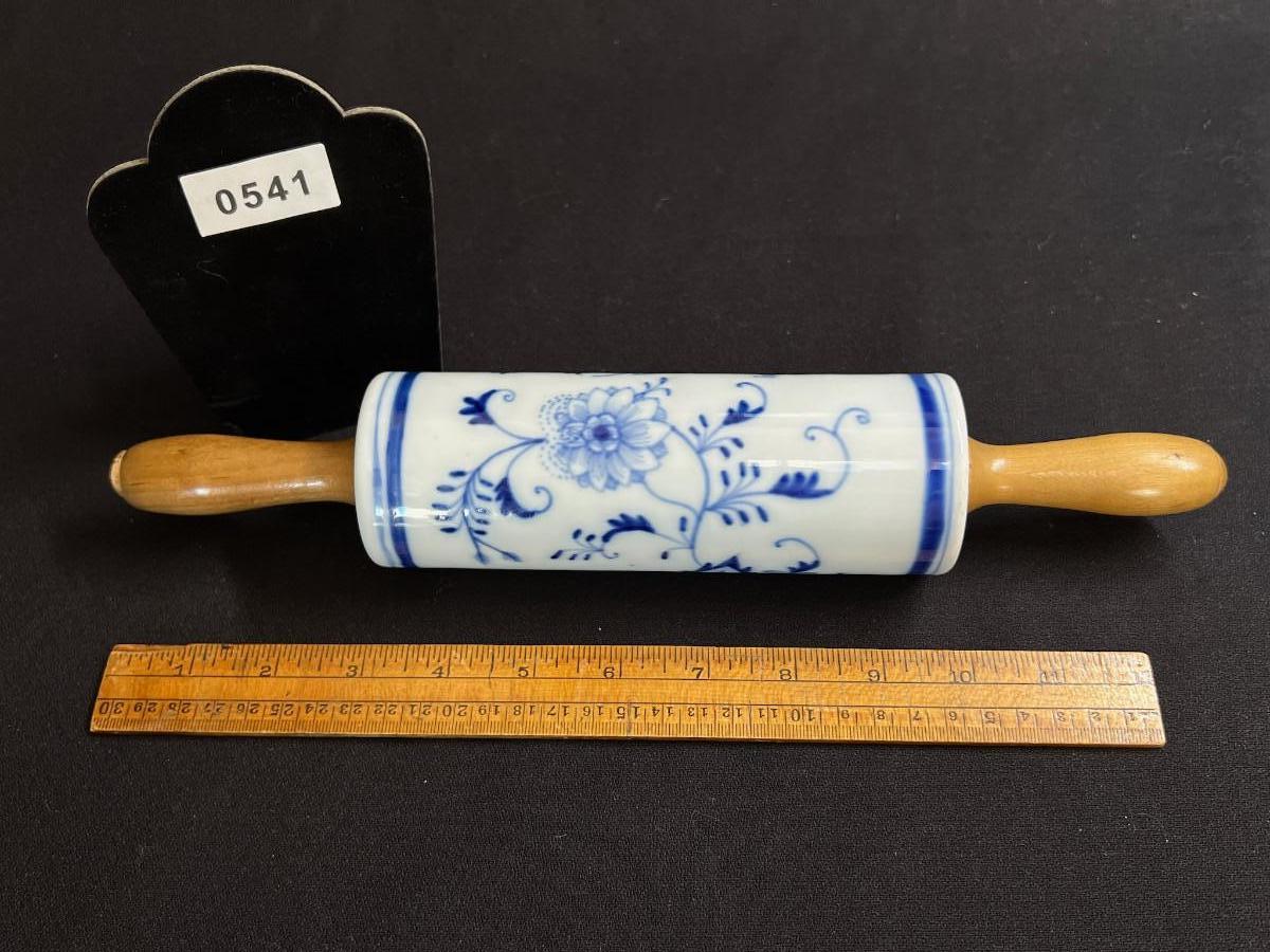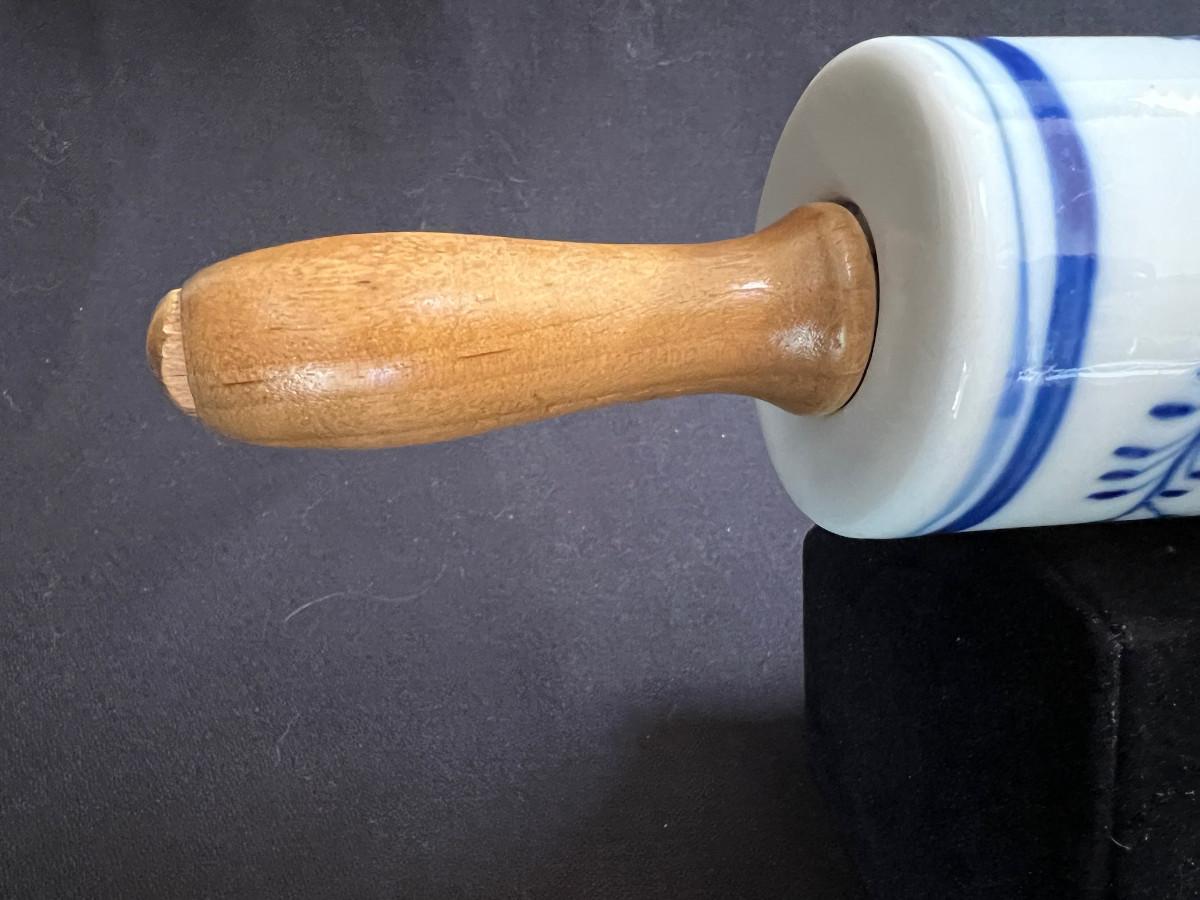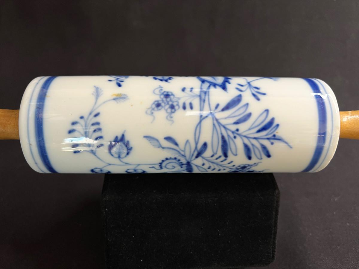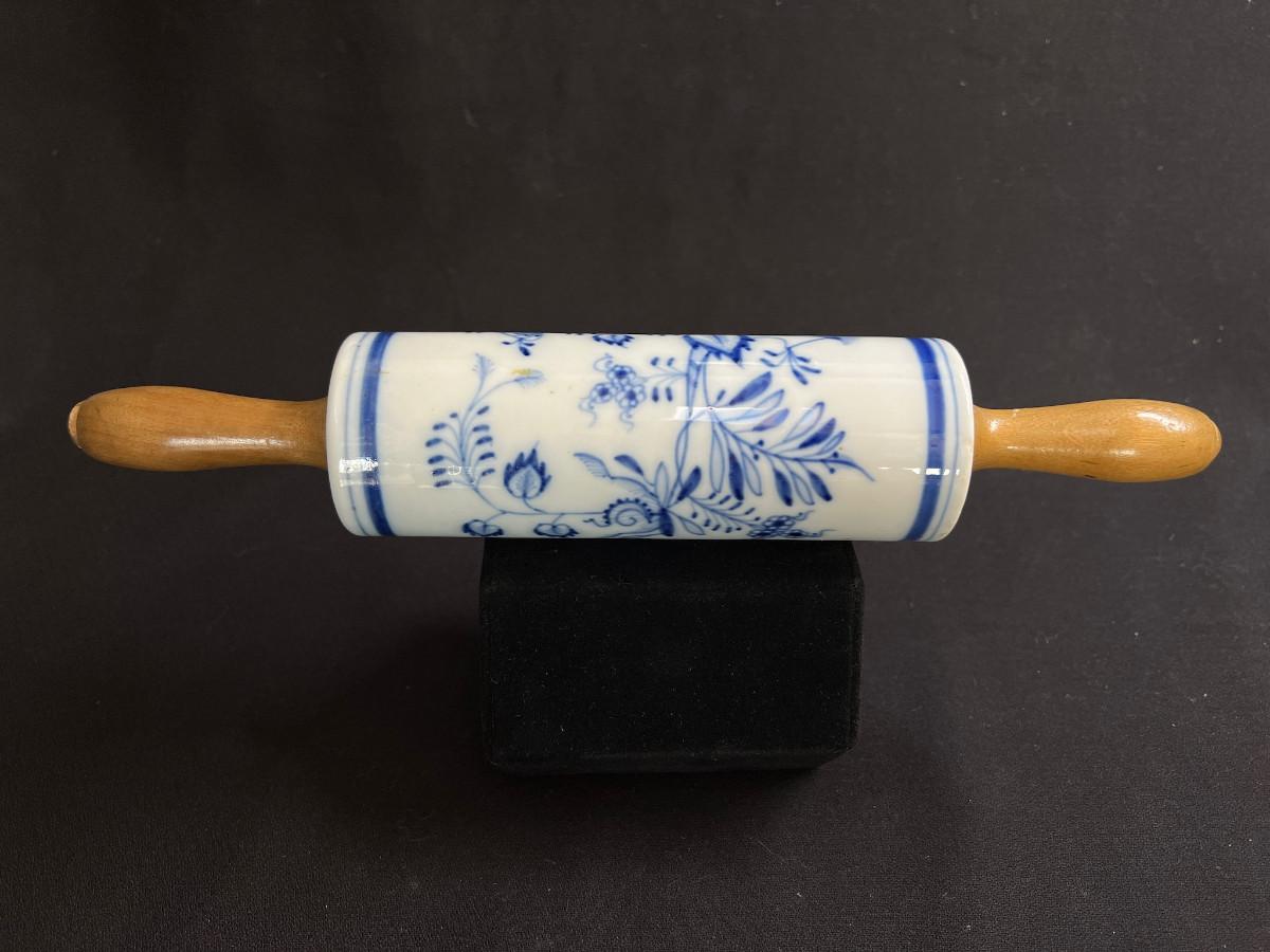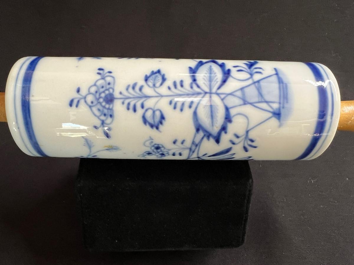 Antique Clasic Blue Onion Rolling Pin Meissen Style Porcelain