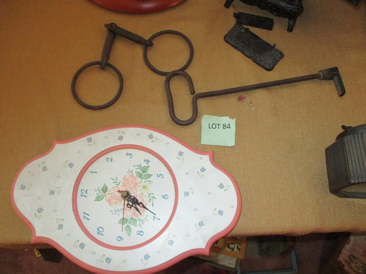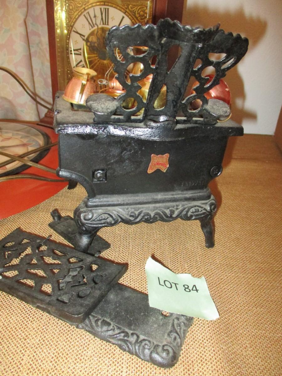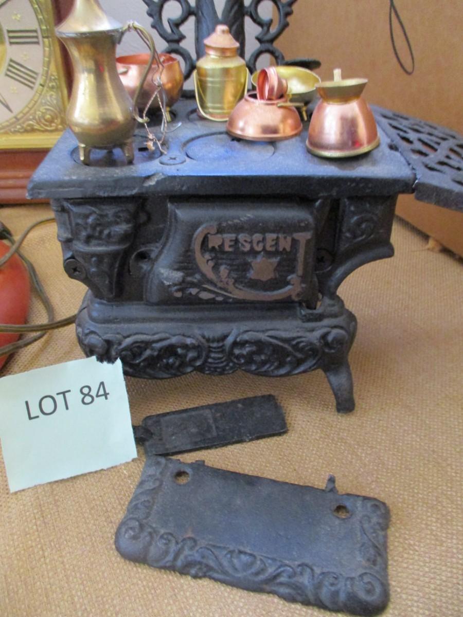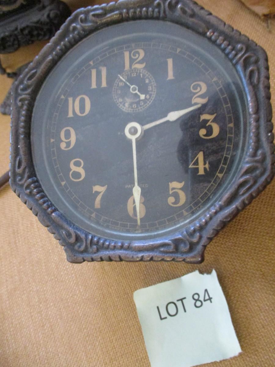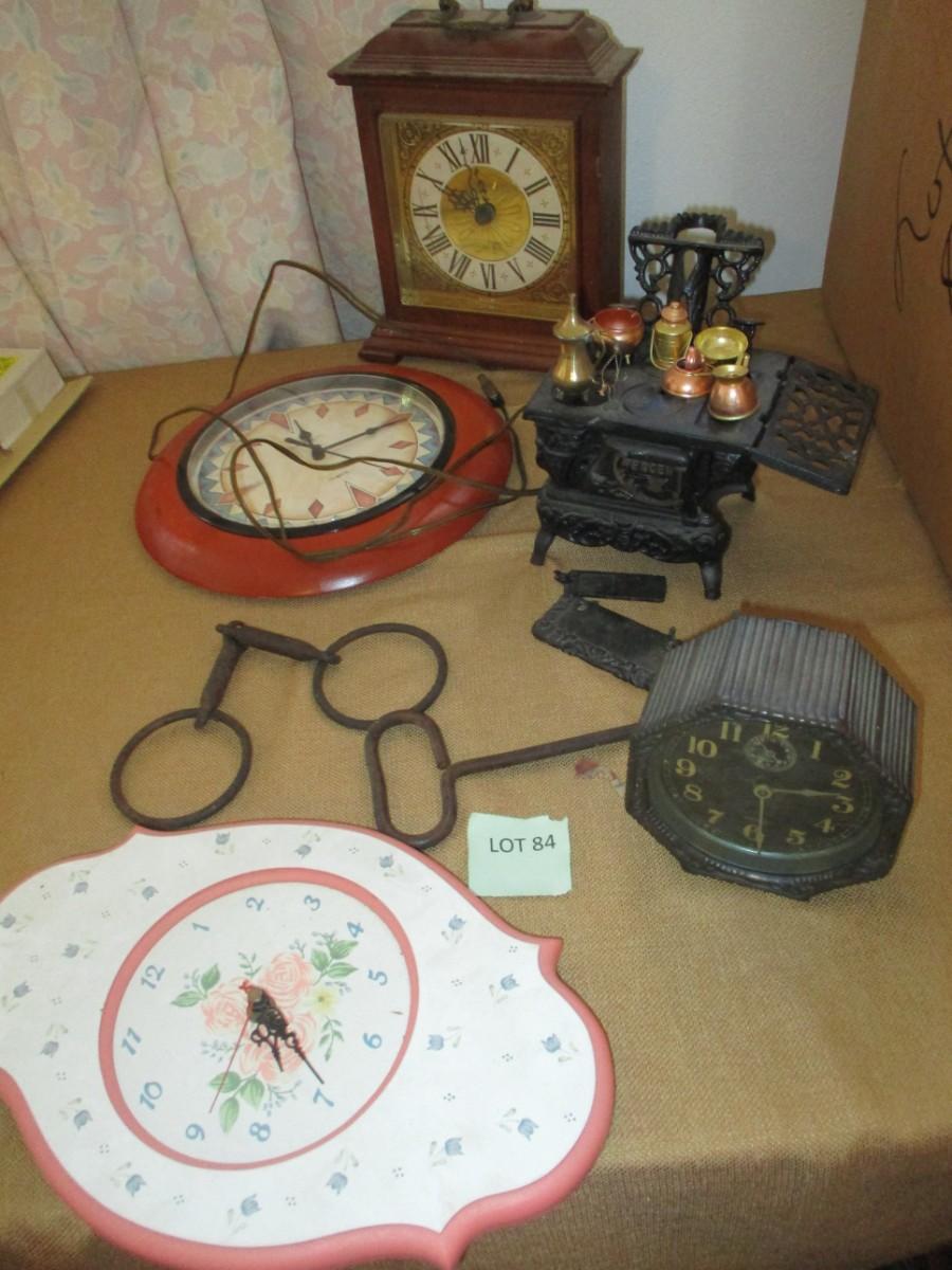 Antique Metal Nightstand clock. Alarm sounds can't guarantee it works. Toy iron stove with accessories. Electric and Battery operated clocks. Can't guarantee it works.