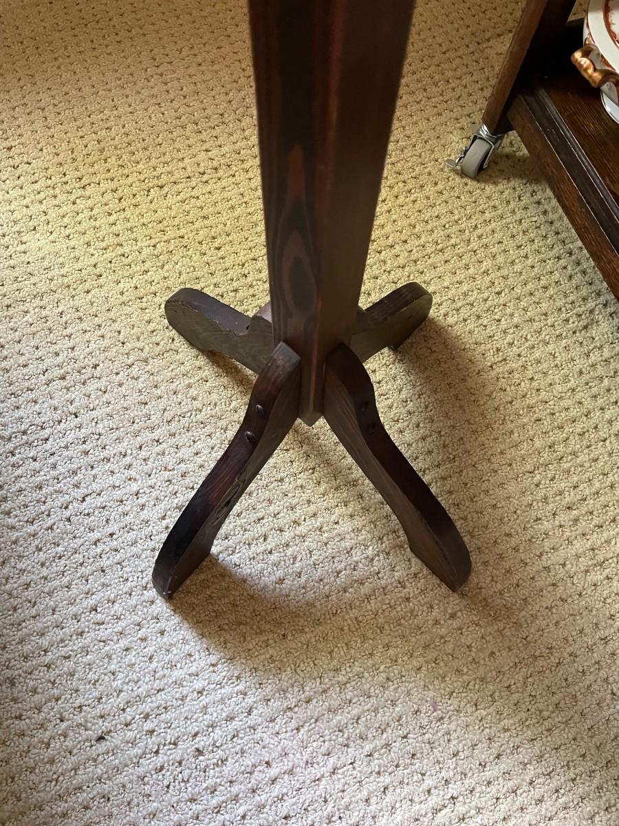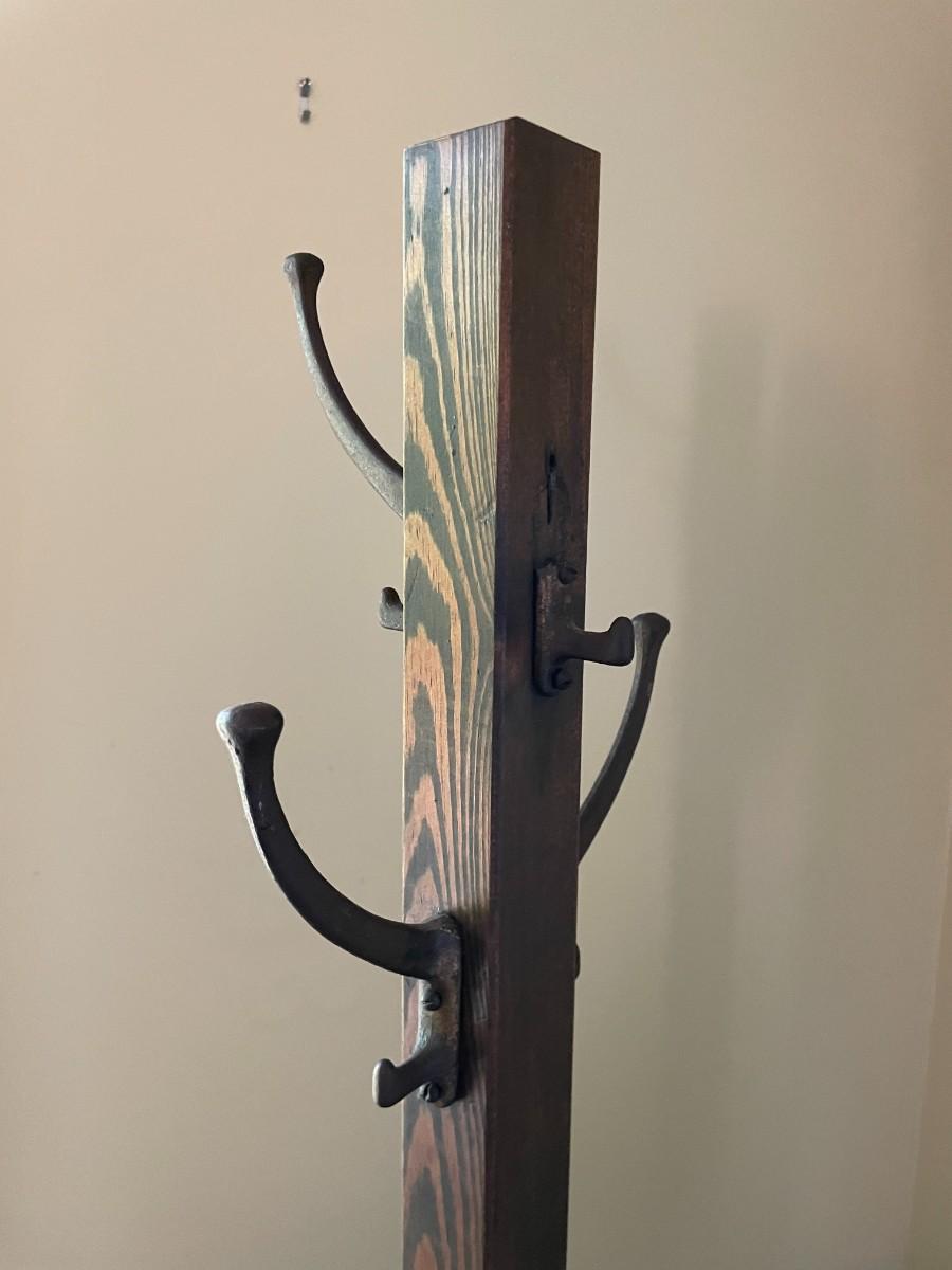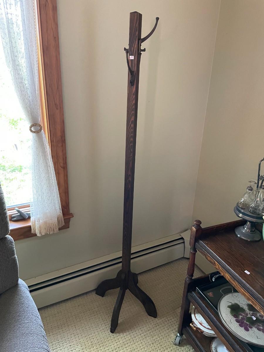 Made of wood. Brass hangers. Sturdy and in nice condition. 65 1/2H x 17w(Base).
