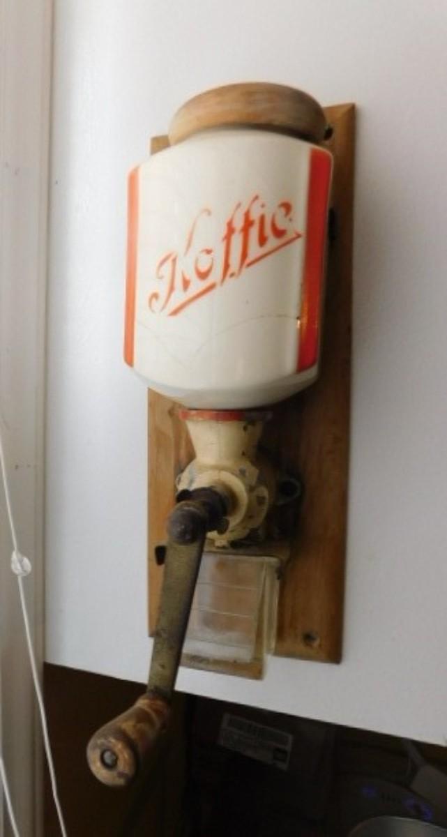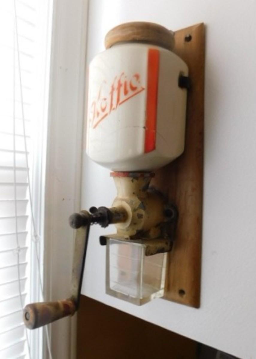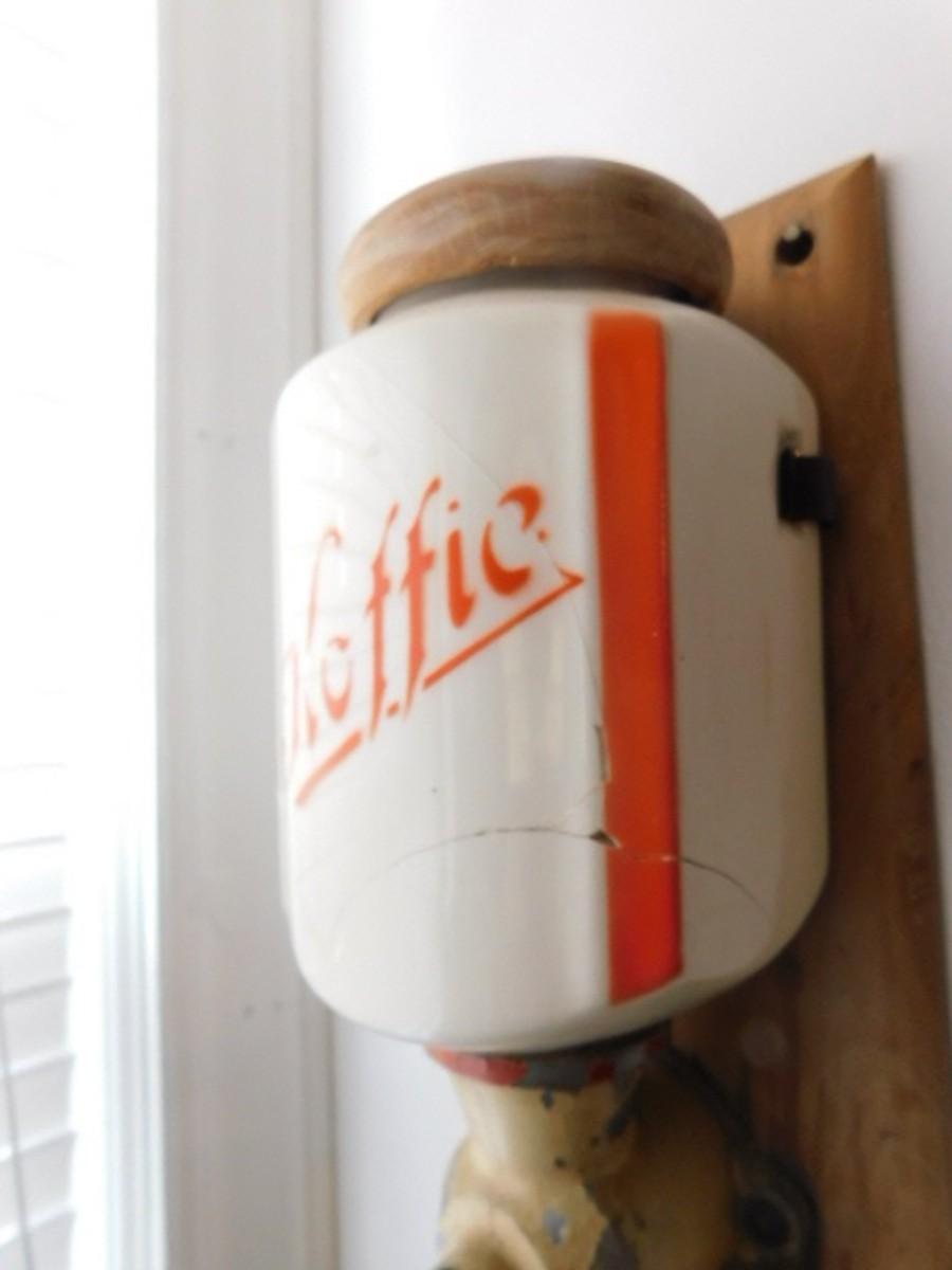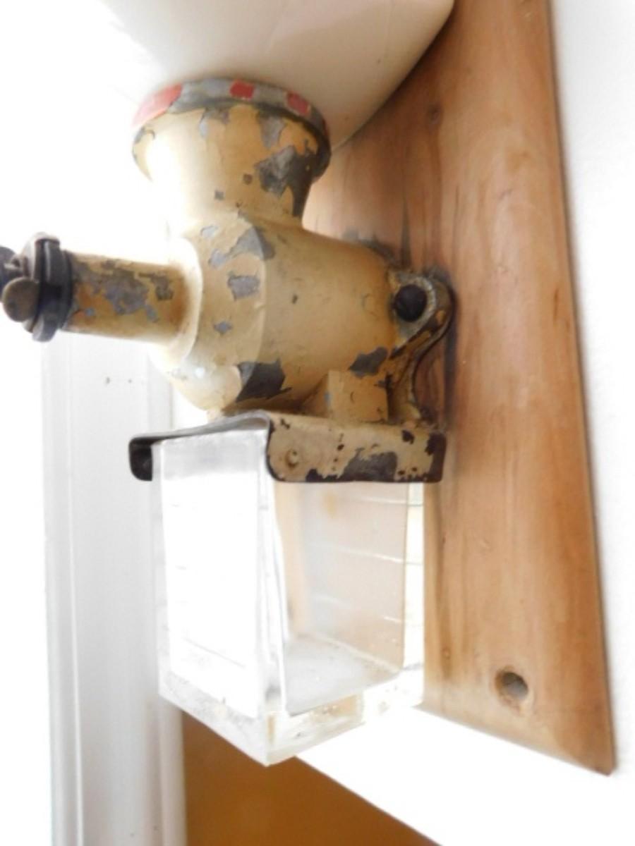Antique Coffee Mill on Wood Base. The mill had been dropped in the past so it has cracks as shown