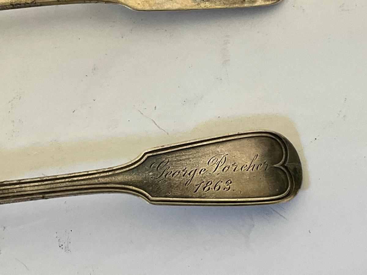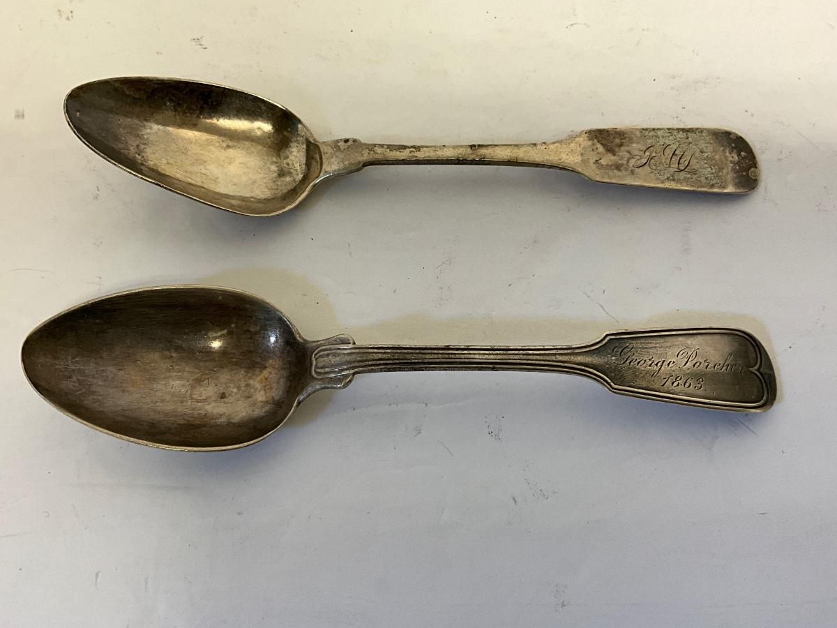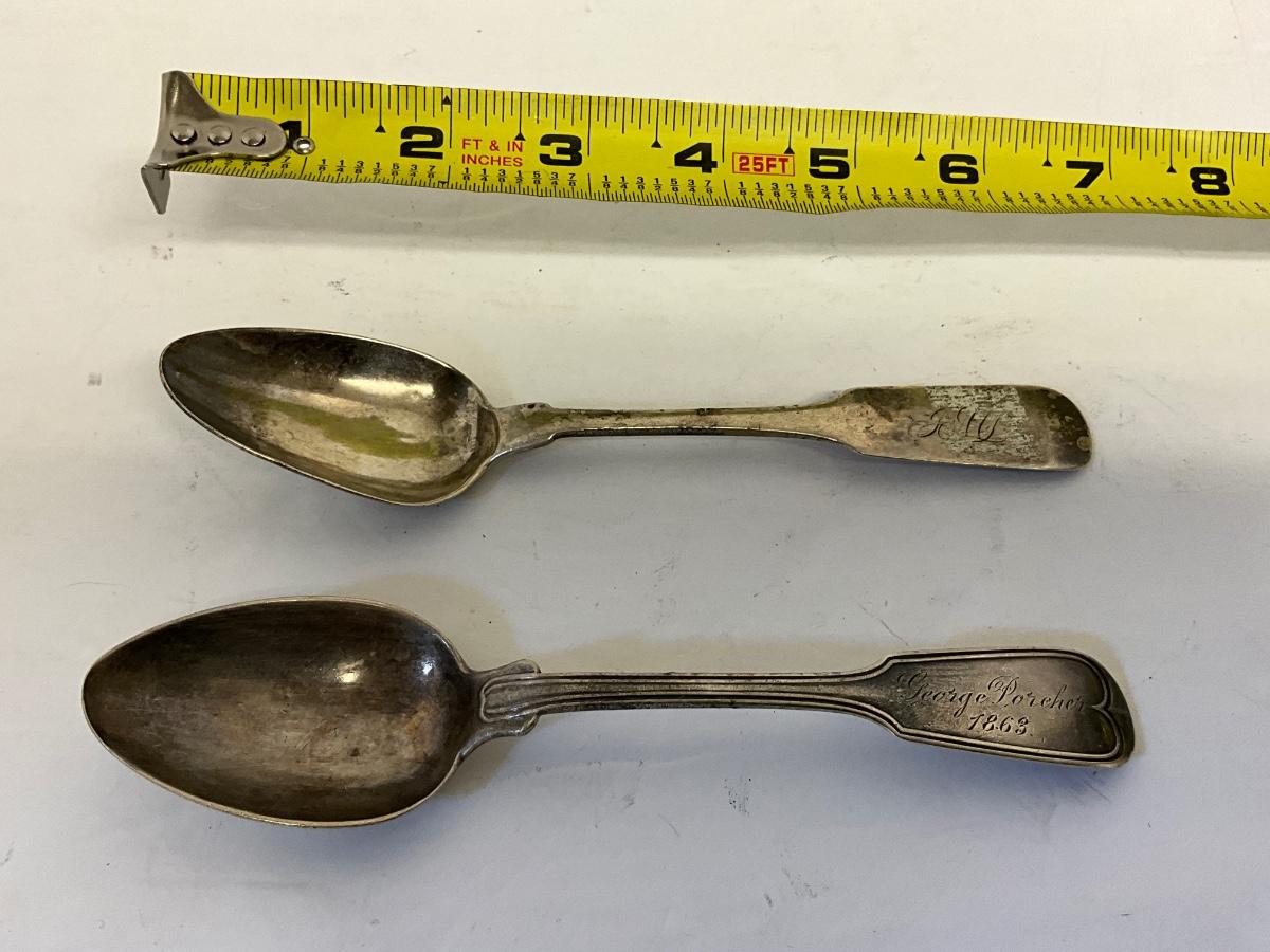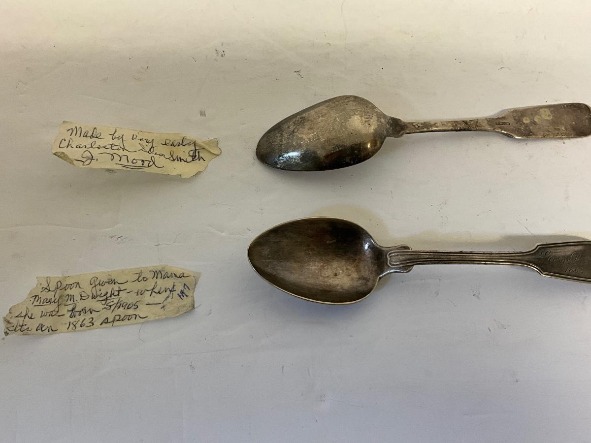 Antique Coin Silver Spoon Lot, top spoon J Mood Charleston Silversmith, bottom spoon from 1863 engraved George Porcher, Hayden Whilden as pictured