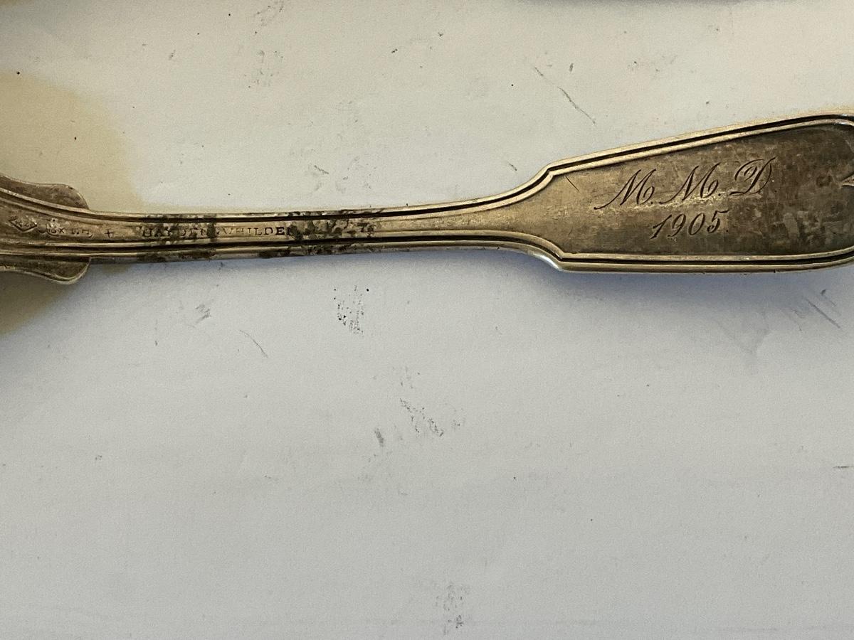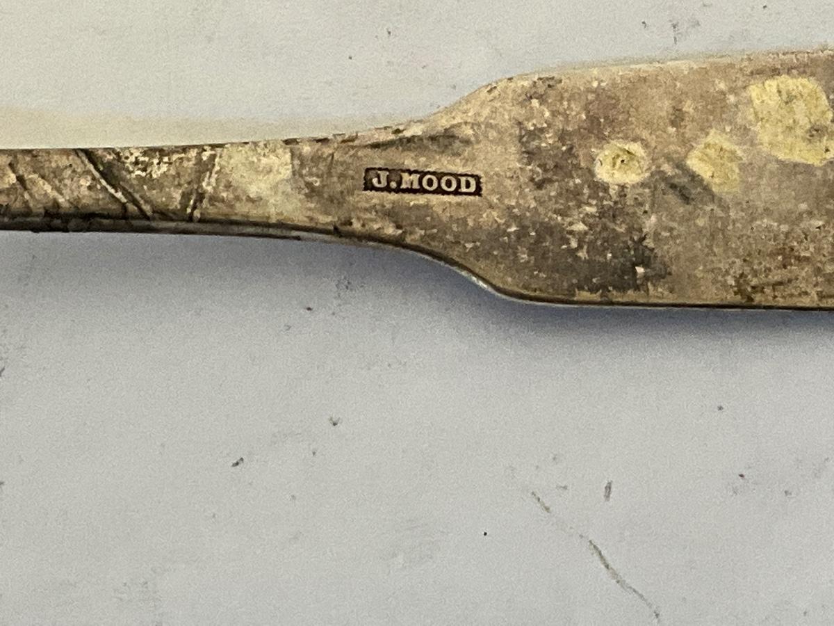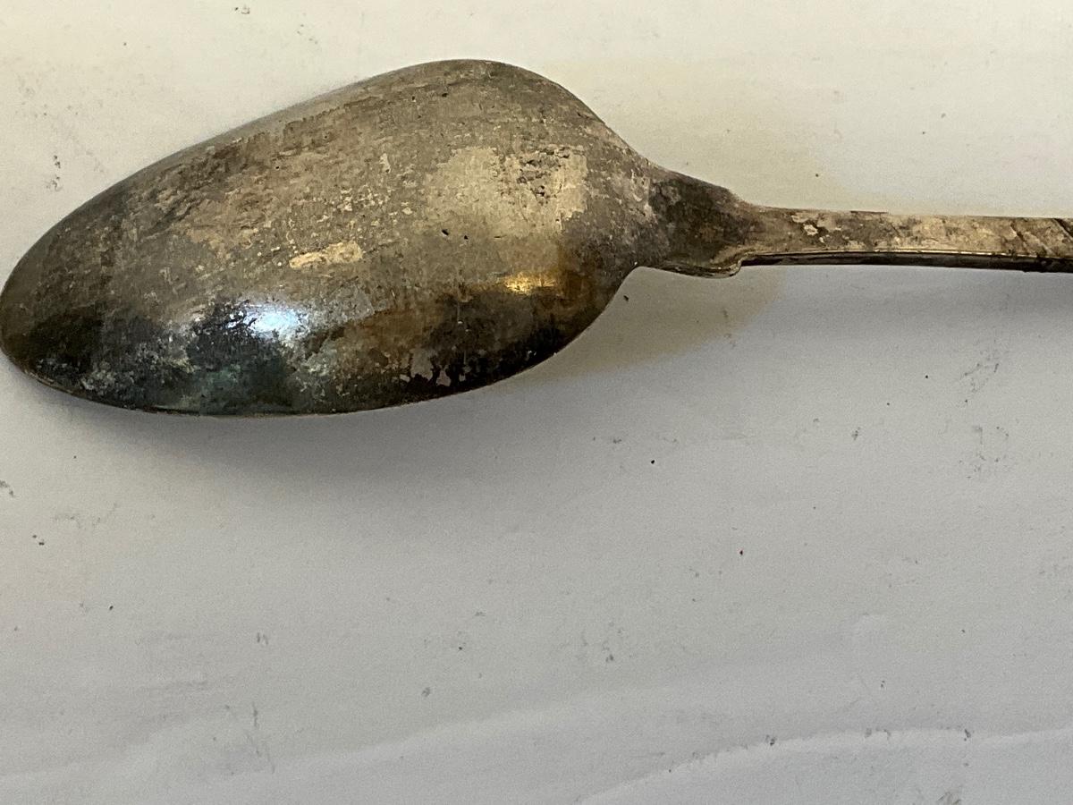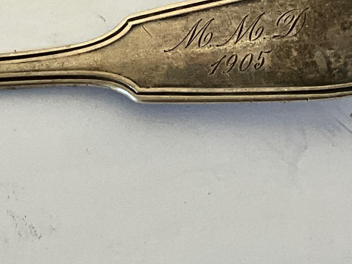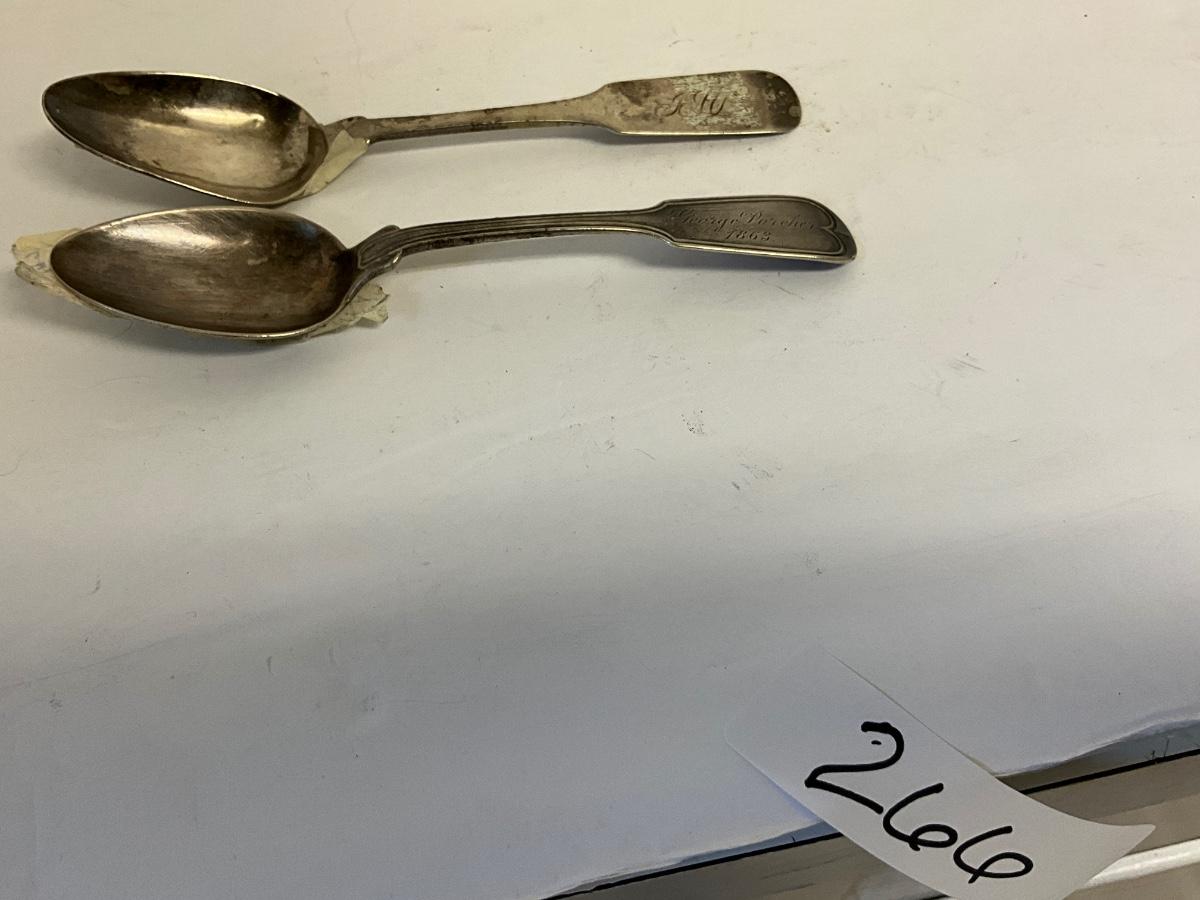 Antique Coin Silver Spoon Lot, top spoon J Mood Charleston Silversmith, bottom spoon from 1863 engraved George Porcher, Hayden Whilden as pictured