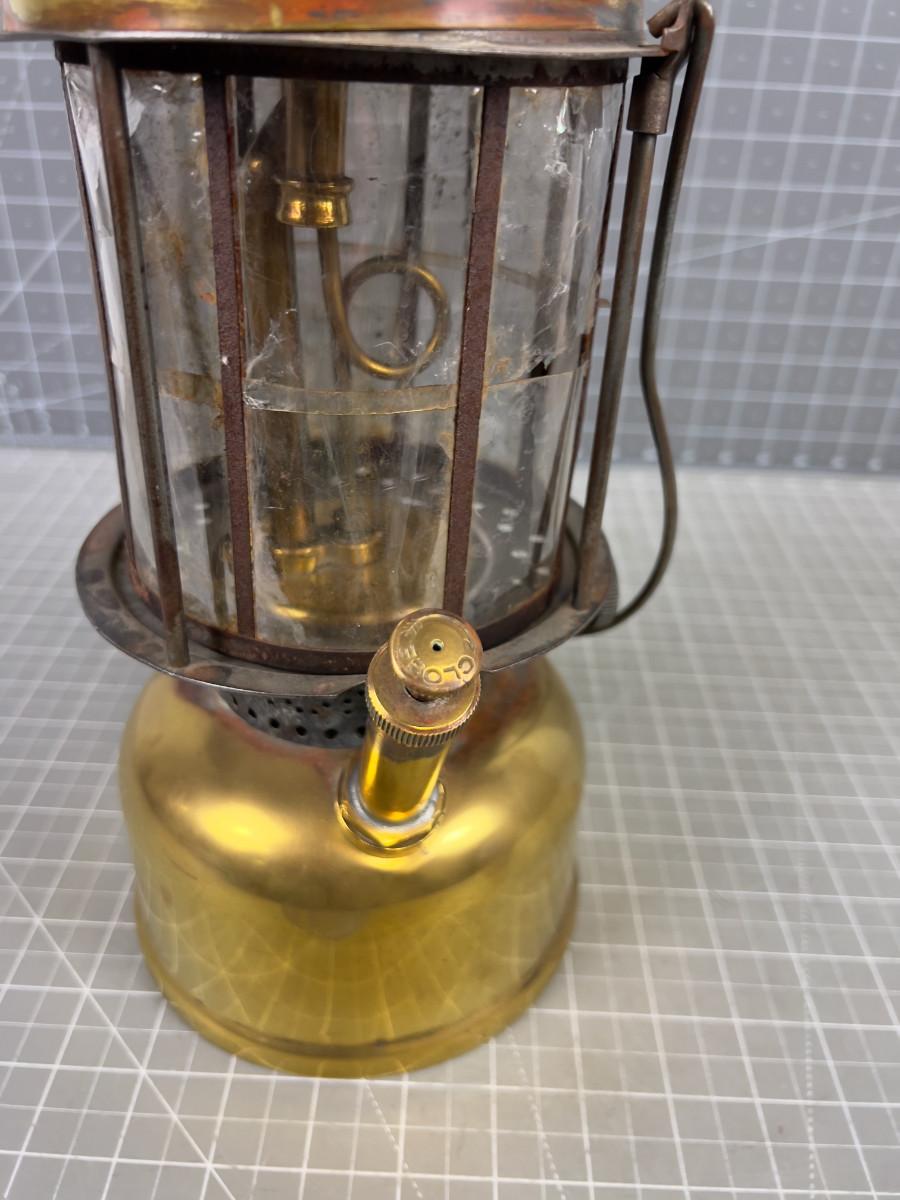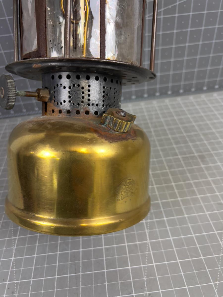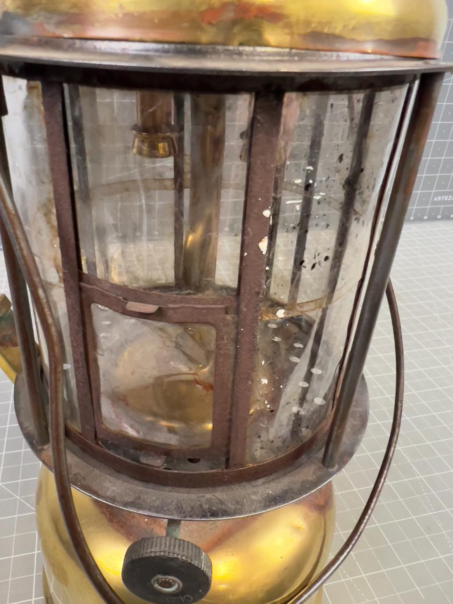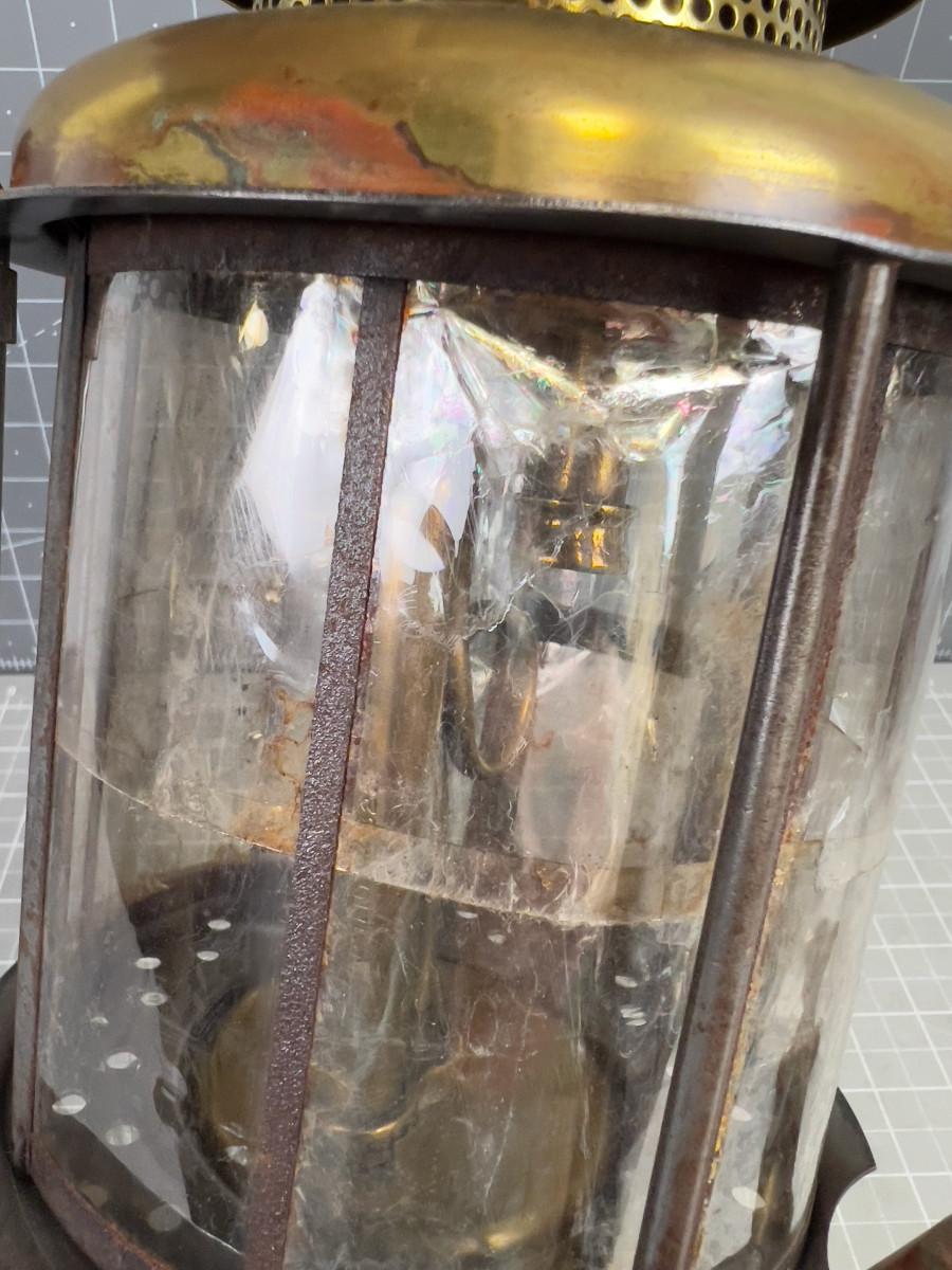 Awesome piece!!! Polished brass manufactured some time in the 1920's most likely, not sure if it’s the old mica lantern glass.