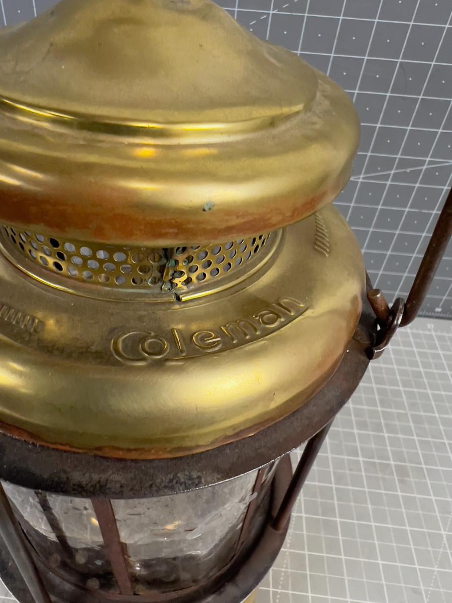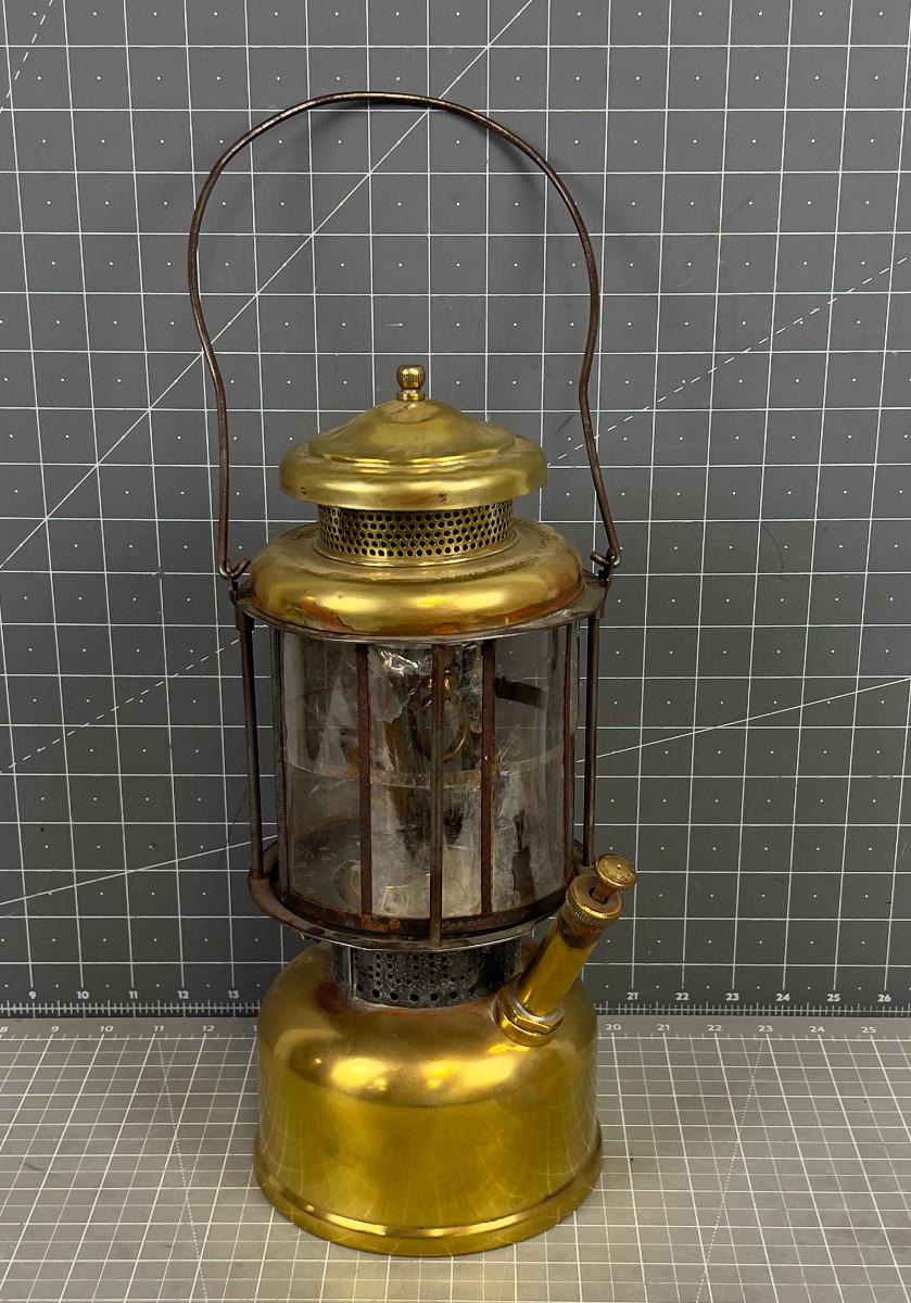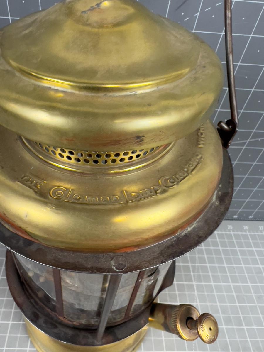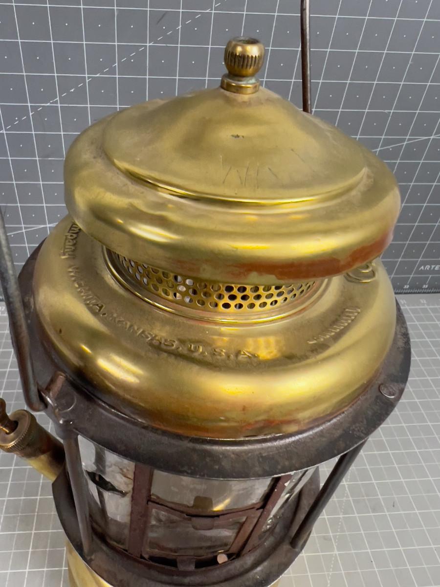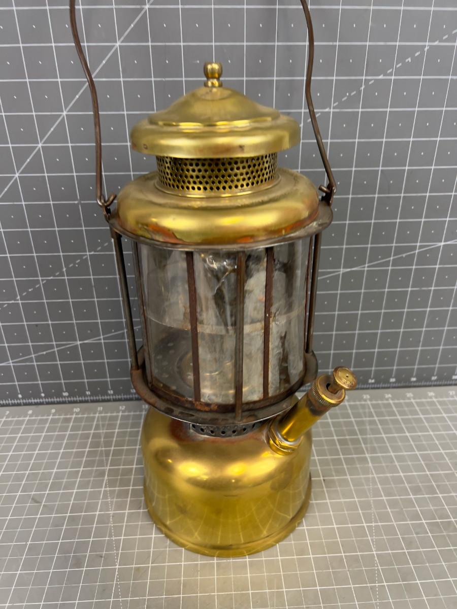 Awesome piece!!! Polished brass manufactured some time in the 1920's most likely, not sure if it’s the old mica lantern glass.