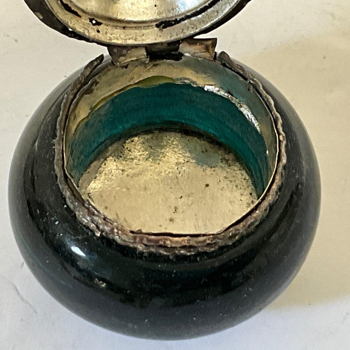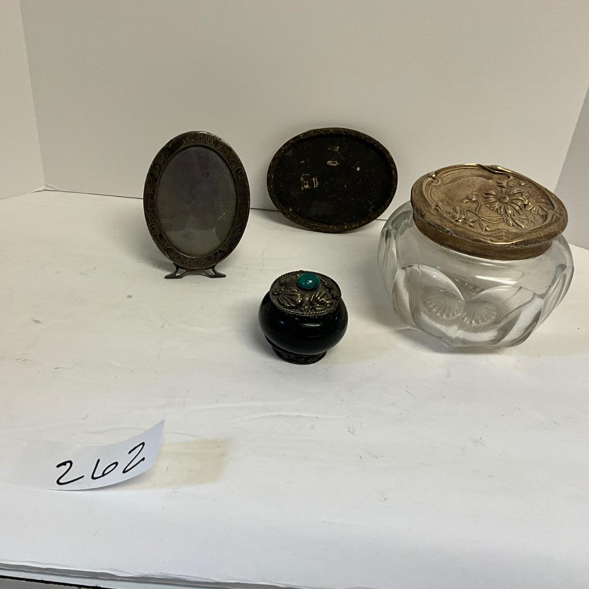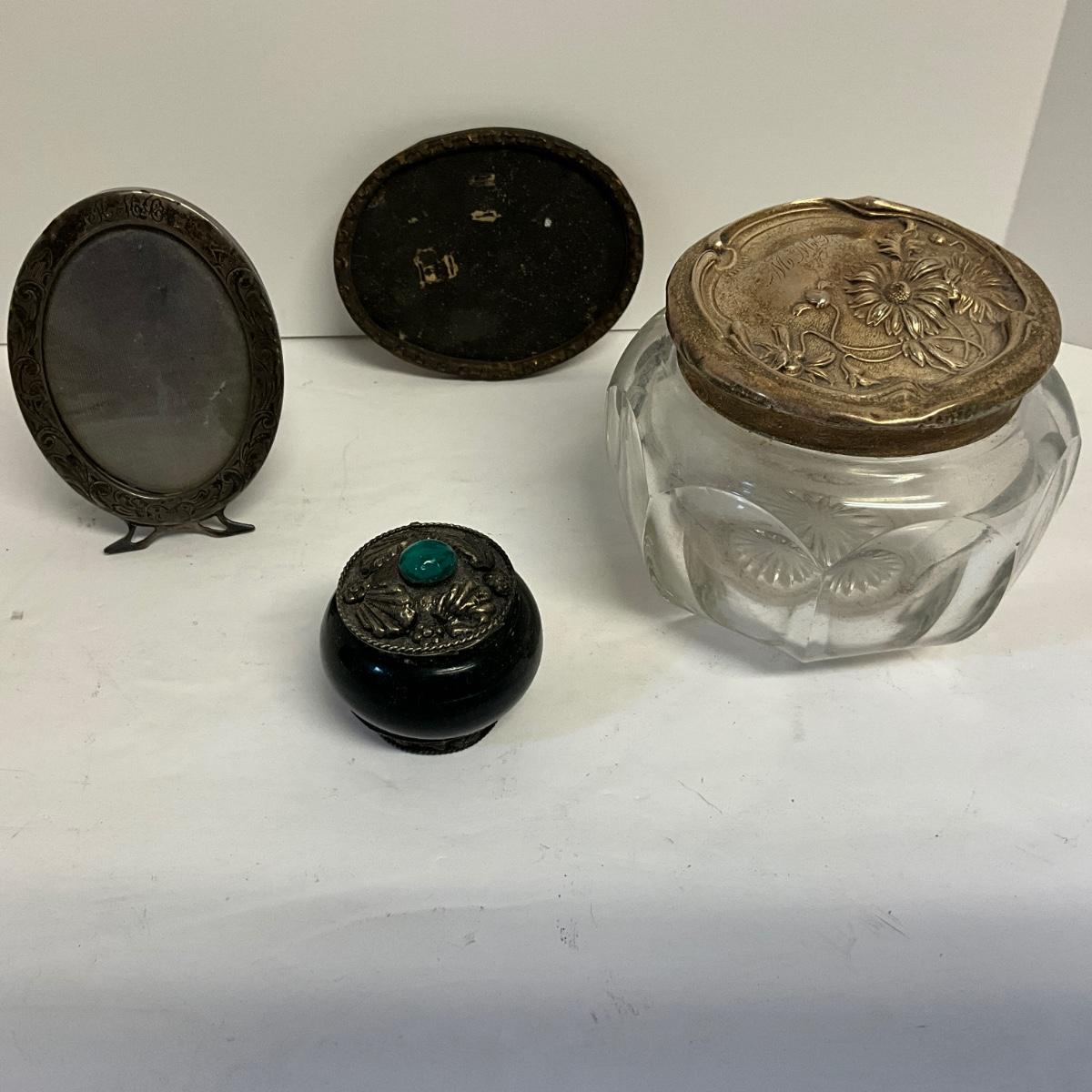 Antique Collectible, sterling silver lidded trinket box, sterling oval frame, brass frame, green glass trinket box with sterling lid as pictured