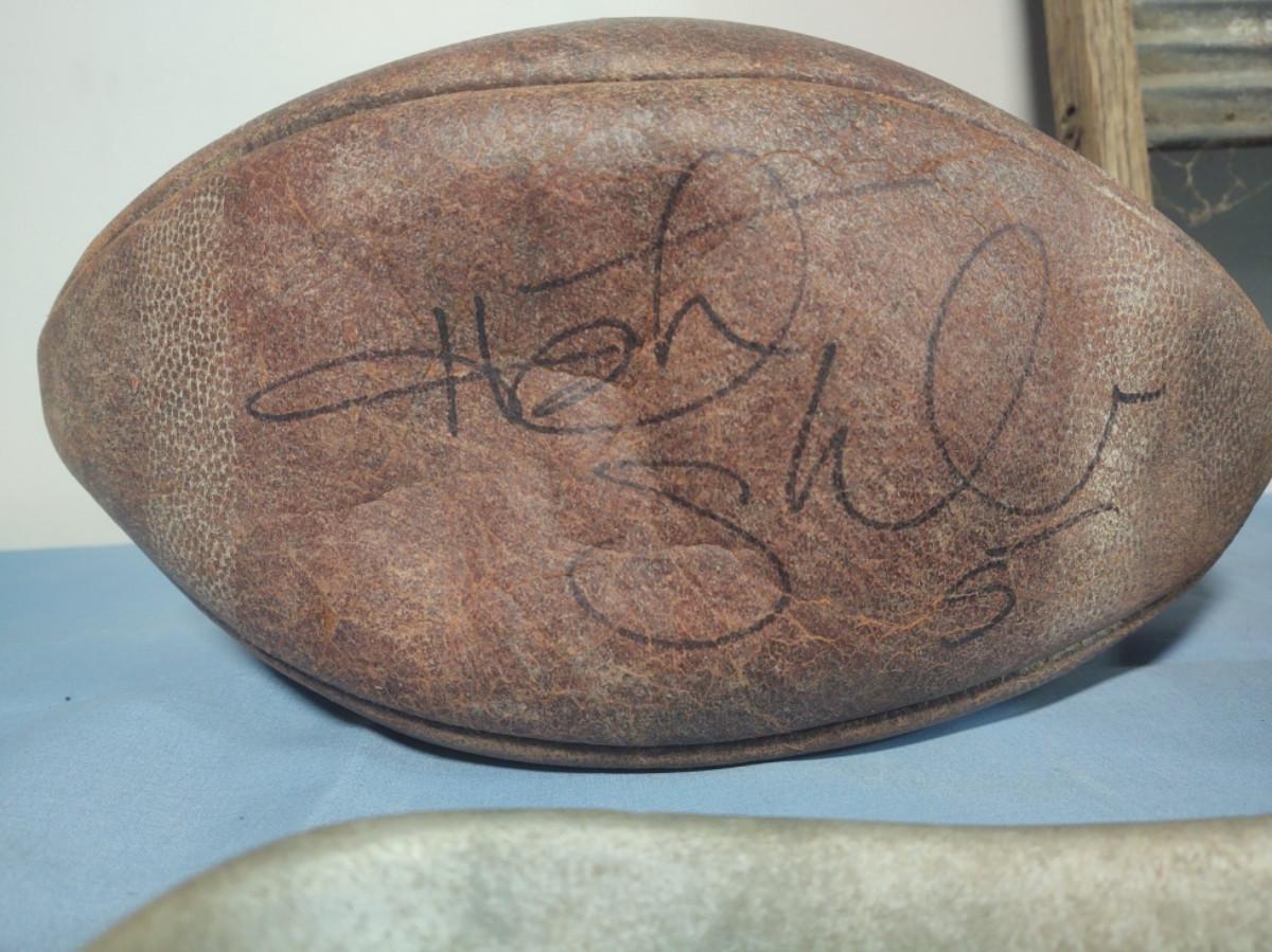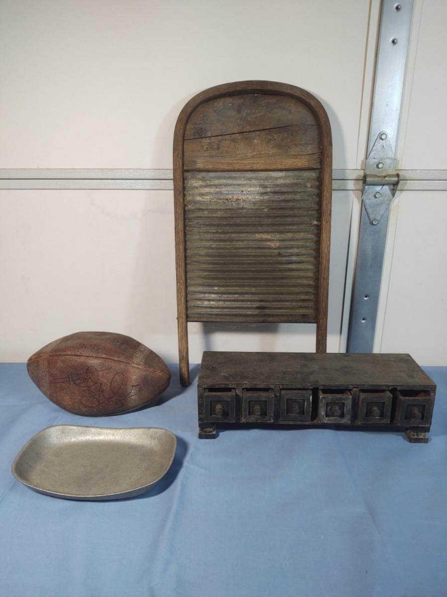 Washboard is very old. The print is faded, but parts of it are visible. The football appears to have Heath Shuler's autograph on it. See pictures for more details.