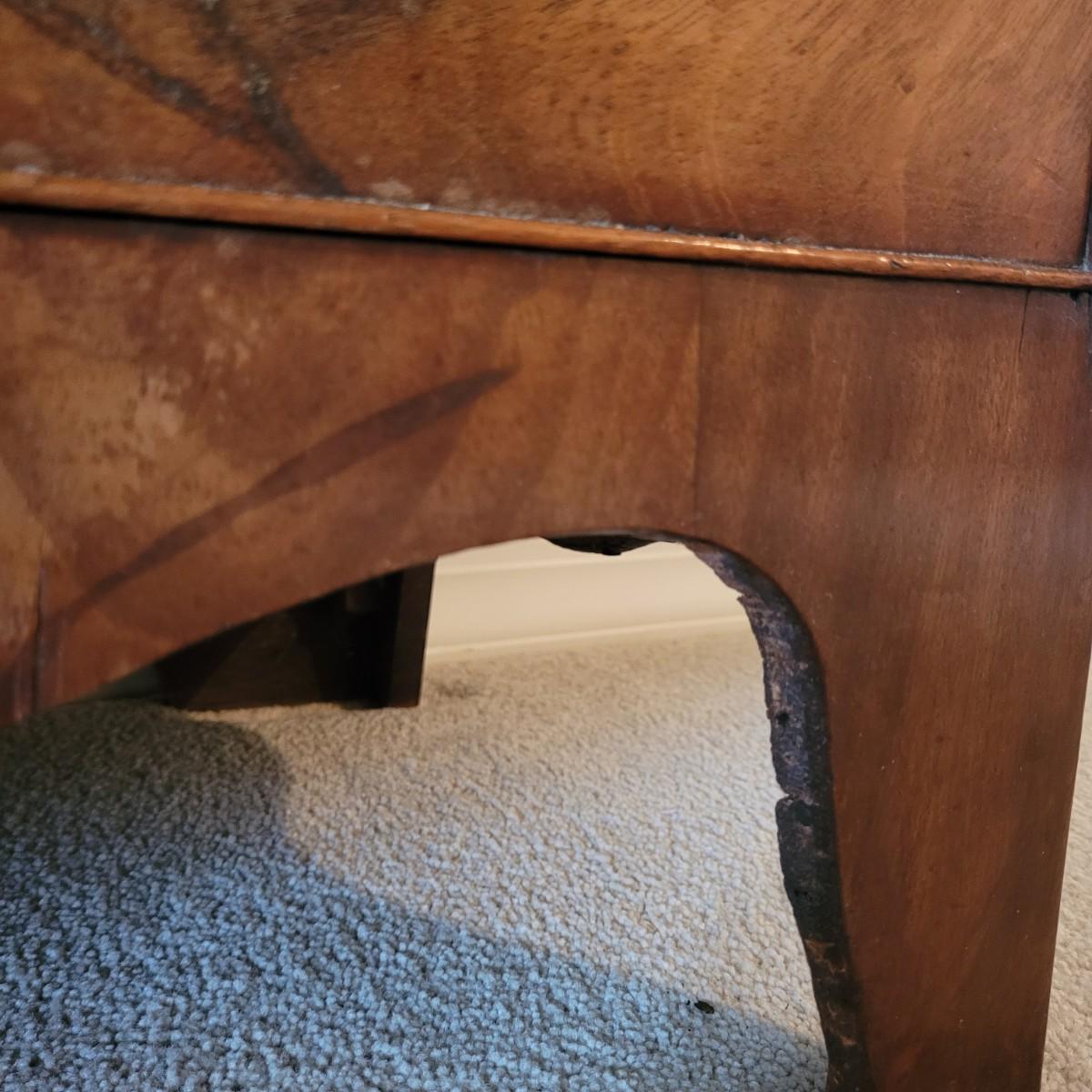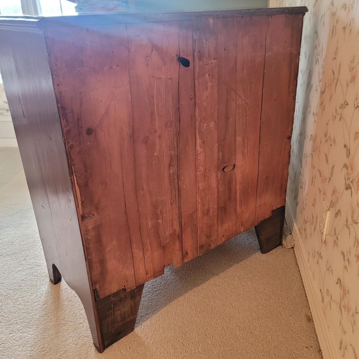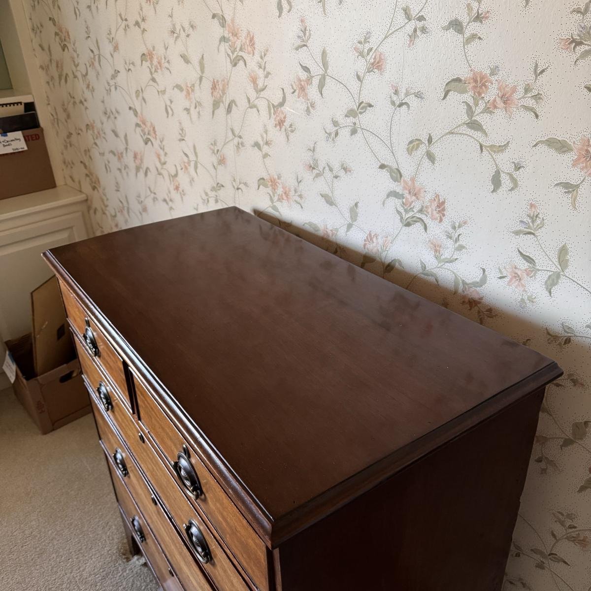 This stunning antique wooden five drawer chest has dovetail joint drawers and traditional style hardware. Measures approximately 37” x 19.5” x 38”H. Local pickup only. Winning bidder must bring assistance to help move and load this item due to its weight and size. Dresser is located up one flight of stairs.