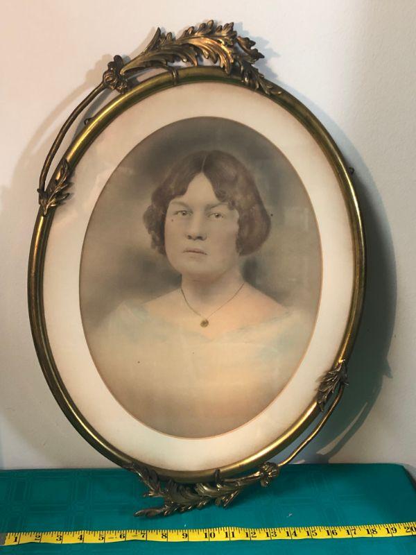 Antique photo of woman. Looks like it was colorized. Beautiful oval metal frame.