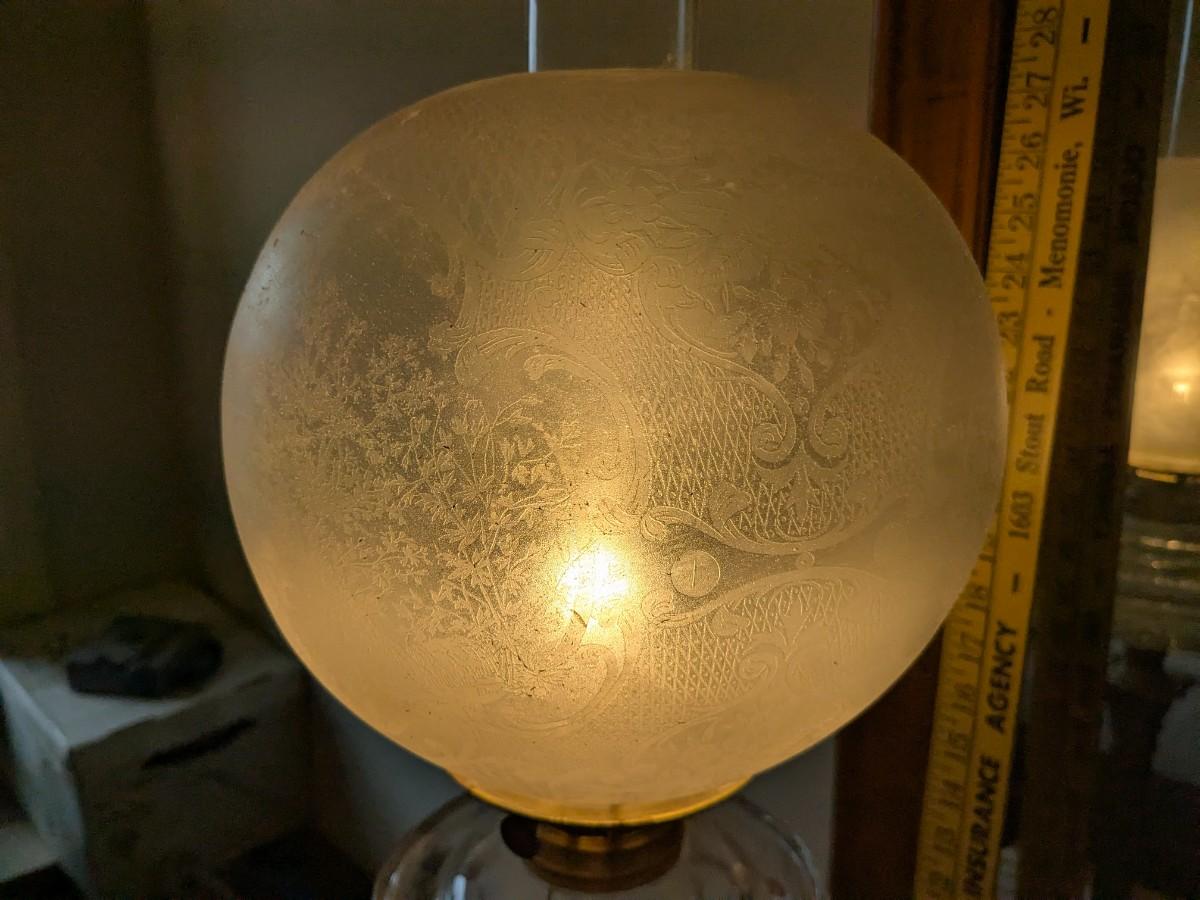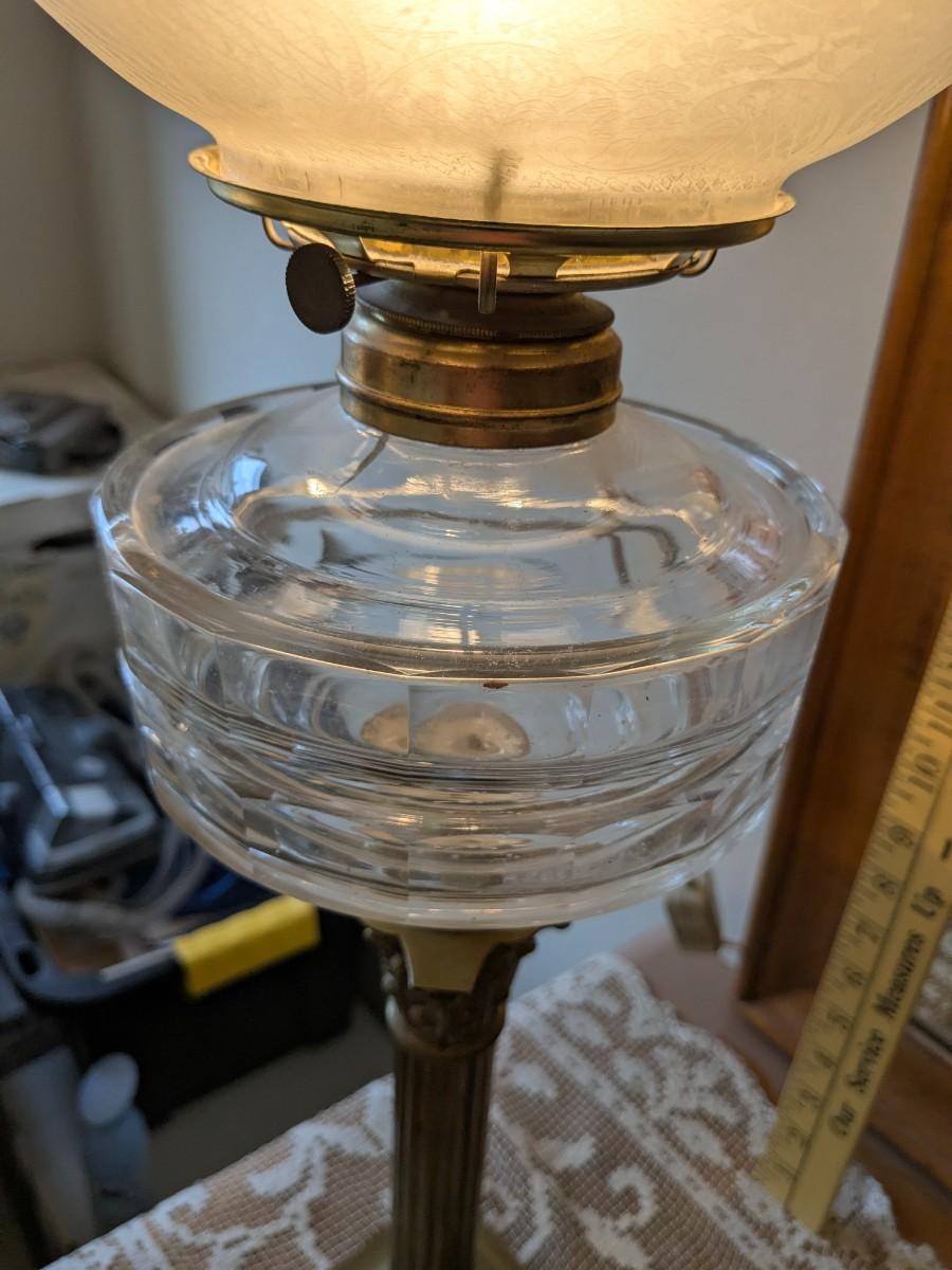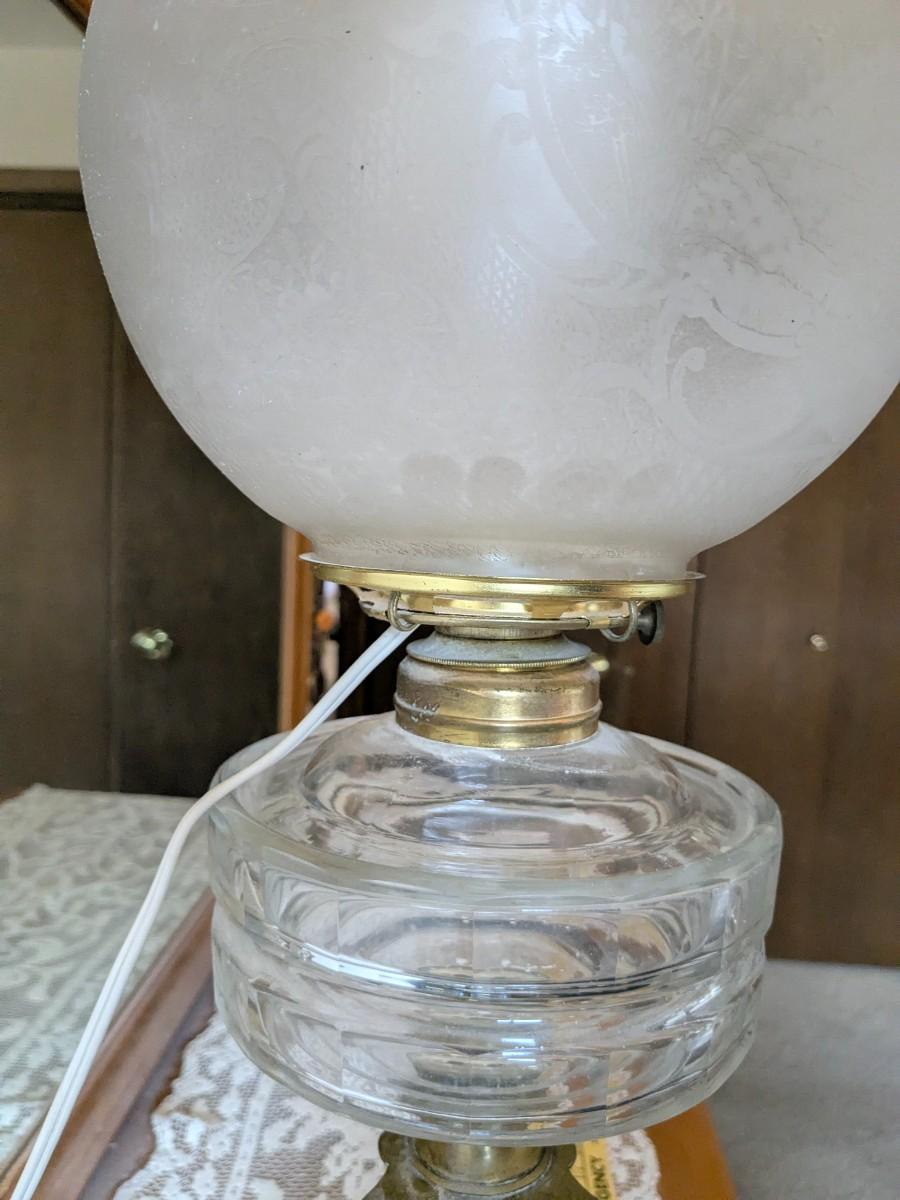 Antique Converted Oil Lamp-Electric Duplex Ribbed Glass Font Acid Etched Shade L&B Burner