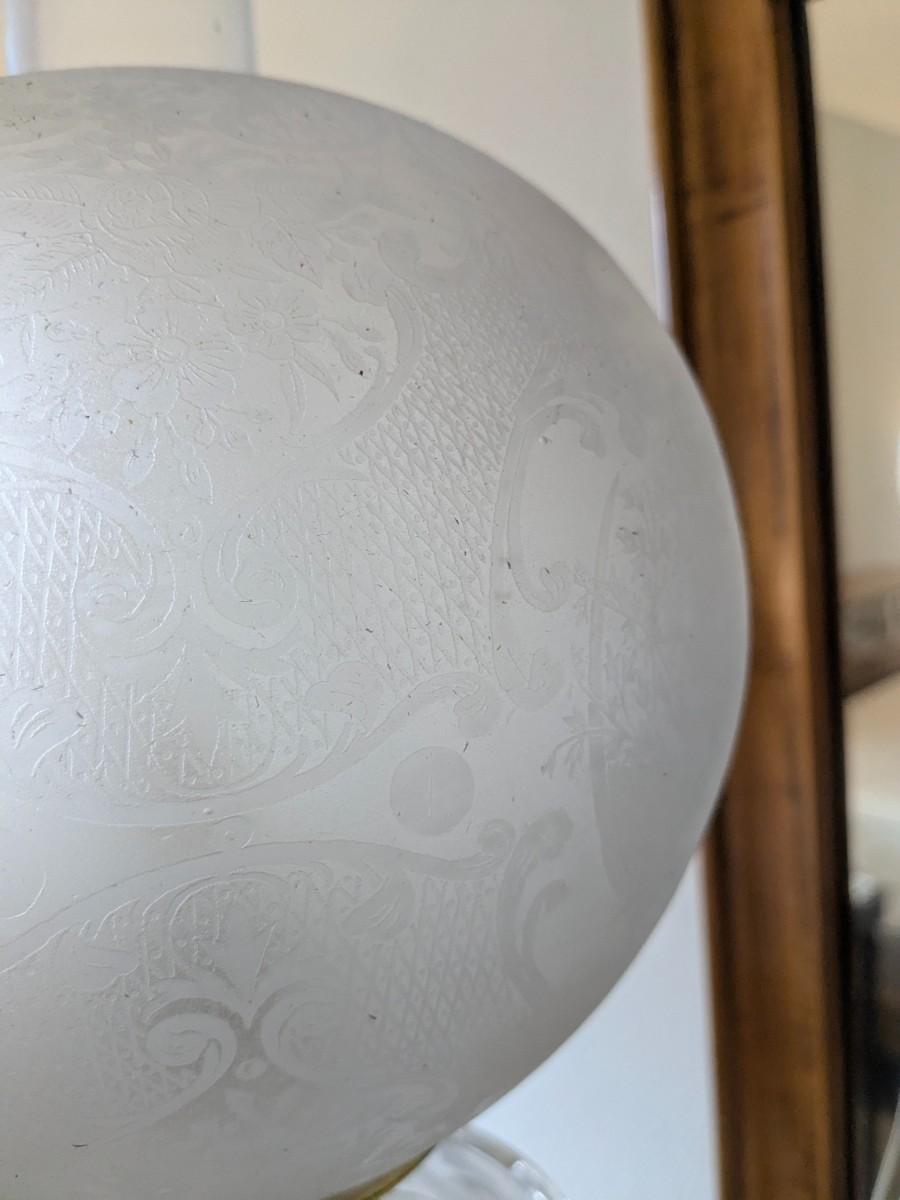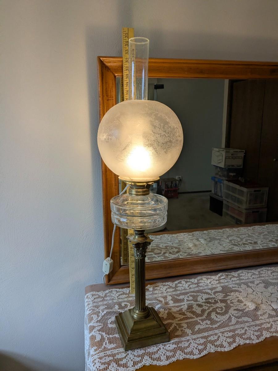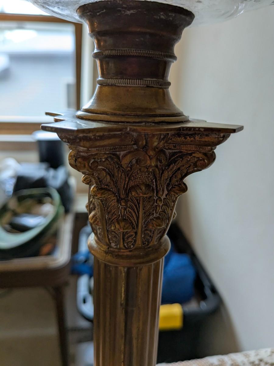 Antique Converted Oil Lamp-Electric Duplex Ribbed Glass Font Acid Etched Shade L&B Burner