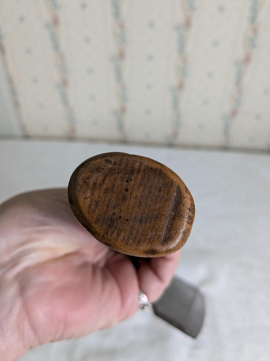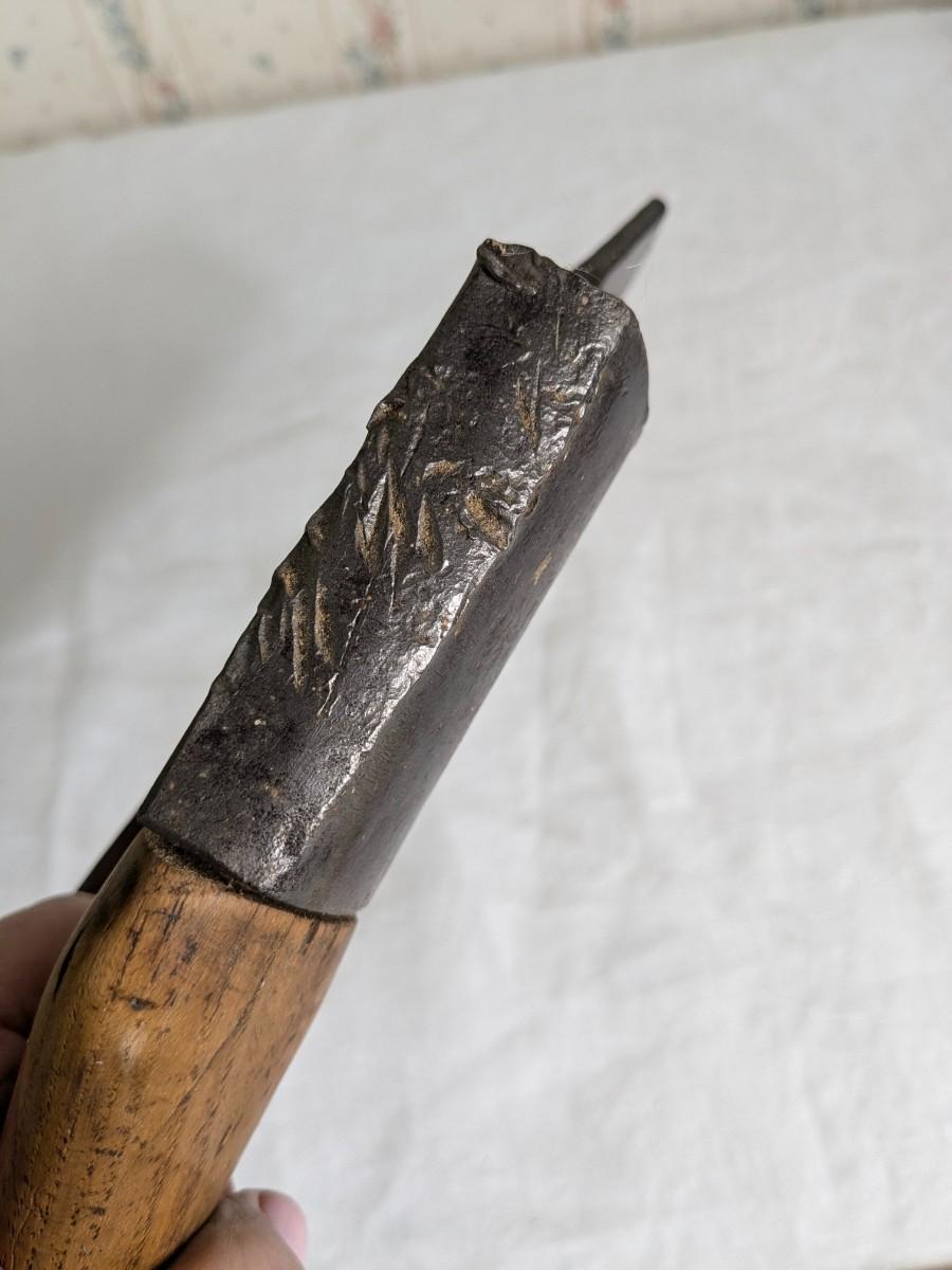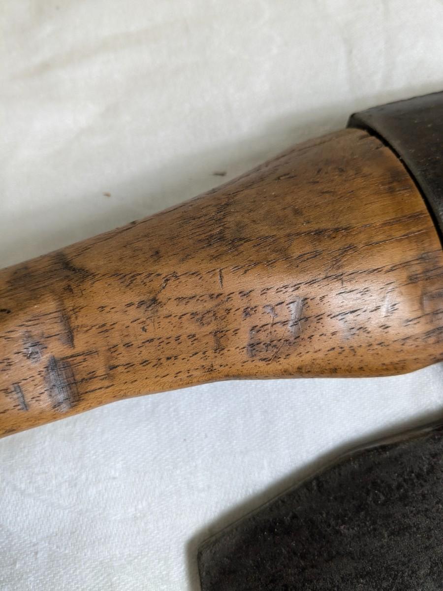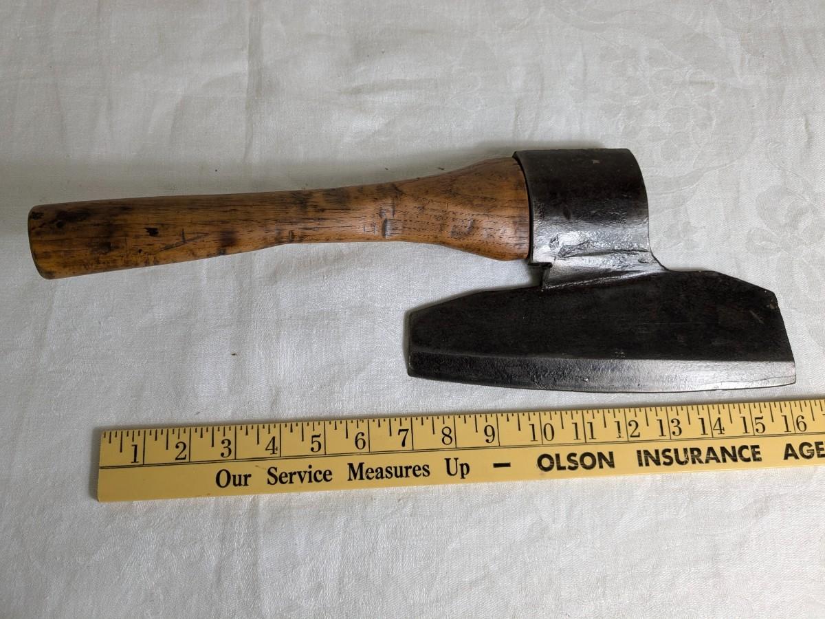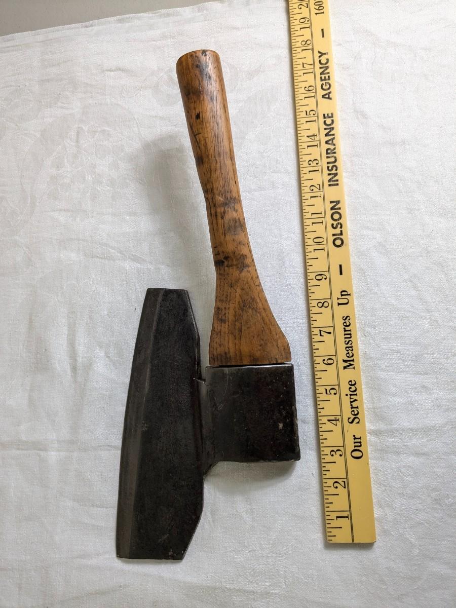 A good sized cooper's axe with an edge sharpened on one side only. Used for trimming the end of the staves for a barrel. The iron head and handle is offset to clear the knuckles when cutting and also angled downward instead of being parallel to the cutting edge.