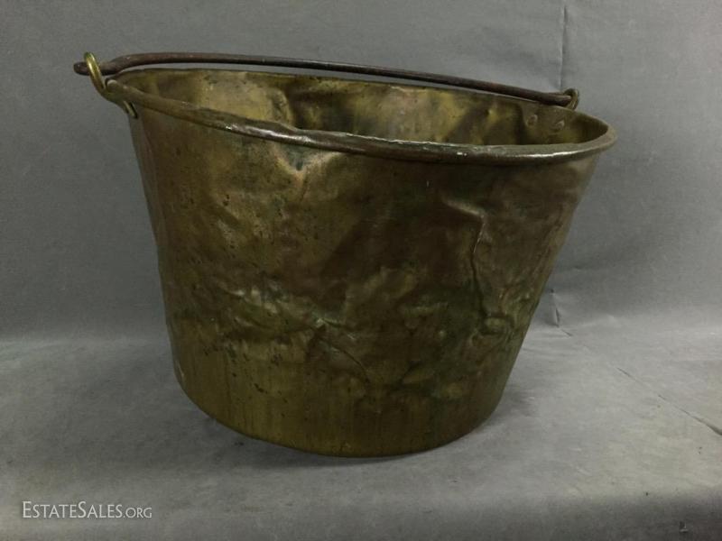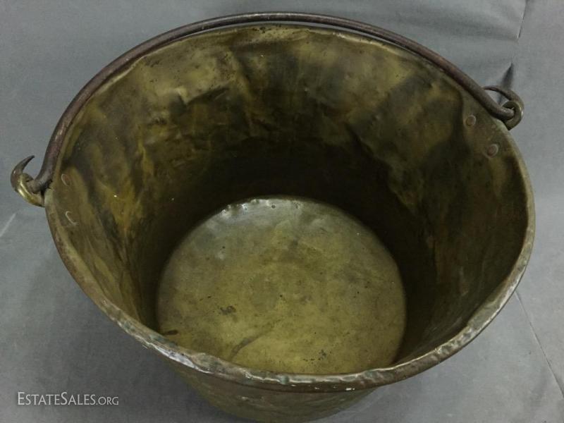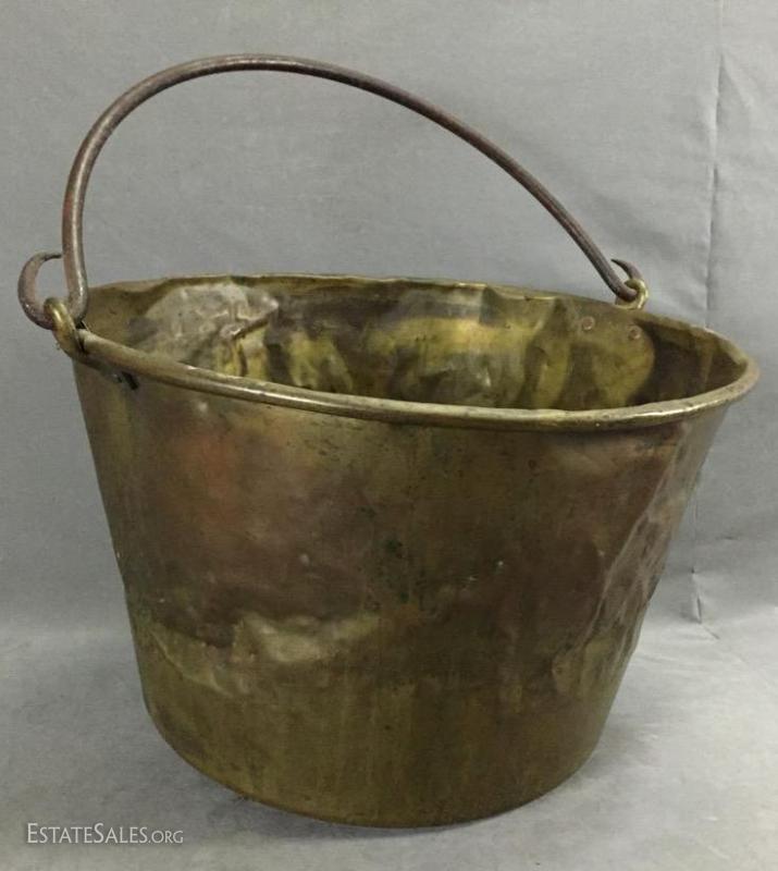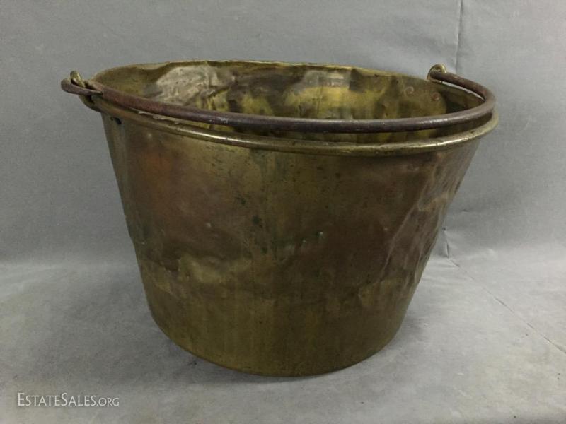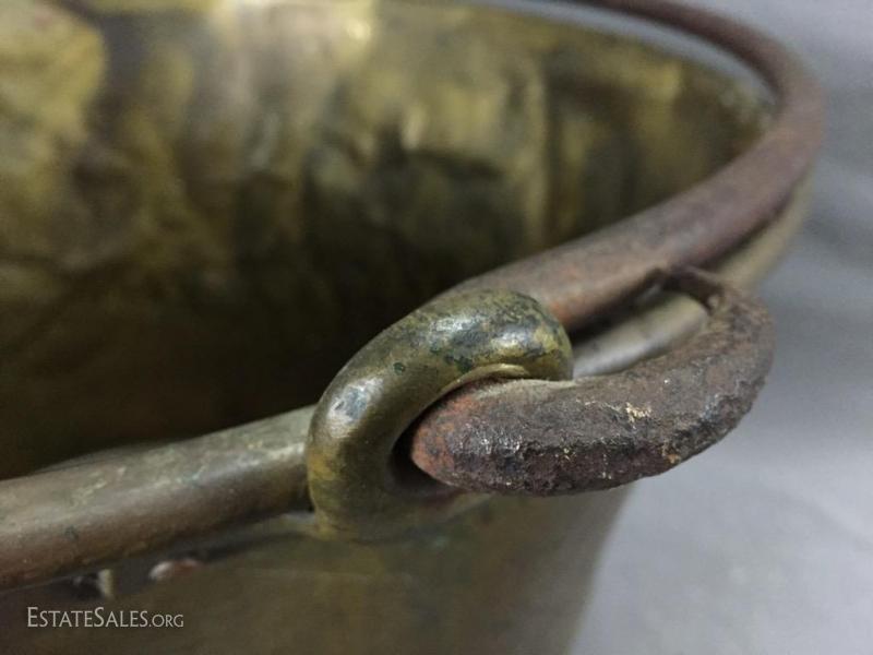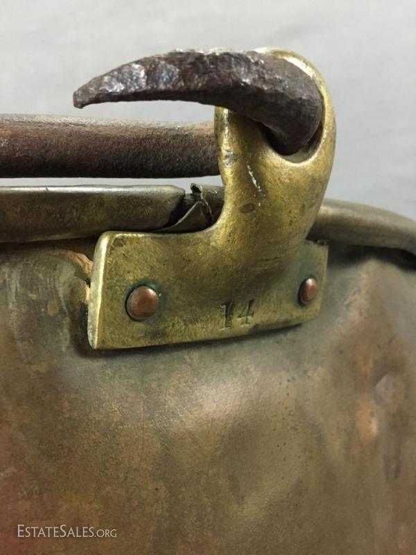 Antique Copper apple butter cauldron/ kettle w/ hand-wrought iron handle, marked on bottom. 14" tall (without handle), 25" tall (including handle).