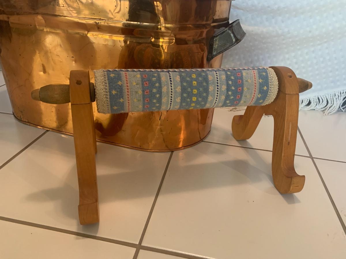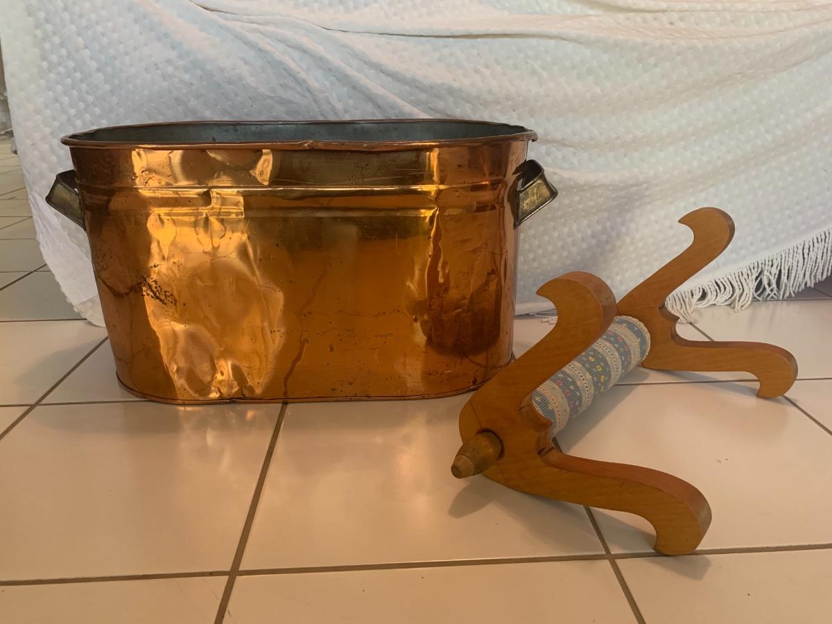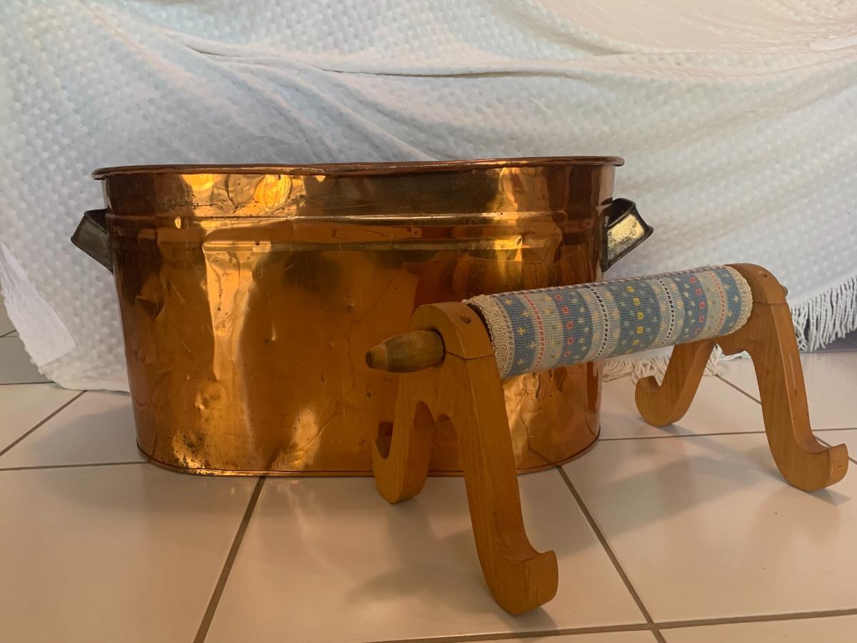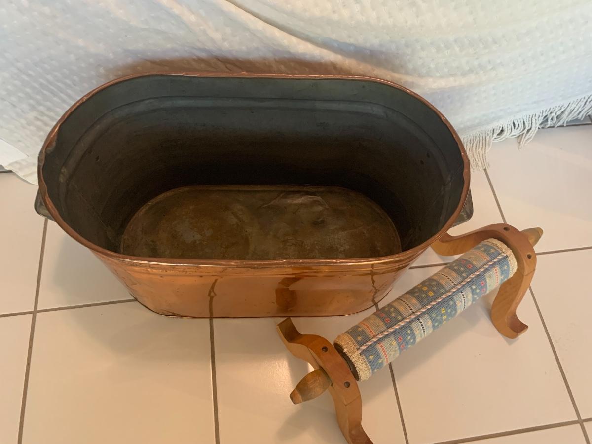 Antique Copper Bin and Wood/Needle Point Foot Rest