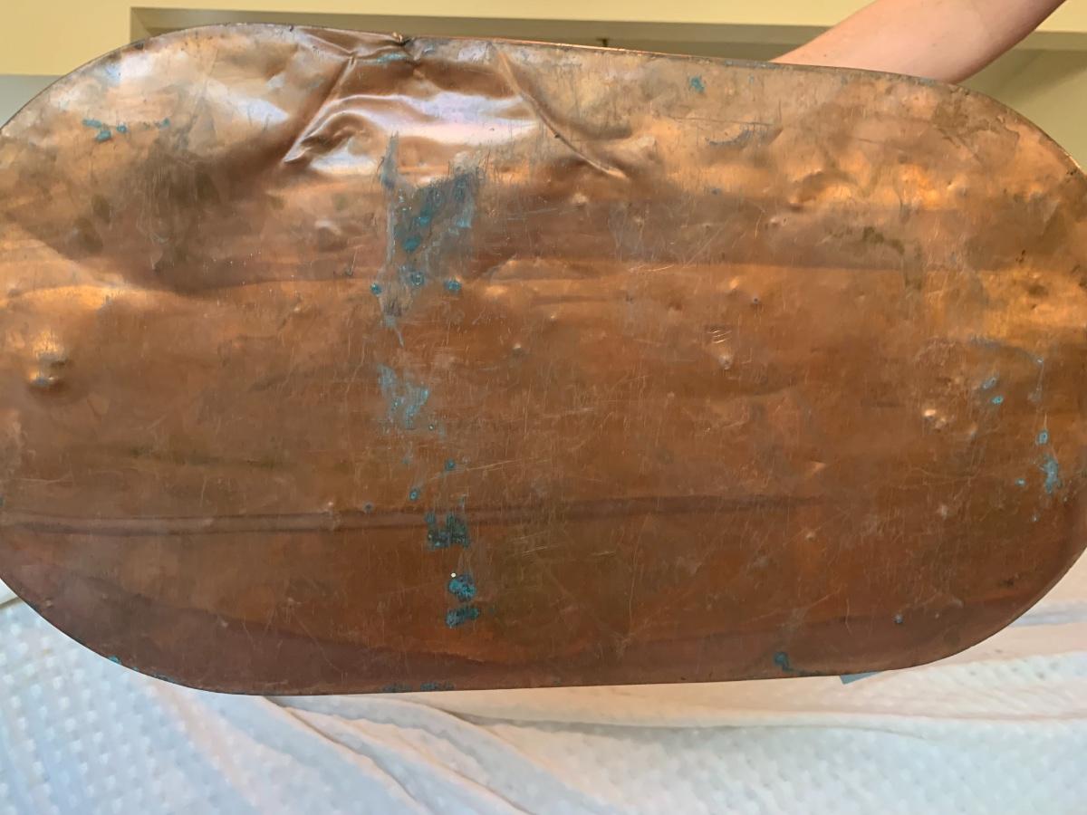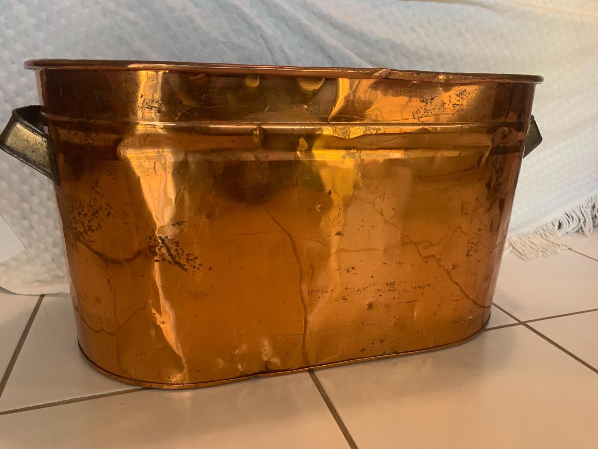 Copper bin is in fair condition with dents and patina. Foot Rest is in good condition.