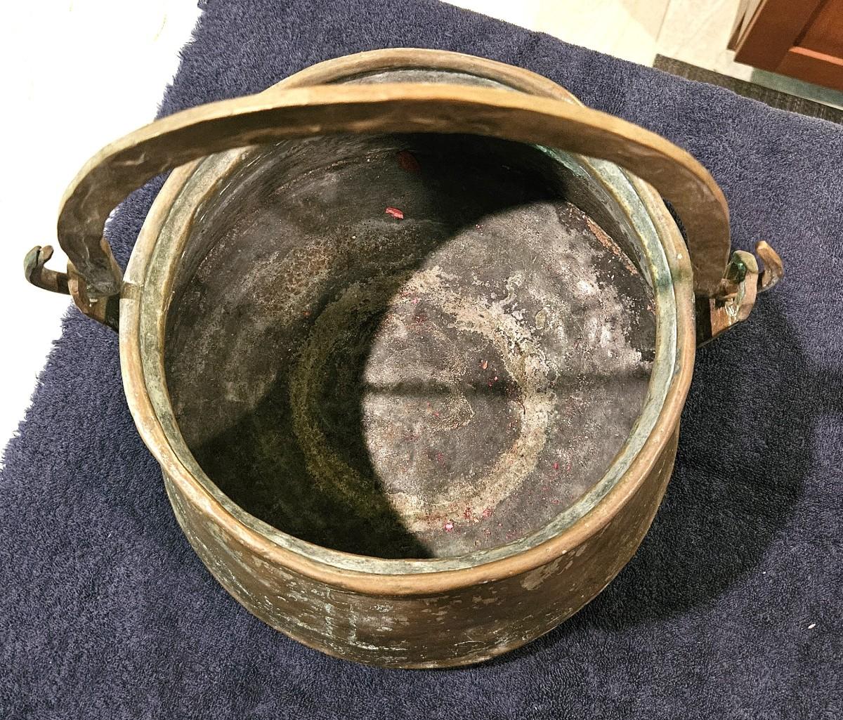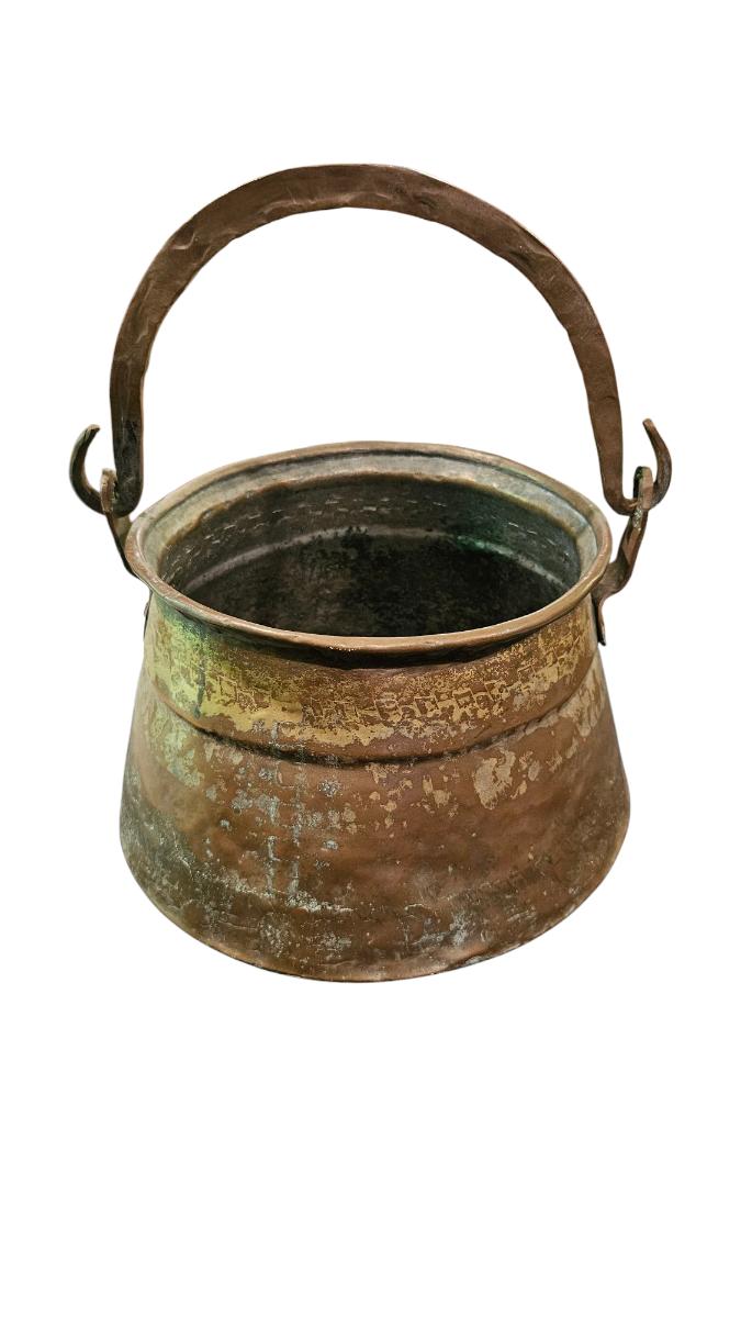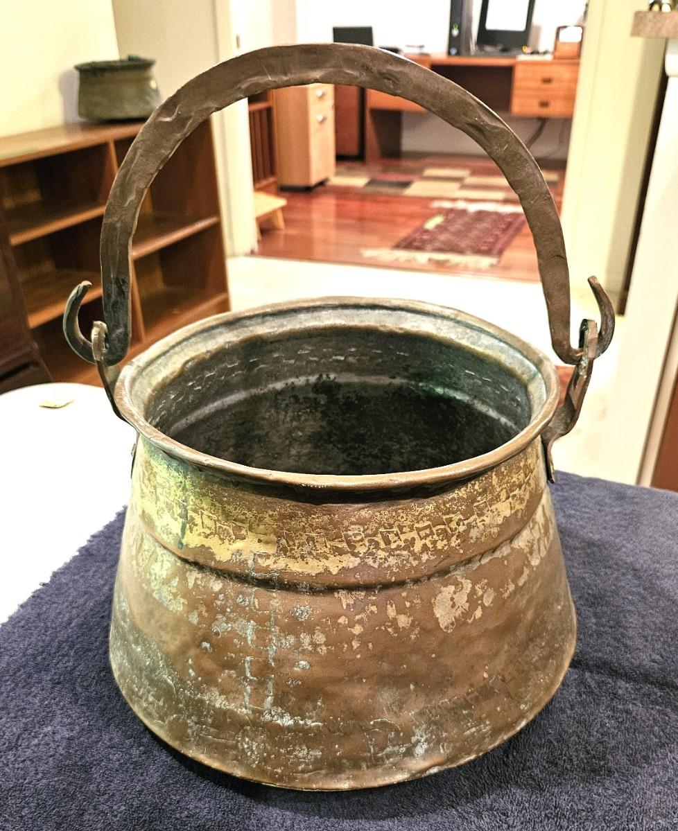 Antique Brass Cauldron with a Wrought Iron Handle