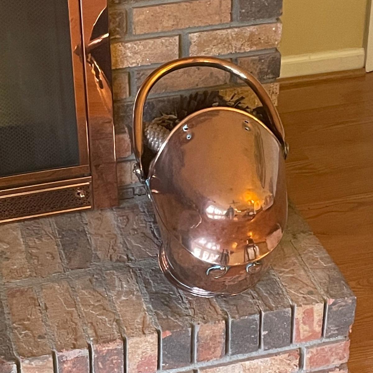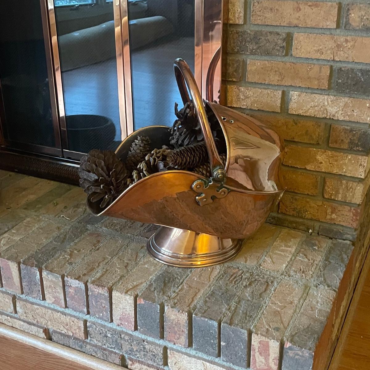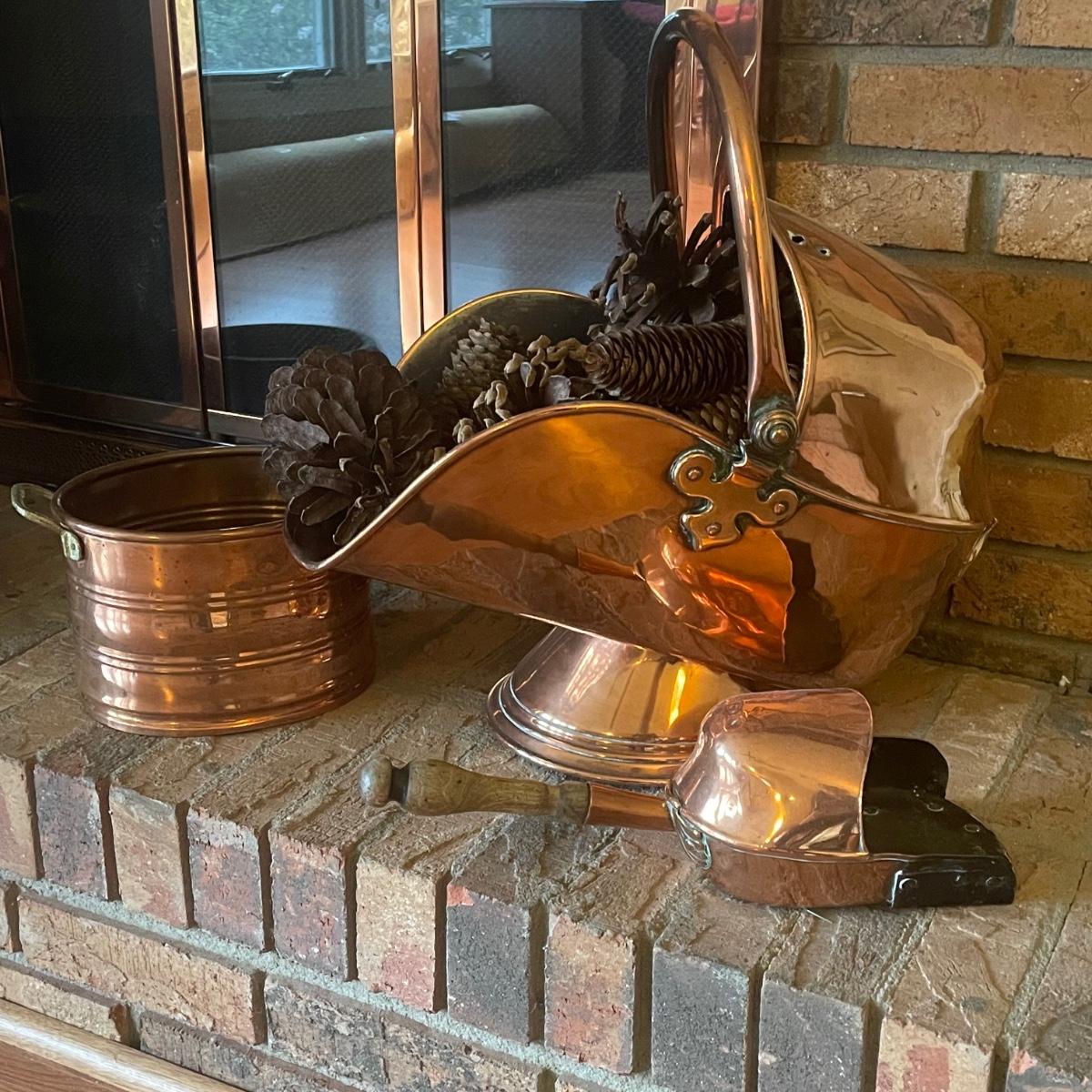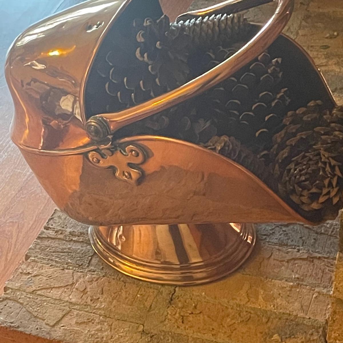 These three items are all copper; small bucket has brass handles and scoop has a wooden handle. The coal bucket has a loose piece of metal on its base and a couple of holes on the top but otherwise all items are in great condition. Pine cones are included.